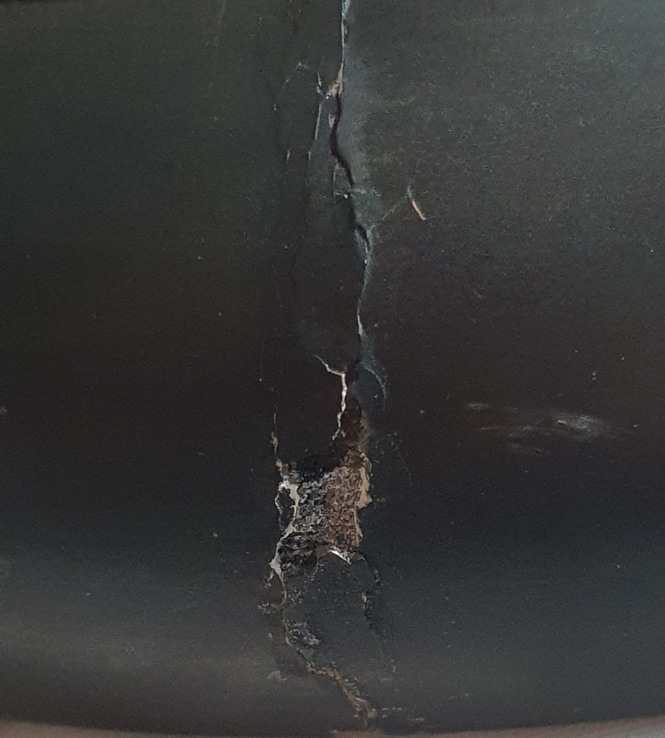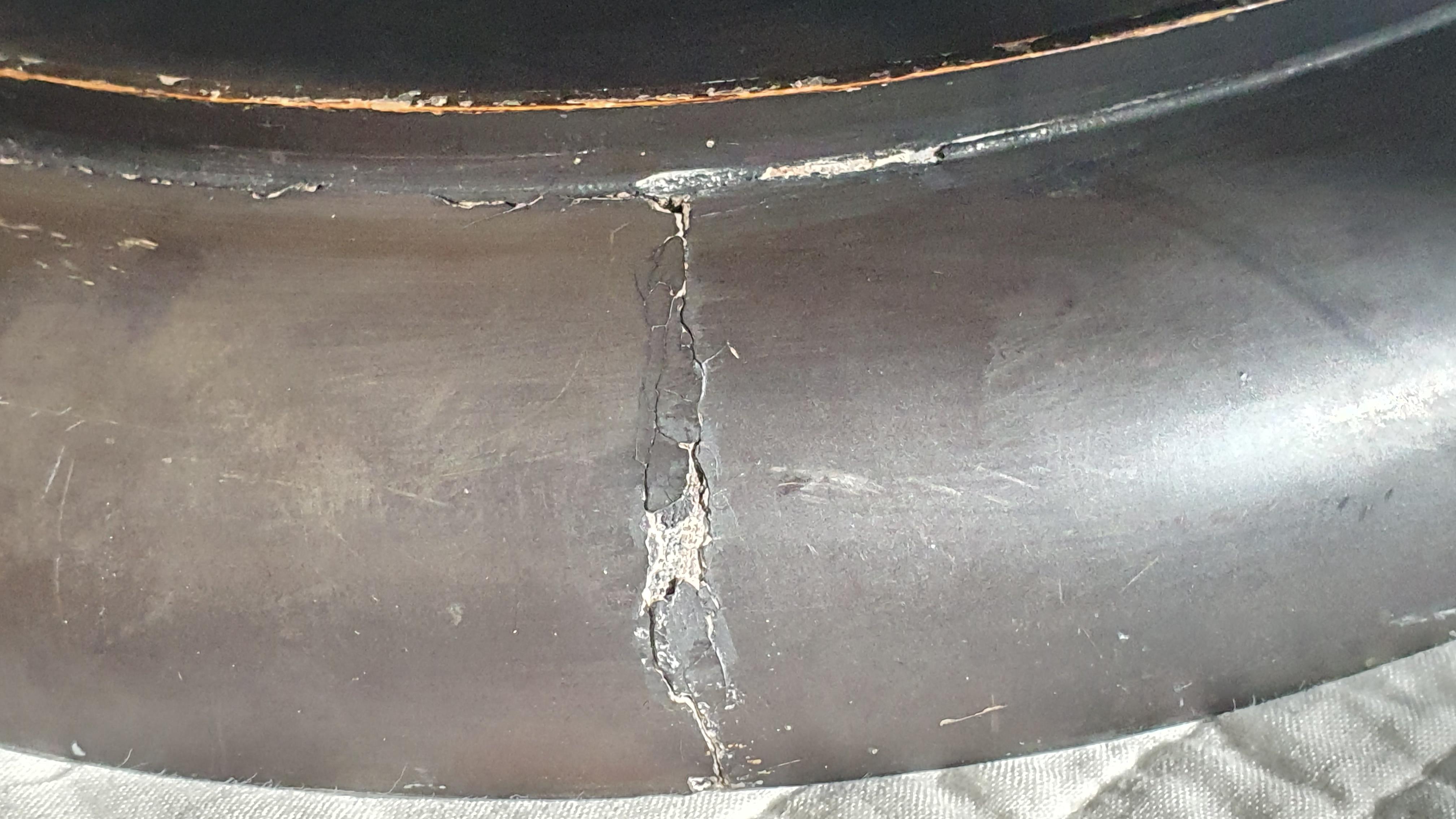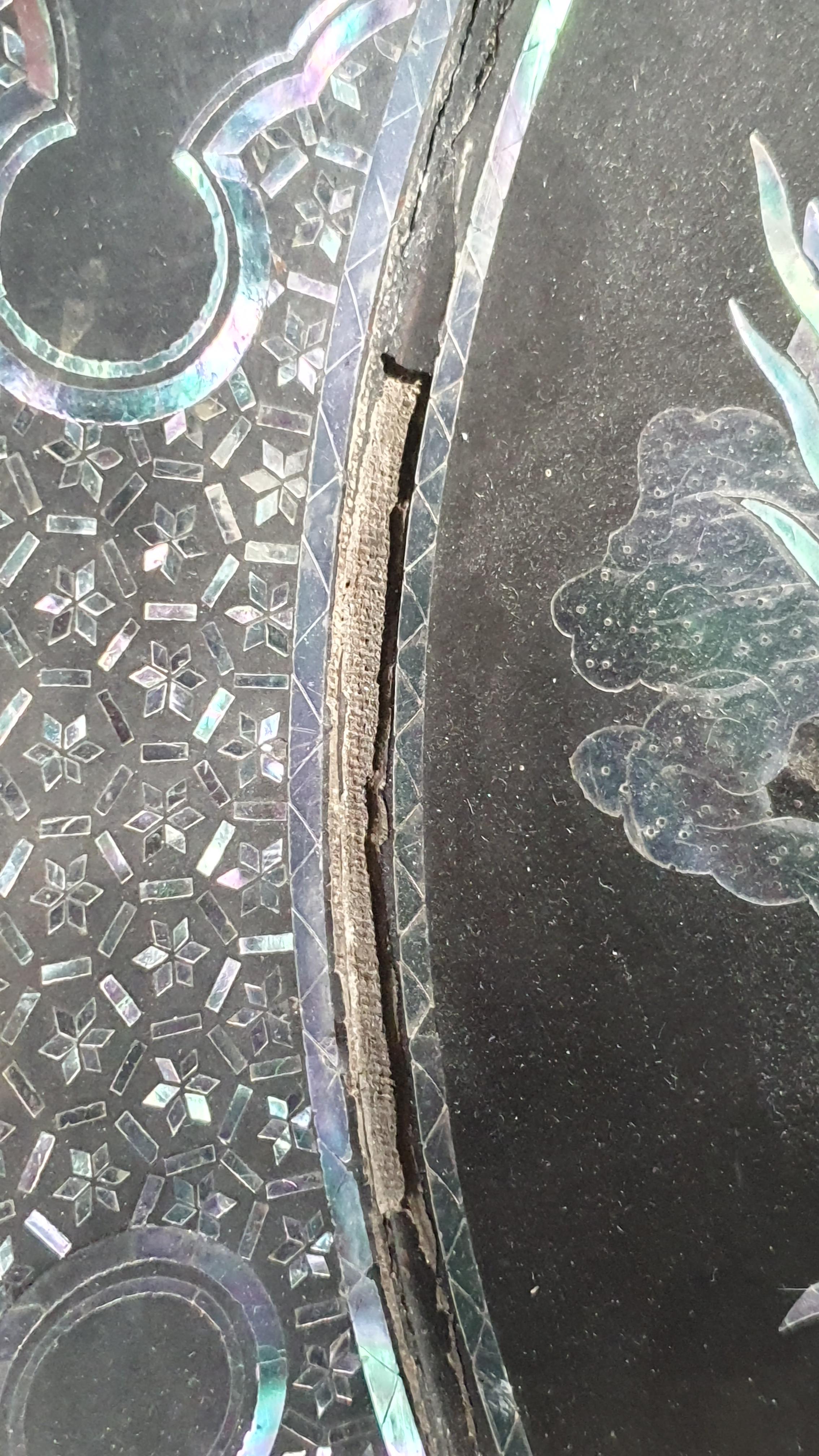 A lot of the mother-of-pearl inlay is missing as you can see and there is damage around the inner rim as well as the parallel cracks to the outer. More nibbles here and there.