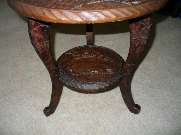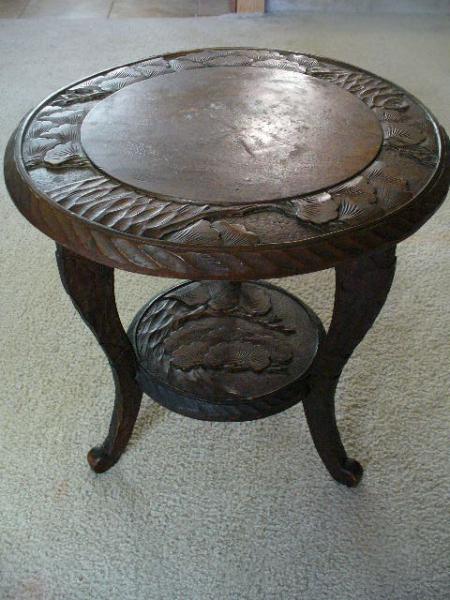 I don't know anything about this table, other than it is beautiful and well made. It appears to have Japanese-style foilage on the trees and an asian makers-mark incorporated in the wood-carving. The numbers "789" are on the bottom of both flat pieces, and the carving is detailed all the way around the legs from top to bottom. There is some sign of wear and usage on the table-top itself, but otherwise seems to be in great shape. Any info about this would be greatly appreciated.