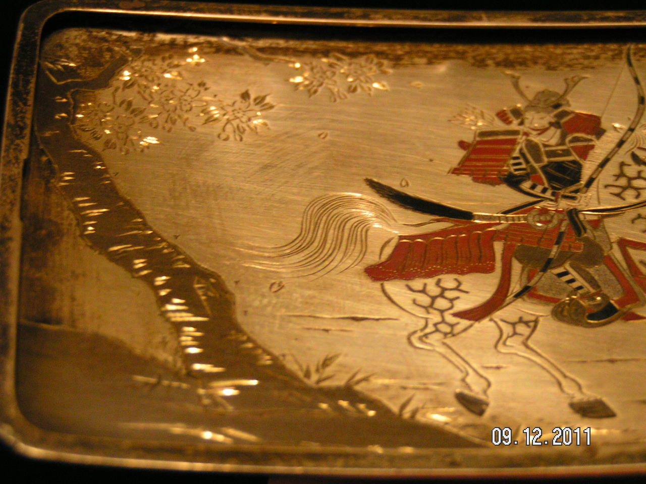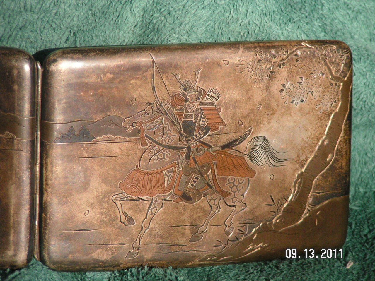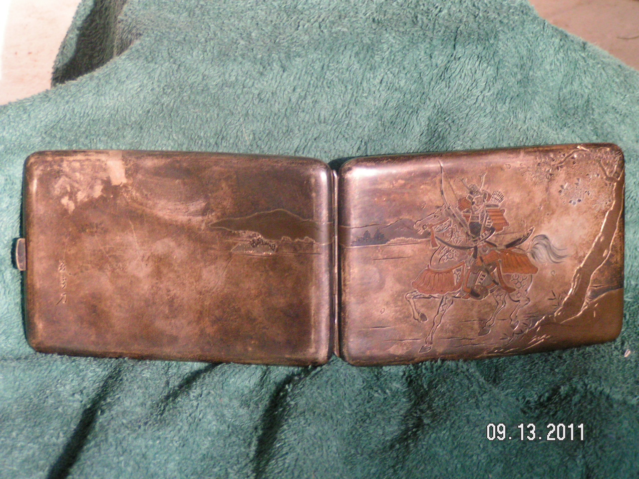 Probably early 1900's, Japanese, Damascene, silver 950, cigarette case depicting a Samurai & his horse (Chief going to battle?). ~ Gold gilding. ~ Shakudo(?) coloring; blue patina. ~ Etched, mirror-image scene inside & out. ~ 3 marks on the back. ~ Secure clasp.