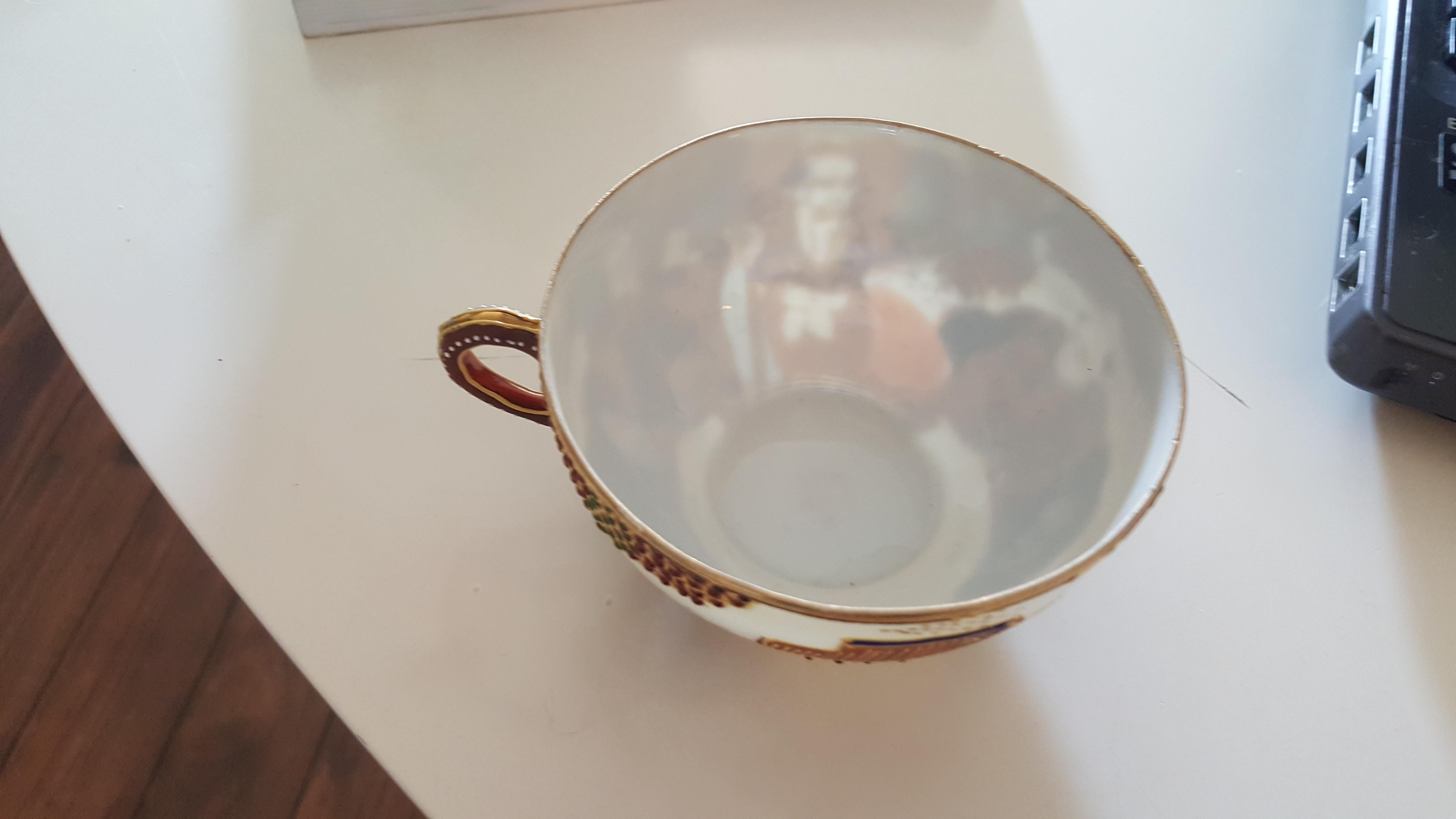Beautiful hand painted japanese tea cup i found at a flea market. It has gold/mirroreffect and many details. Im just wondering if anyone has seen somthing similar and how much it might be worth..
