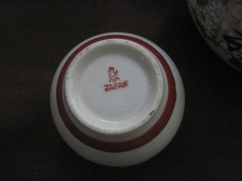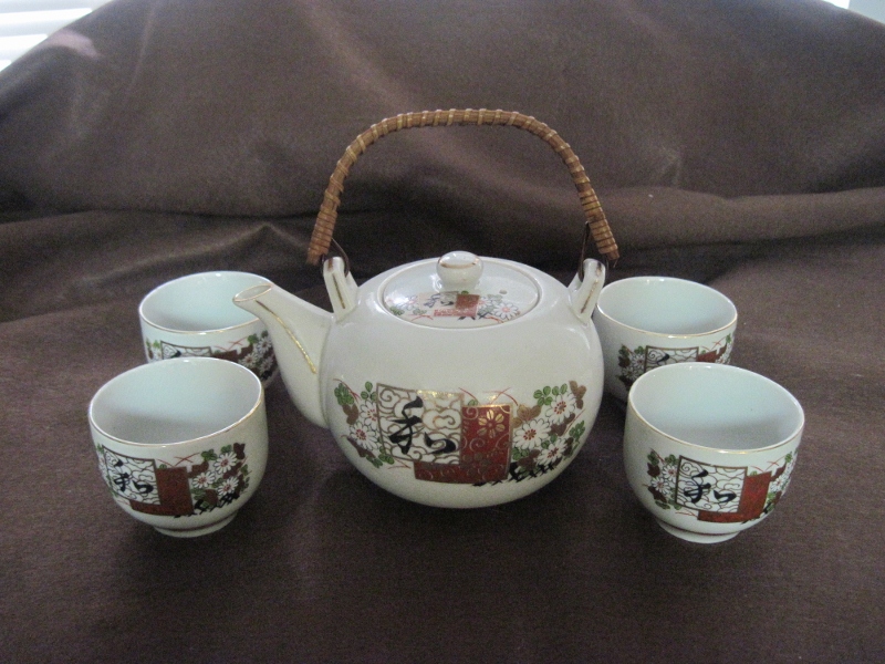 5 cup and tea pot. Gold trim and red Japan marking