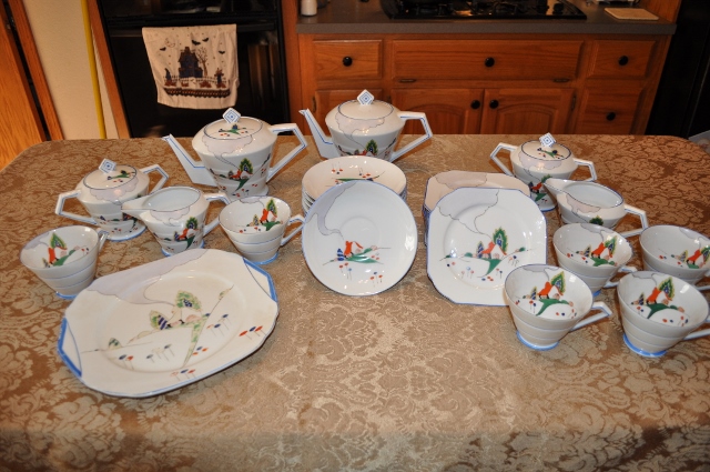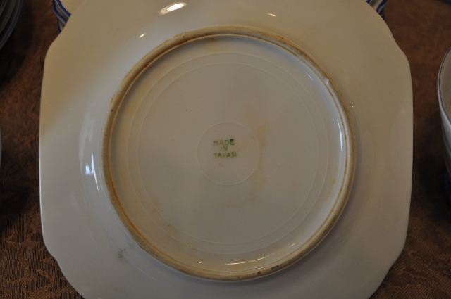 This tea set is unusual in that it has two pots, two creamers, two sugars, 10 saucers, 10 sandwich plates, one large serving plate and only 6 cups left. The only mark on the back is "Made in Japan" in green. The picture is of a house on a hill surrounded by evergreen trees, perhaps a poppy field in the foreground and what looks like a tornado above it, although it may have just meant to be a cloud. I live in Oklahoma so it looks like a tornado to me. The colors are very pale white that looks a bit blue, cobalt trim and reds, oranges and greens on the design. There are a few chips on 2 or 3 plates and I think on 2 of the cups. Most of it is in very good condition. The serving plate must have been used quite a bit as it is much more faded than the other pieces. I purchased this in 1985 from the estate sale of one of my Sunday School teachers in Texas. She was probably in her 90s when she passed. She was a wealthy and well traveled woman. I have no idea how or when she purchased this tea set. I would love to know as much about this as I can.