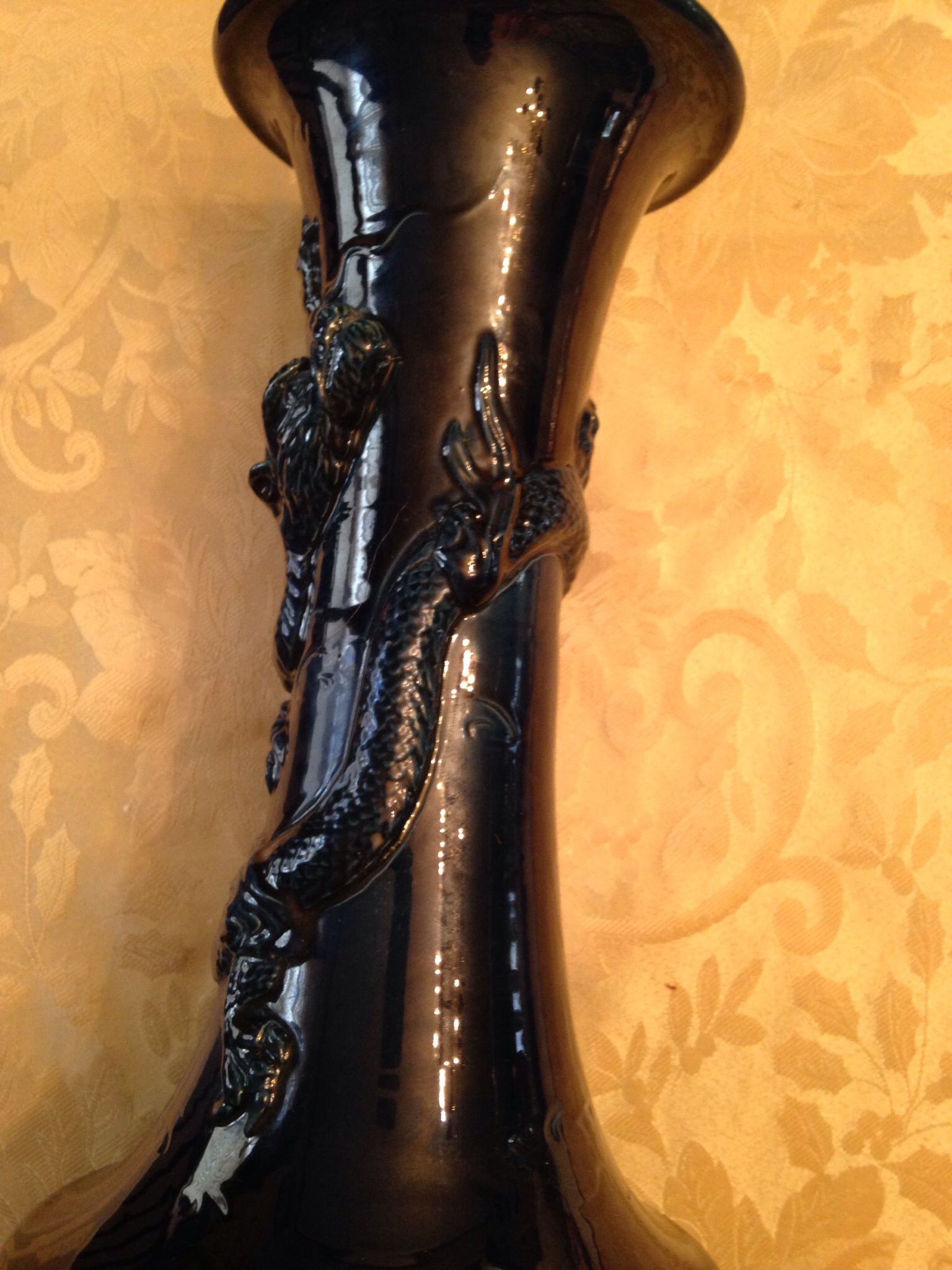 This is a blue vase that's been in my family for about 40 years. The vase says made in Japan on the bottom. There is a raised dragon that goes around the body of the vase. I was told that it's an antique and was purchased for about 50 dollars in the 1970's. The vase is about 18-24 inches long and appears hand painted.
