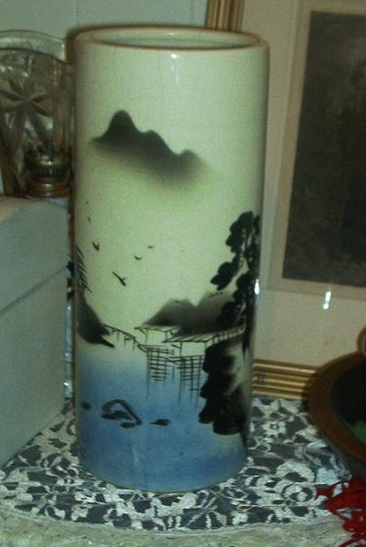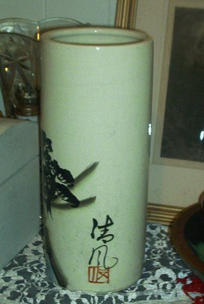 Very old vase hand painted with blacks and blue glazings, vase is yellow color with a clear glazing over the clay. It is signed by artist and is a Japanese signature I guess. N mark in signature. No marks on bottom of vase. There are some hairlines where the clay separated from age and also crazing on the vase. Thanks