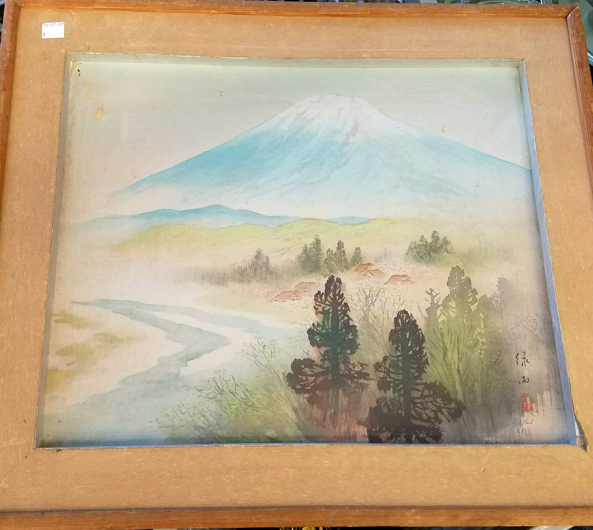Japanese woodblock painting of Mount Fuji. Unknown year or artist. We found this in a thrift shop and are truly curious as to its age. We are thinking it's early 20th century, maybe 30's? But we have no idea. I'm hoping the markings and signature can shed some light on this. Since we do not speak nor read Japanese we are at a dead end. Thanks in advance! Paul.