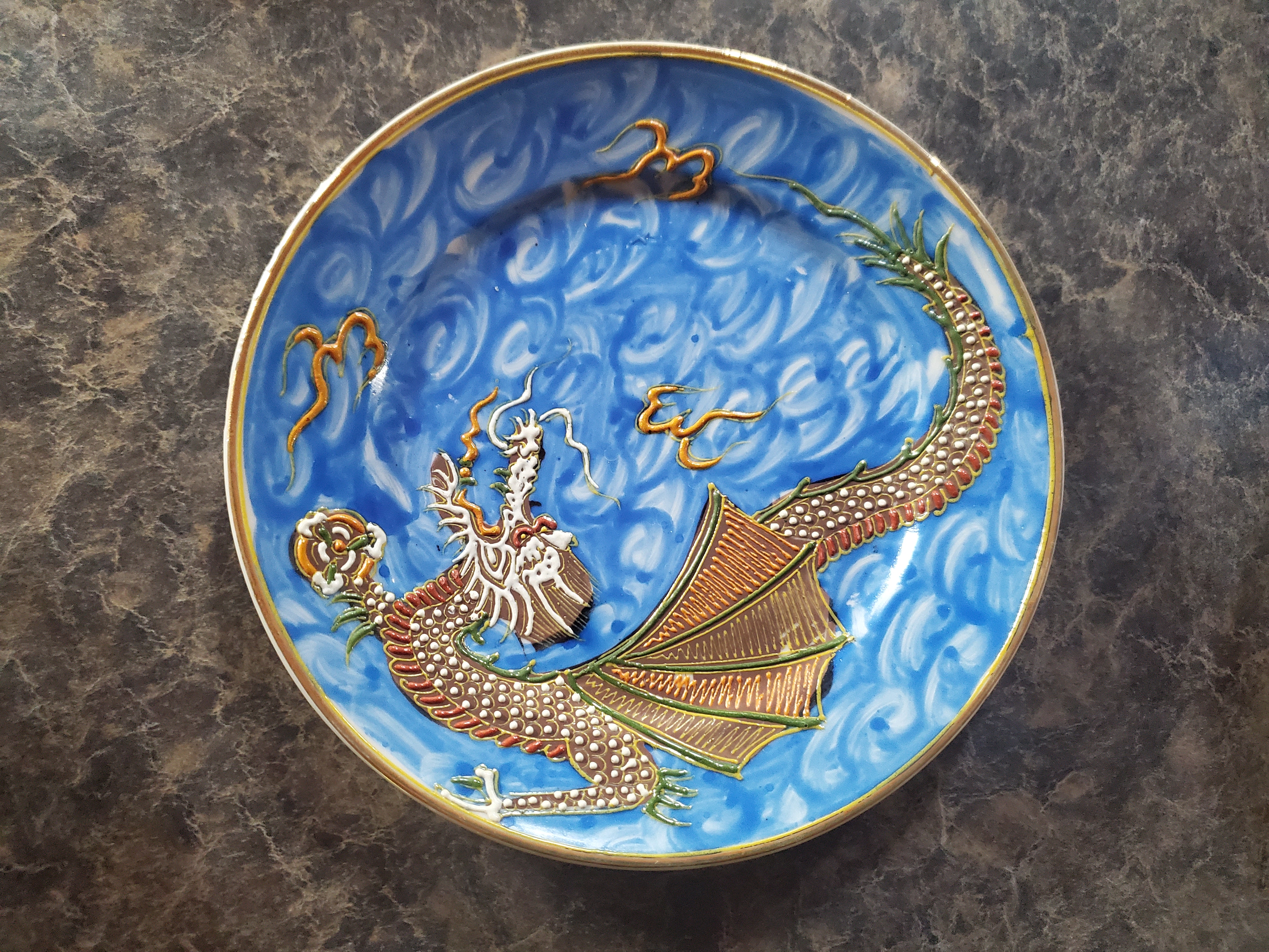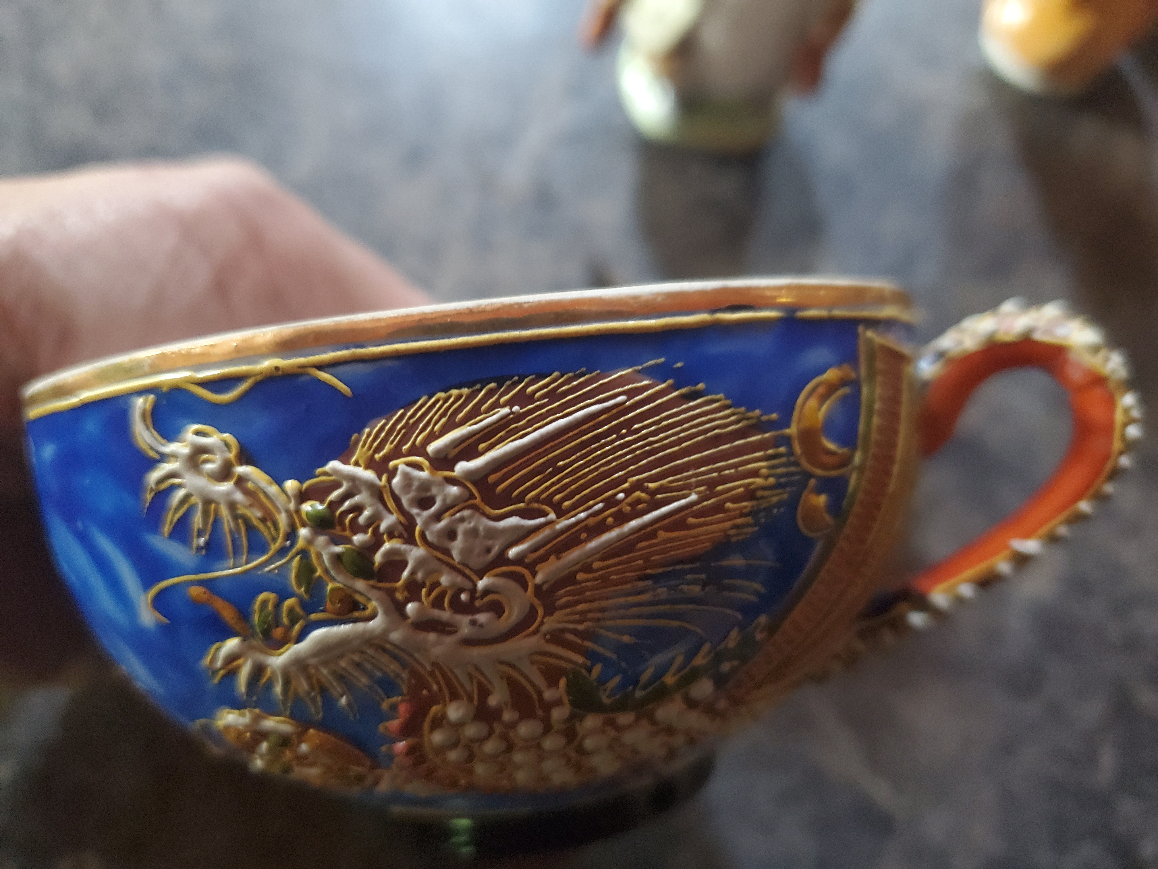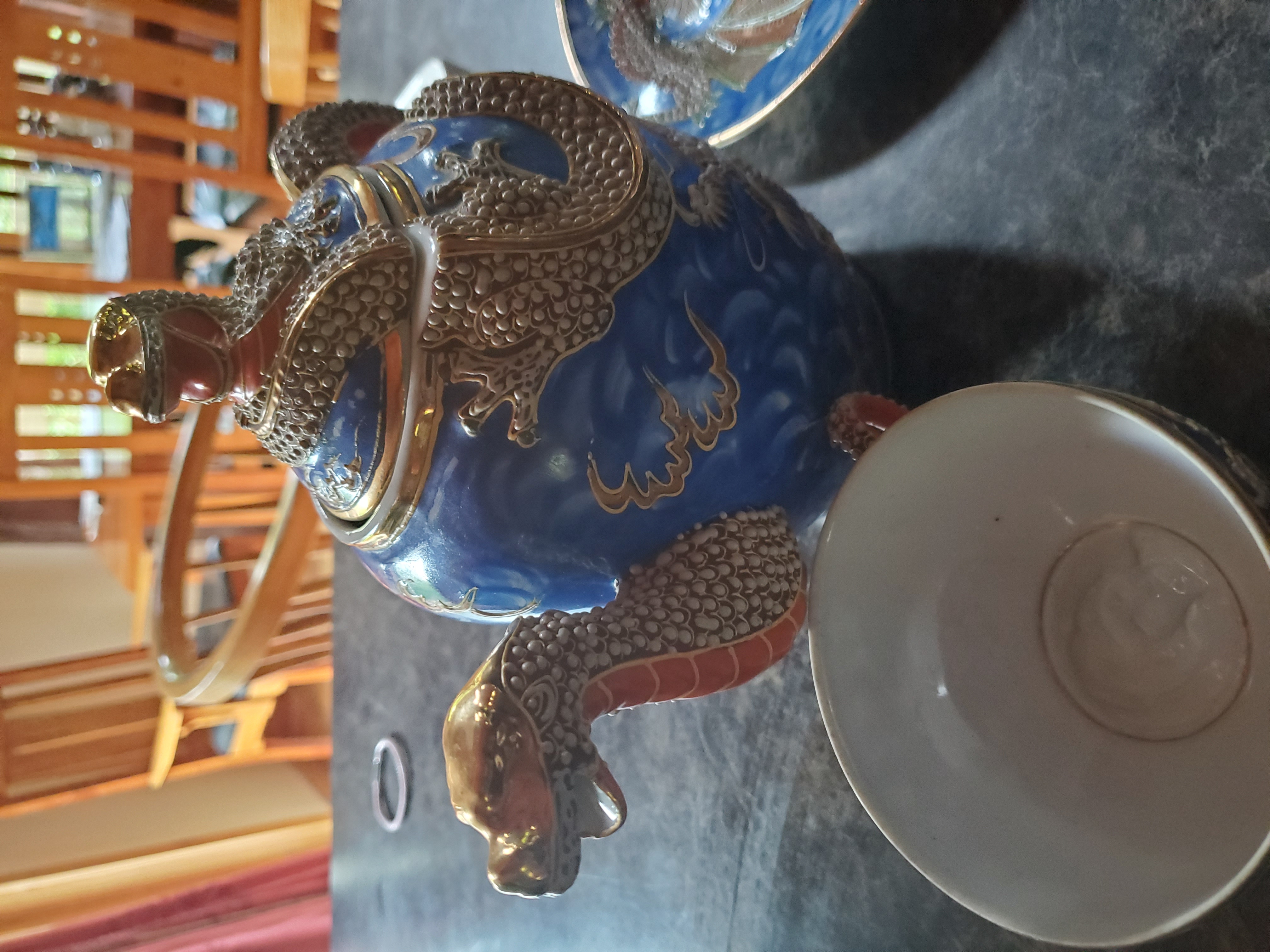 China set made inJapan. blue with dragons, cups have a womans pictut on the bottom when held up to the light. there are small plates, cup plates, large tea pot, snd creamer with the ssme pattern. My dad purchased when he was stationed in Japan. The bottom says Nagoya china, Japan.