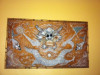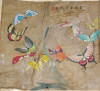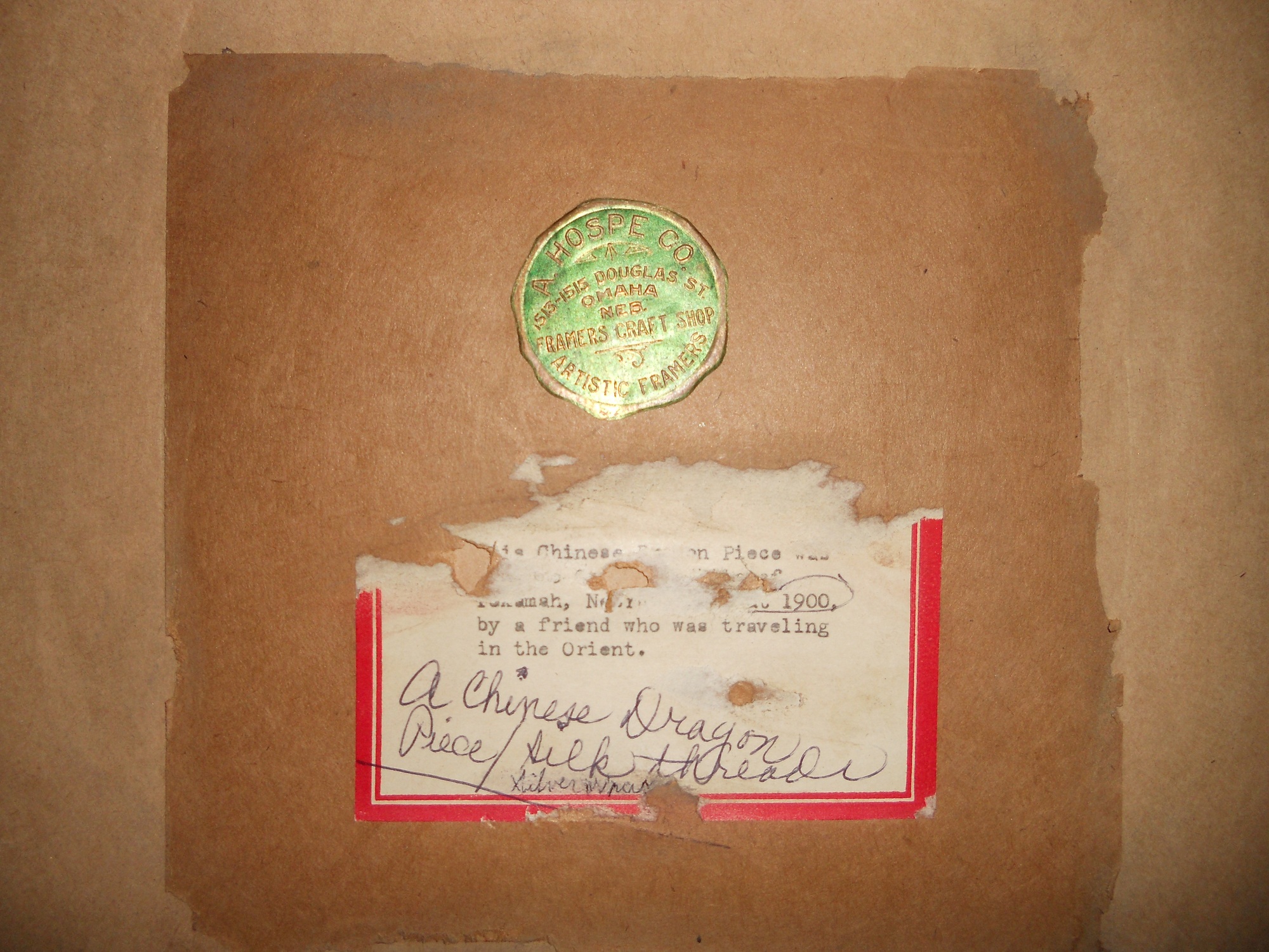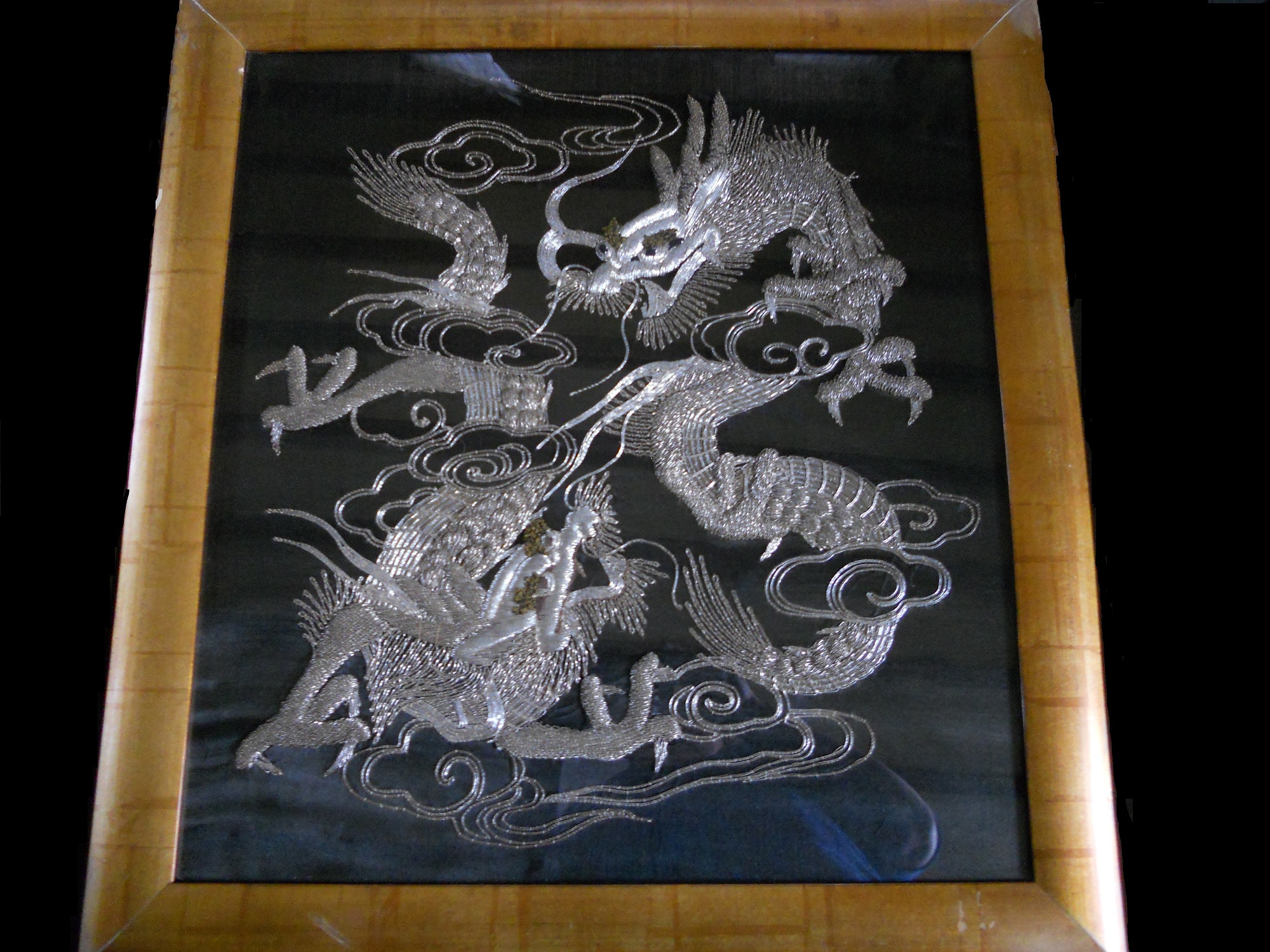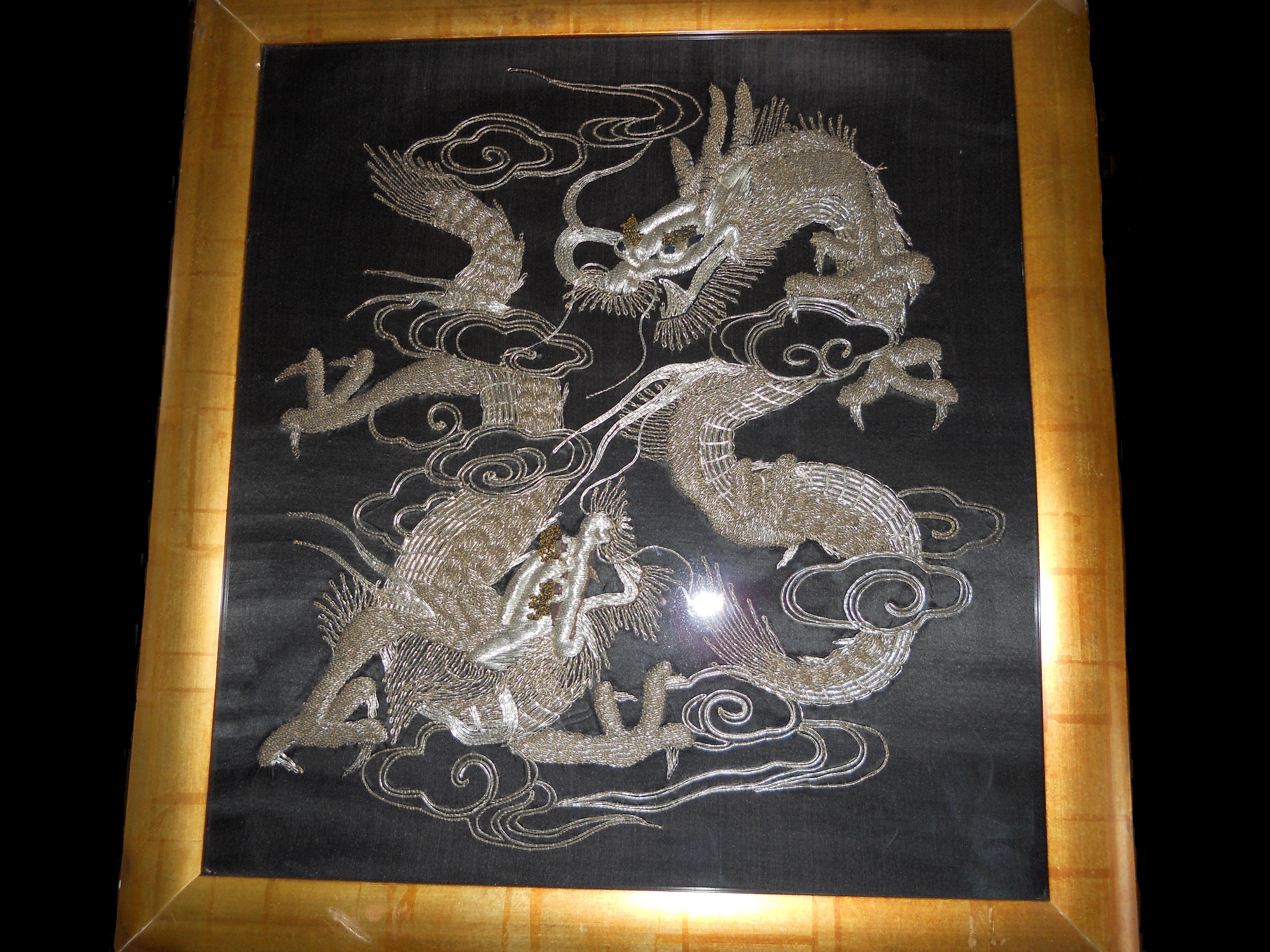 This is a beautiful Japenese Dragon embroidery. It is hand wrapped silk and metallic thread on black silk. There is some fading of the black silk but no tears. I believe this to be Japenese because the dragons have 3 toes. The dragons are female because of the fan tails but that is the limit of my knowledge. I was told by an appraiser that this is possibly 18th century if not older and could bea "sleep" ?? Would love to know more about this. The back has a seal from the company that framed it here in the states and I do not know where the sticker below it originated from. There are no other markings that I can see. Depending on how the light hits this art it will look more gold or more silver (see first 2 pictures).