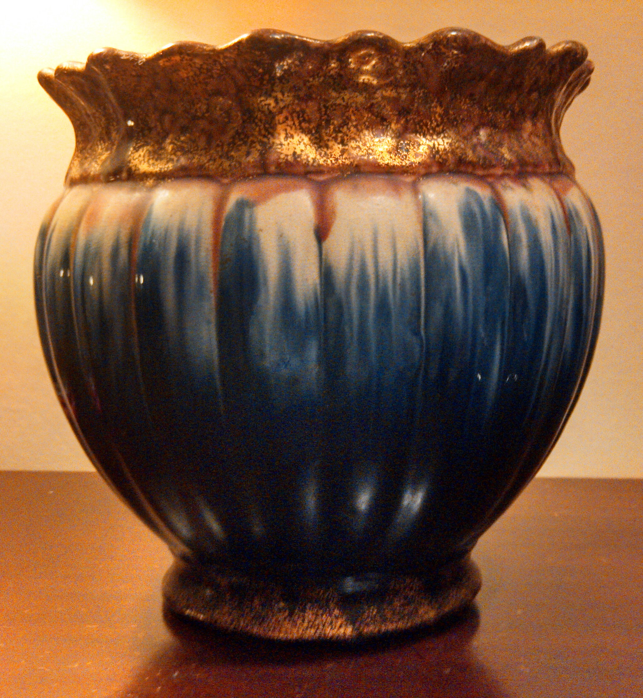 This has been passed down in my family. My dad called it a jardiette. I believe it is made from red clay and originated in North Georgia. It is glazed with light crazing and minor scratches in the surface but no chips or cracks. It has gilt around the opening and the base. Otherwise it begins as a lovely cobalt at the vase graduating to white further up. I would appreciate any information.