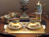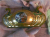 This is a 3 piece that I inherited a number of years ago from a dear friend. The set consists of a Jardiniere which has a pictorial on the outside, front and back - as well as on the inside bottom. It is ceramic or porcelain and is gold plated. The two additional pieces to this set are double candleholders - also goldplated. The jardiniere has a stamp on the side that states "Le Mieux China Hand decorated 24 Karat Gold.