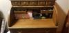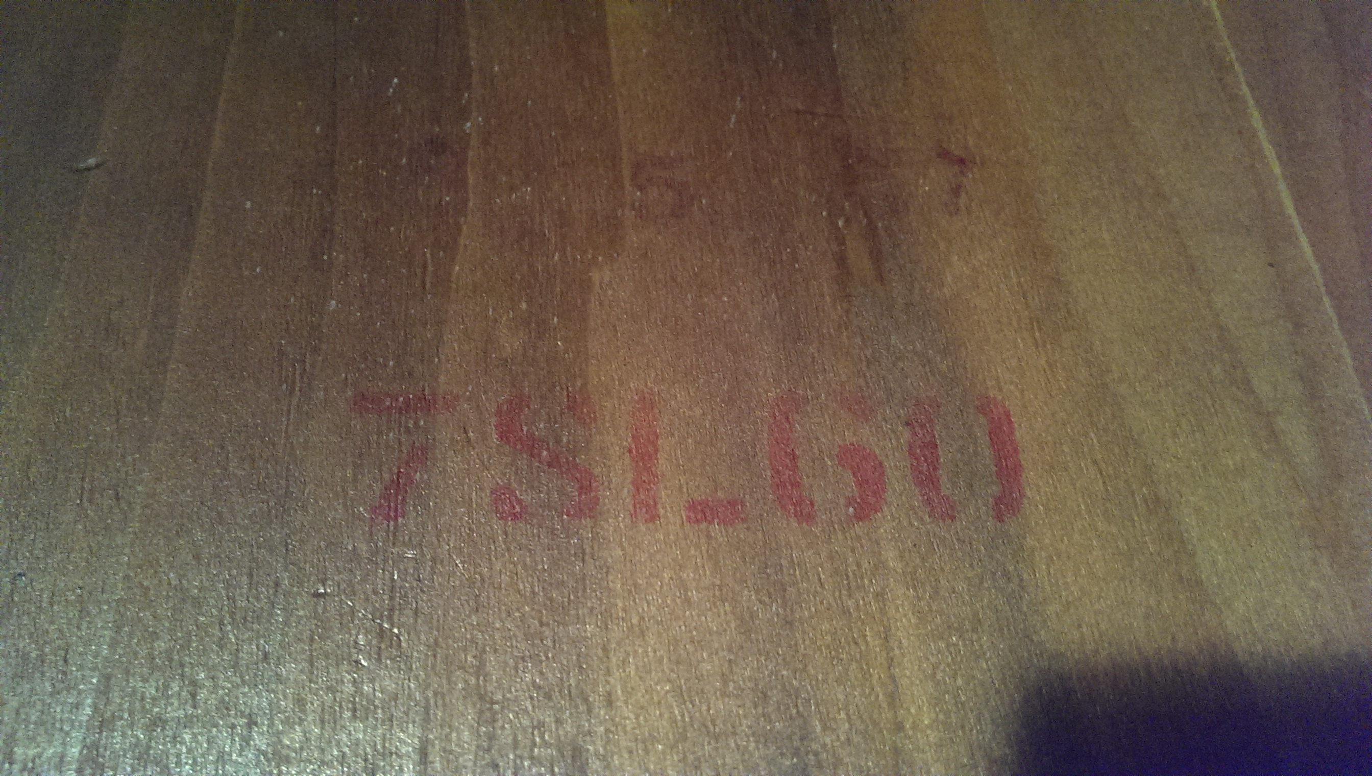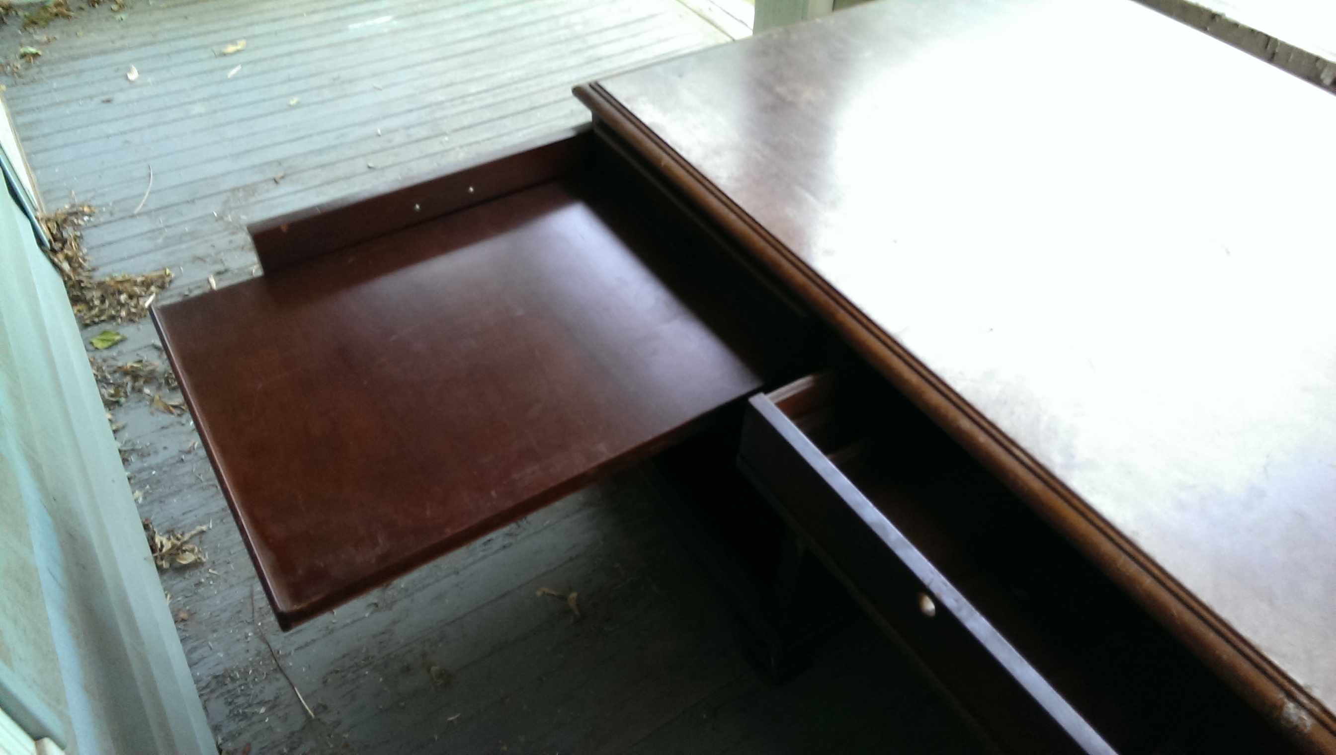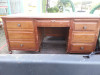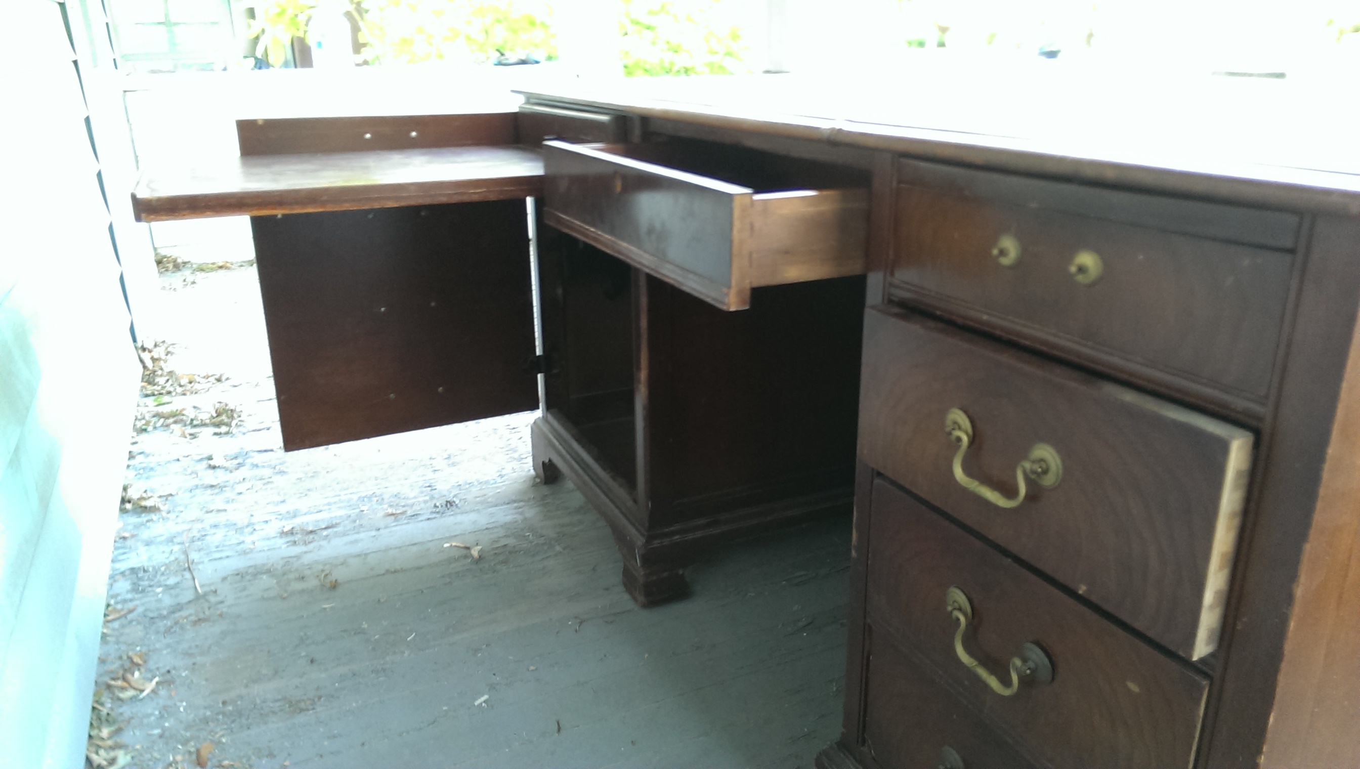 Unknown year. It is very large with a cabinet on the left side that has a spring loaded typewriter stand. On the right there are four drawers that lock when the center drawer is pushed all the way in. In the underside of the center drawer there are two series of numbers. 8 5 57. And 7sl60.