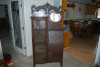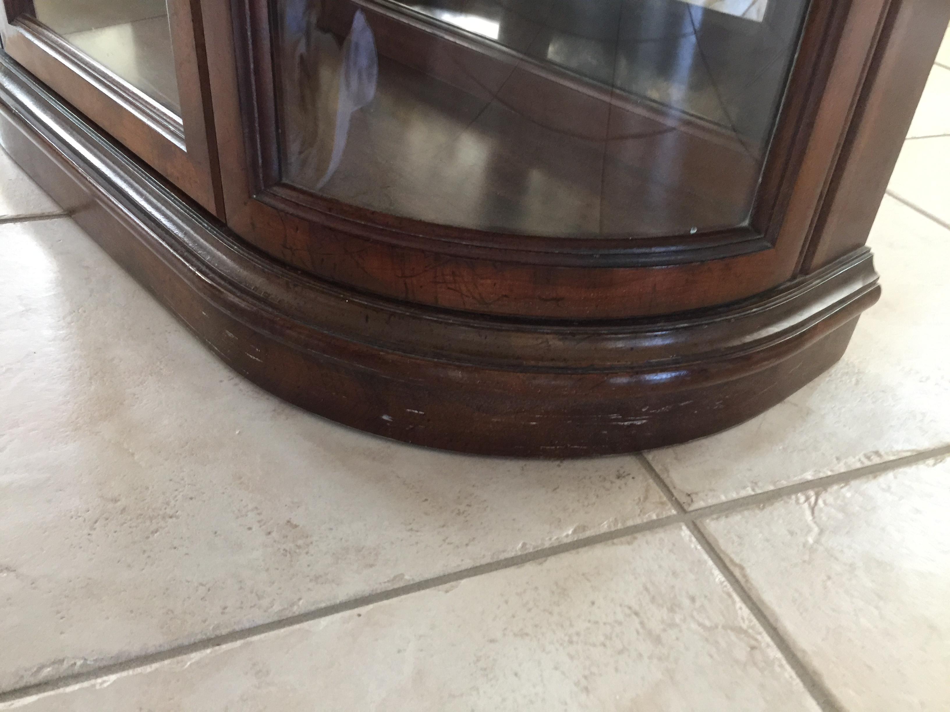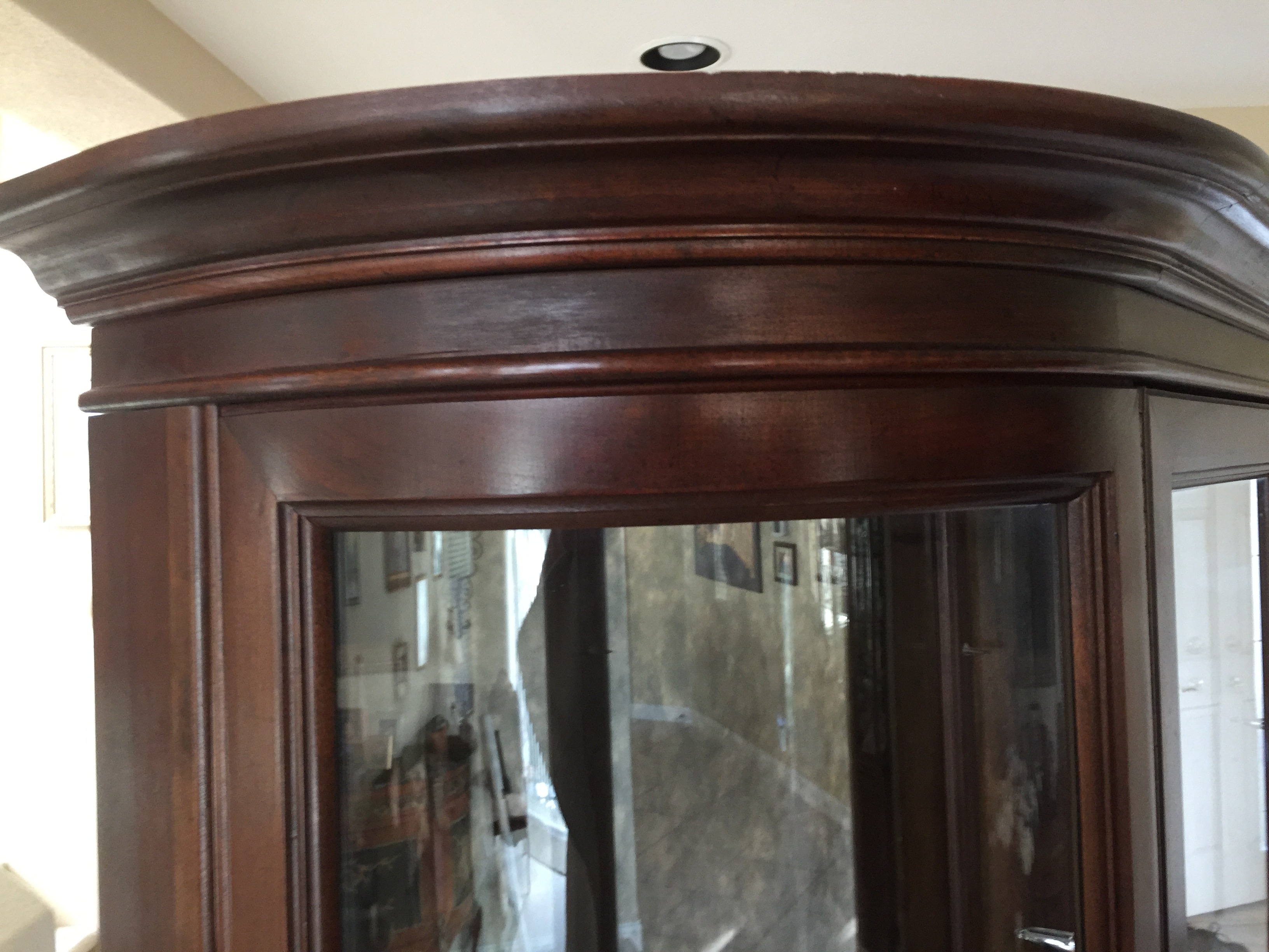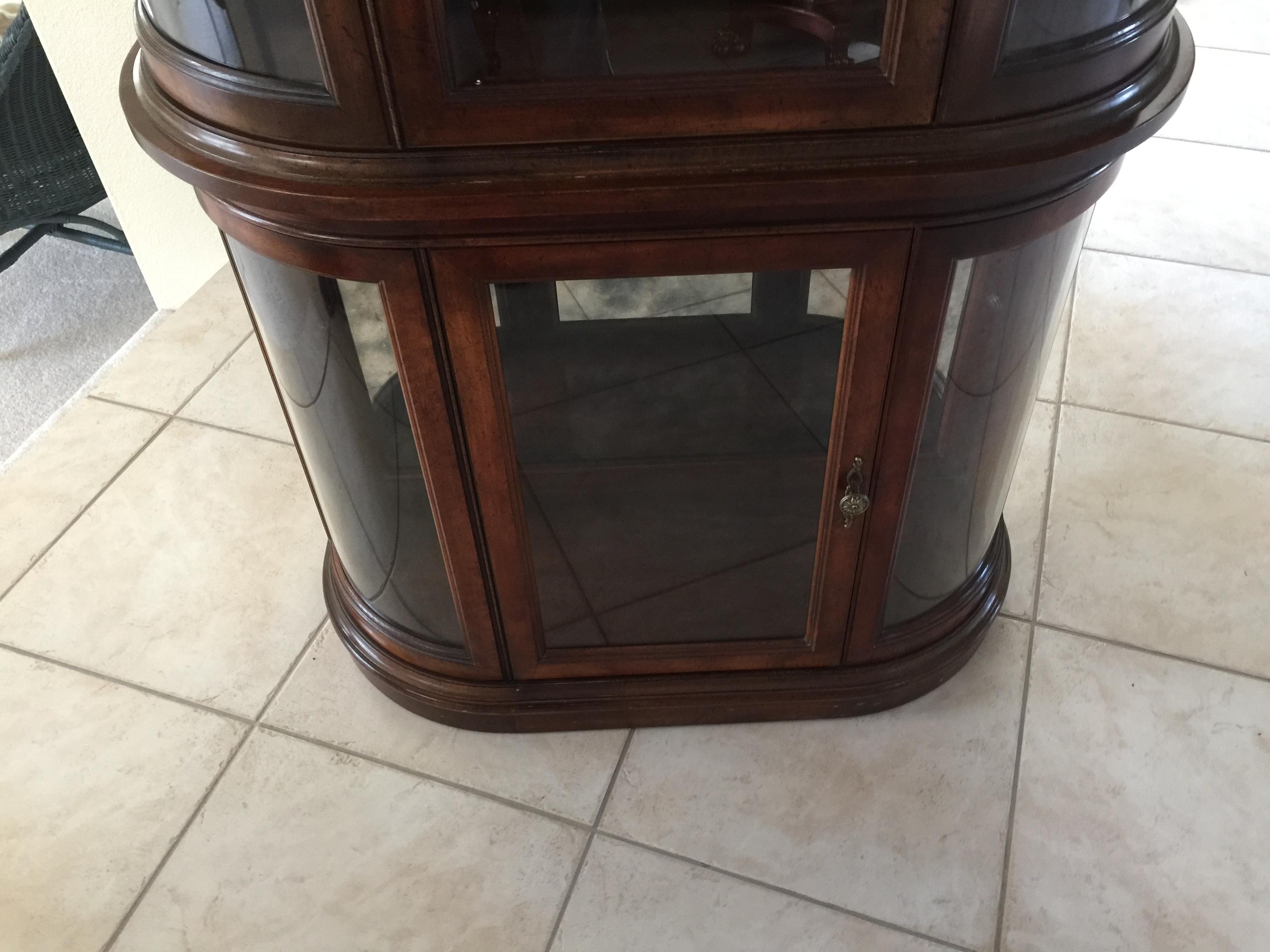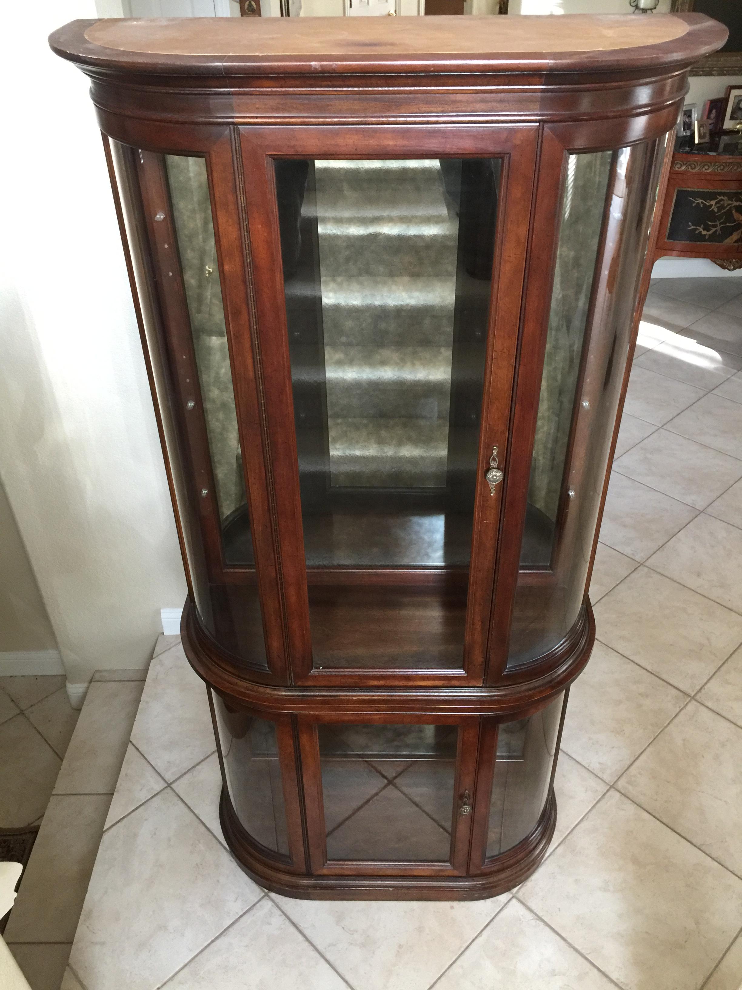 I believe this cabinet to be manufactured by the Jasper Furniture Company, it has 4 adjustable glass shelves 3 in the top section and 1 in the bottom section, all of the glass shelves have a groove etched along the back edge. Mirrored back with glass sides, the unit is made of wood in a warm walnut finish.