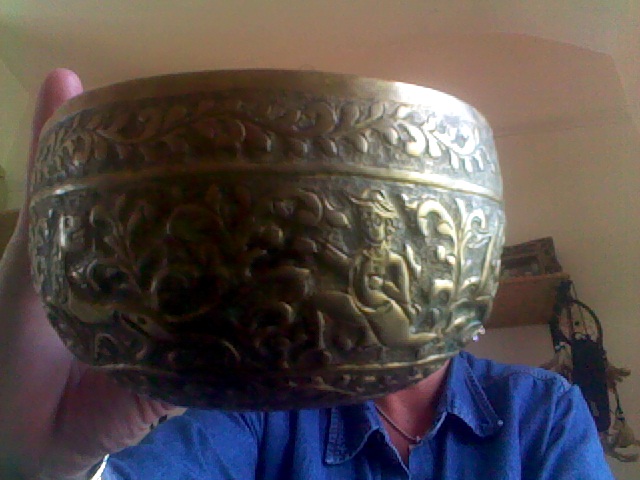 it is a brass bowl with engraveings of floral deer a man in costume i dont recognise and either a dog or lion of some sort ,, thought may be a singing bowl but im not sure
