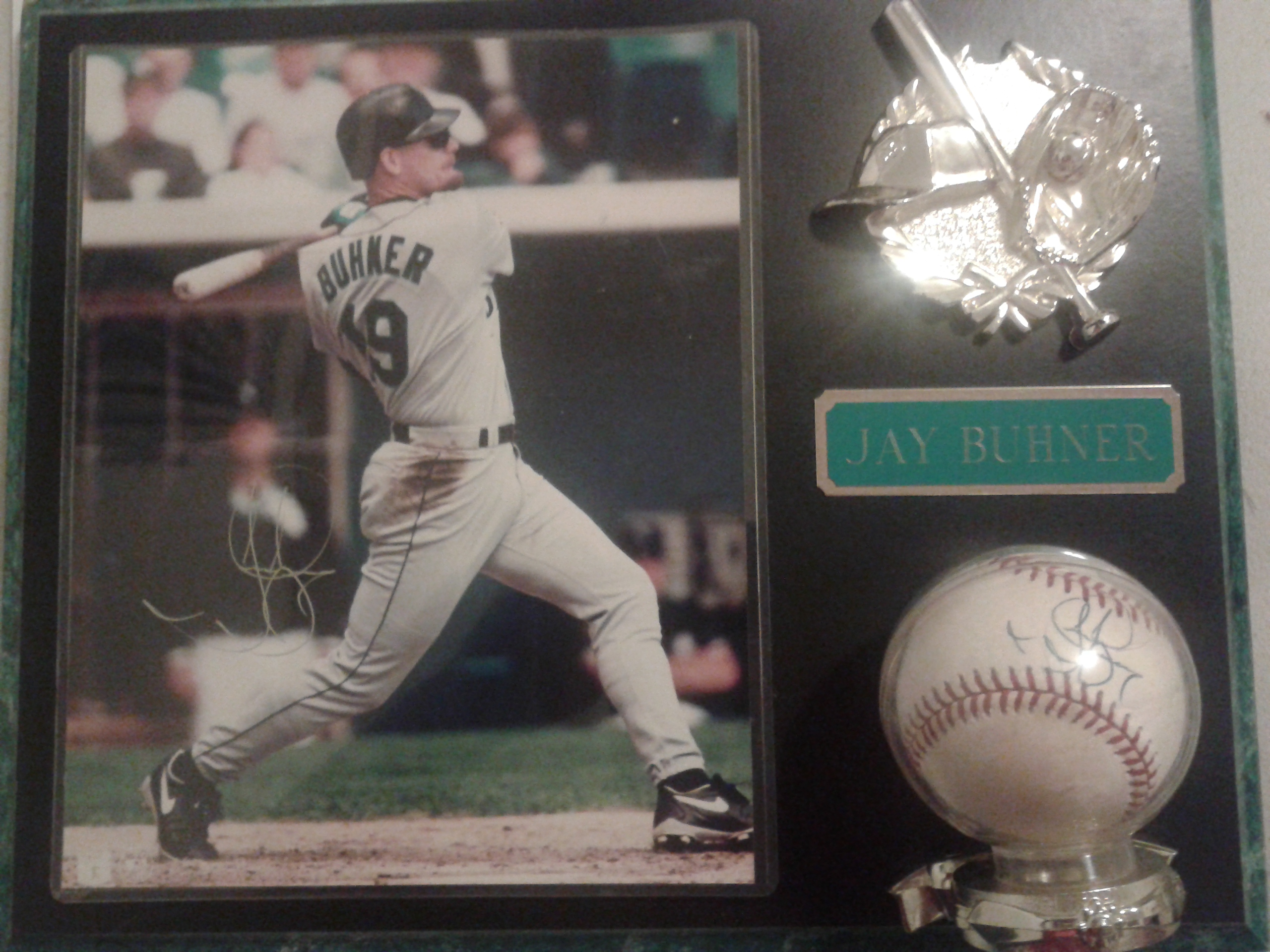 The Baseball and photograph are signed by Jay Buhner and incased on a wooden plaque. Not sure if the plaque was custom made for the baseball and photograph. Above the baseball which is located on the bottom right is a Jay Buhner name plate and above that is a gold plate with a baseball cap, bat, and glove. The plaque did come with two certificates of authenticity. One for the signed baseball and one for the photograph. On the certificates of authenticity is a name of the store or place where the baseball and photograph were signed and has the name of the person who witnessed the signing. Royal Awards Monarch Memorabilia is the name of the shop.