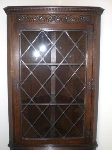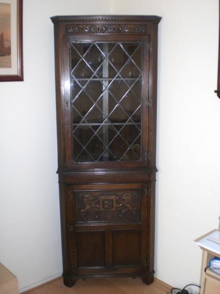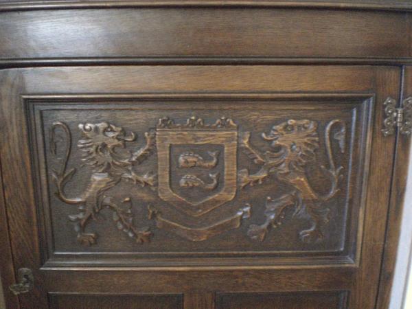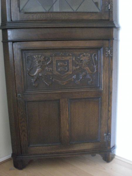 There is a single door cupboard at the base with two more removable shelves inside. The outside of the door has three inset panels, the top decorated with carved lions and a shield. The cupboard stands on blocked feet. This is a sturdy unit, in excellent condition.