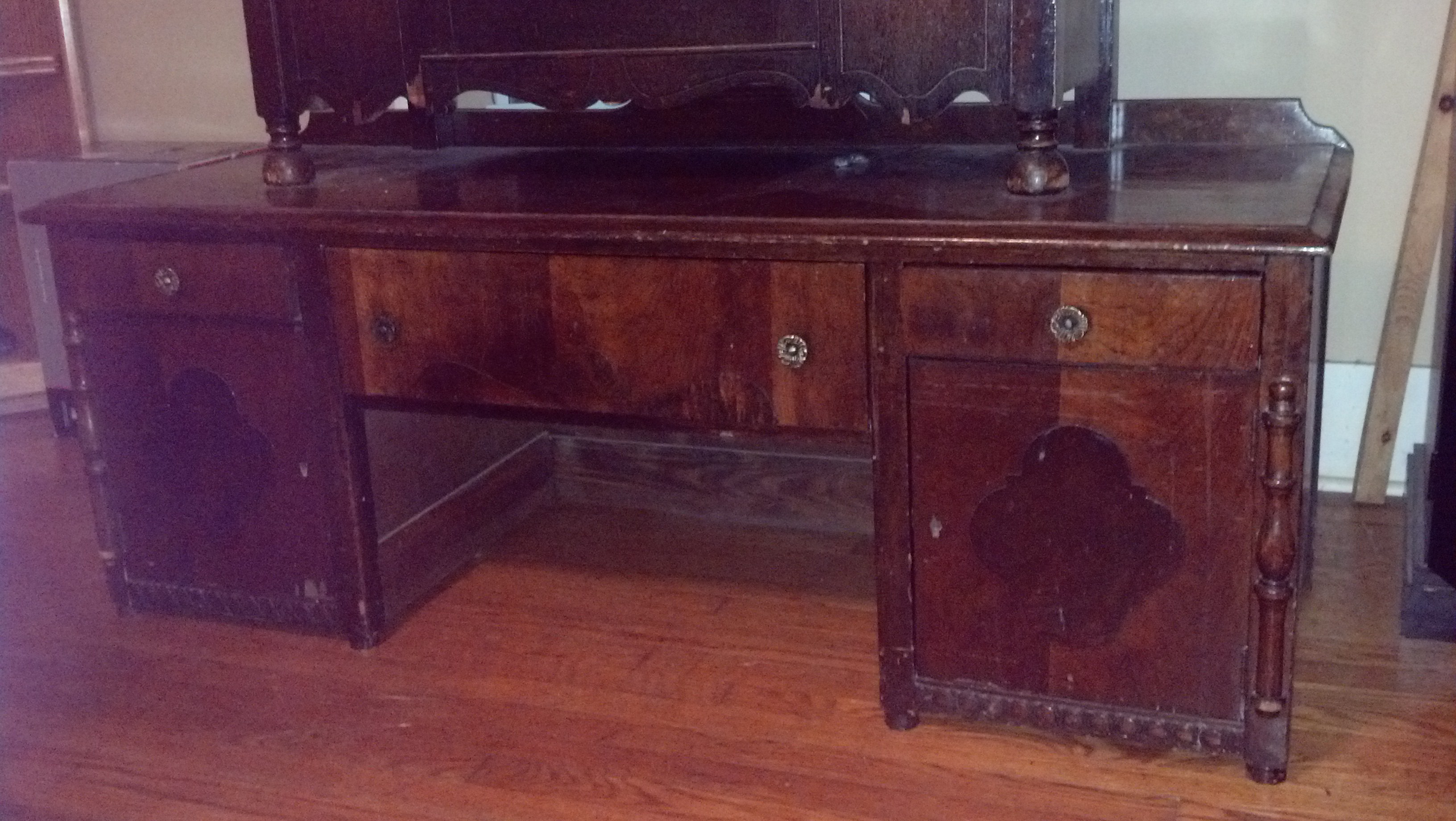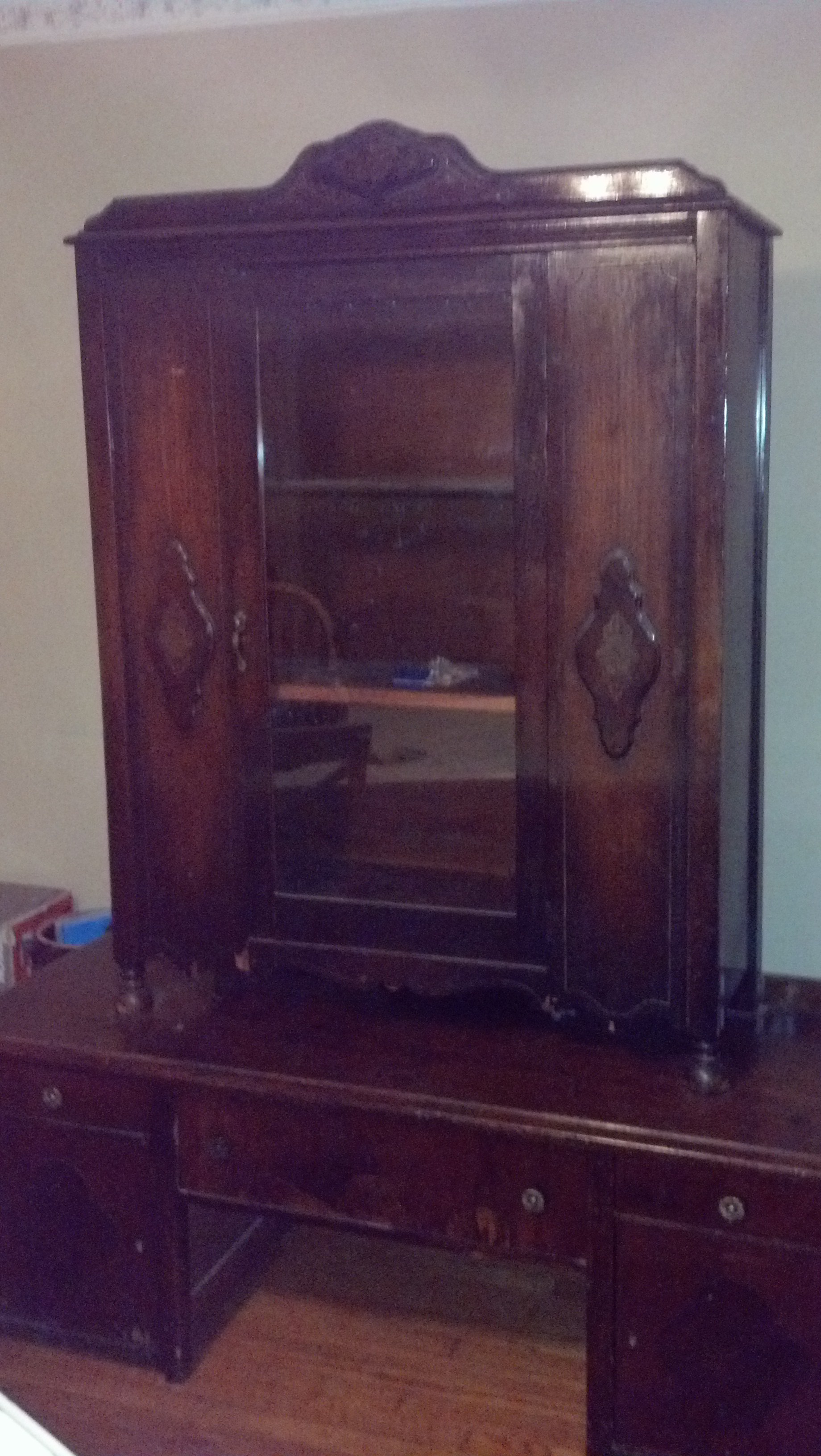 These 3 pieces were handed down through generations, i am trying to find a price because we would like to sell. we havte 1 skeleton key that unlocks all 3 pieces. there is miner wear and tear on the cabinet and it appears the venier is cracked on the hutch.