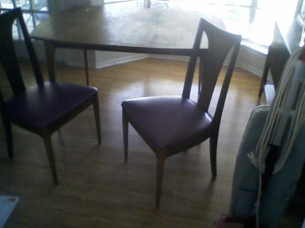 The table has two leaves and six chairs - two with arms and four armless. I've replaced the vinyl on the chairs, and can't remember if the "original" is still underneath.