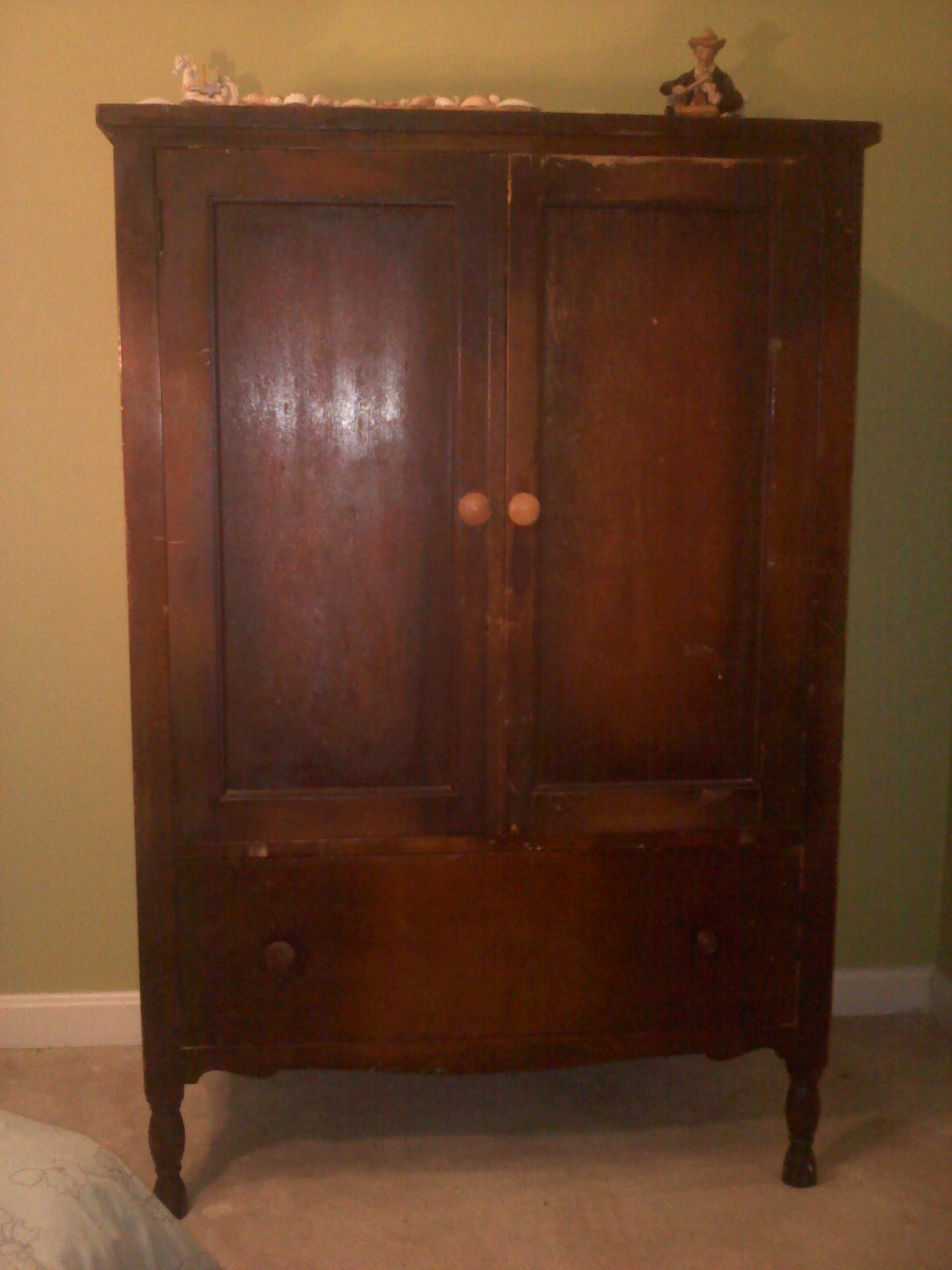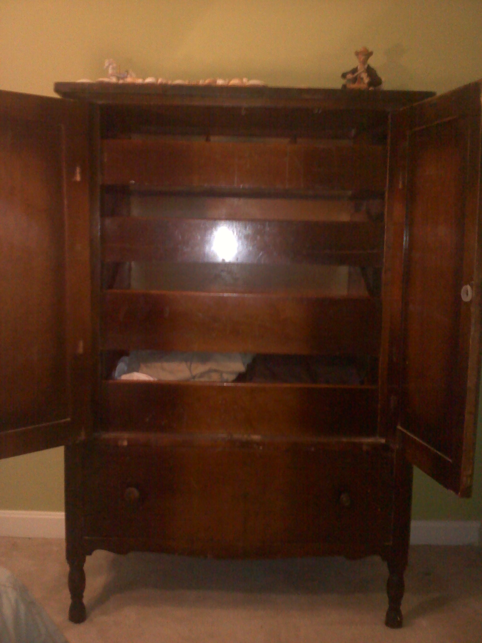JB Van Sciver dresser, all wood with dove-tail drawers, 2 doors on front open to 4 individual drawers plus an additional drawer on the bottom underneath the doors, does not seem that was particularly well taken care of over the years with some scratches, drink rings, etc. and one of the inner drawers has a crack partly through the front but drawer is still completely functional