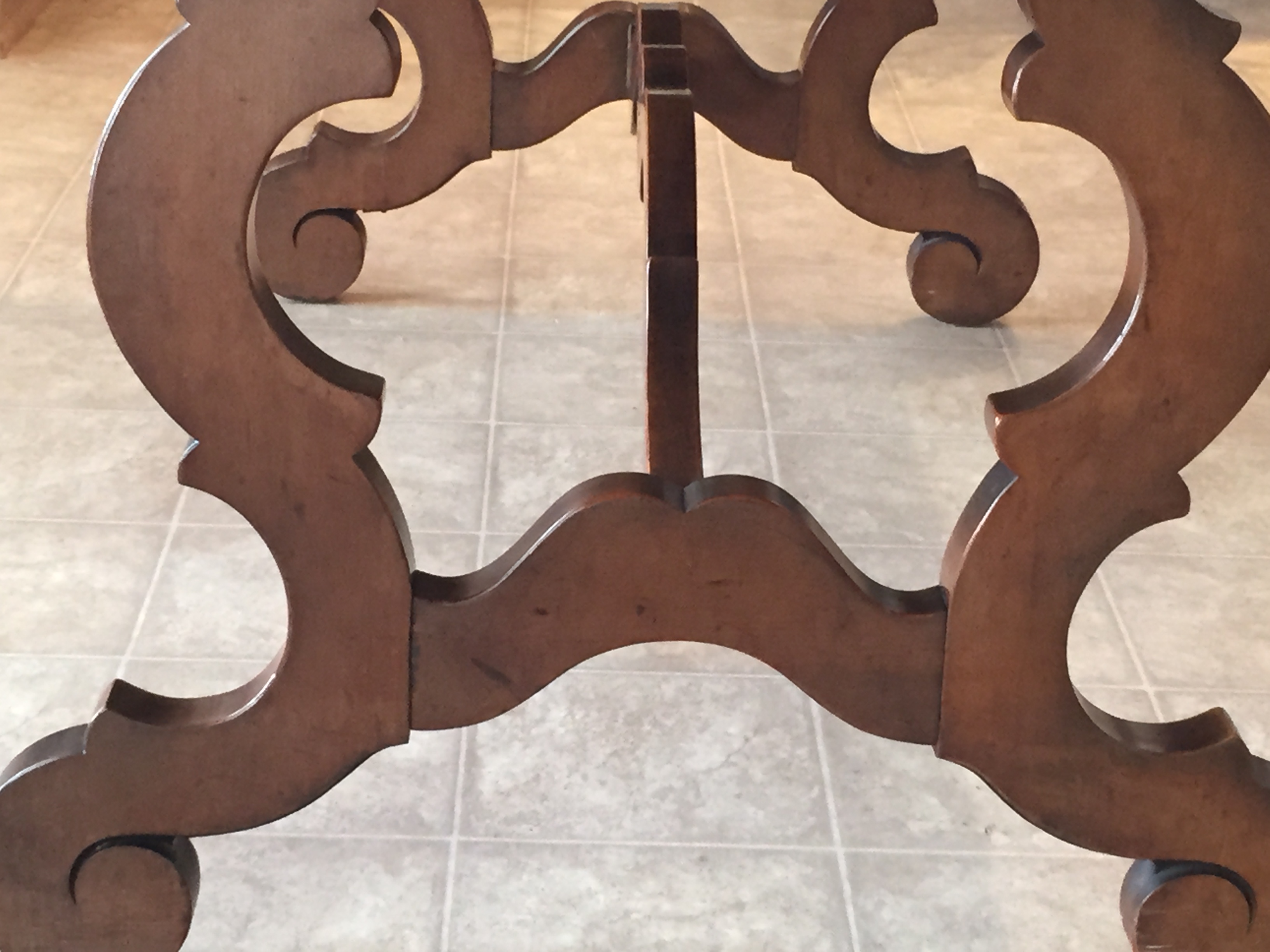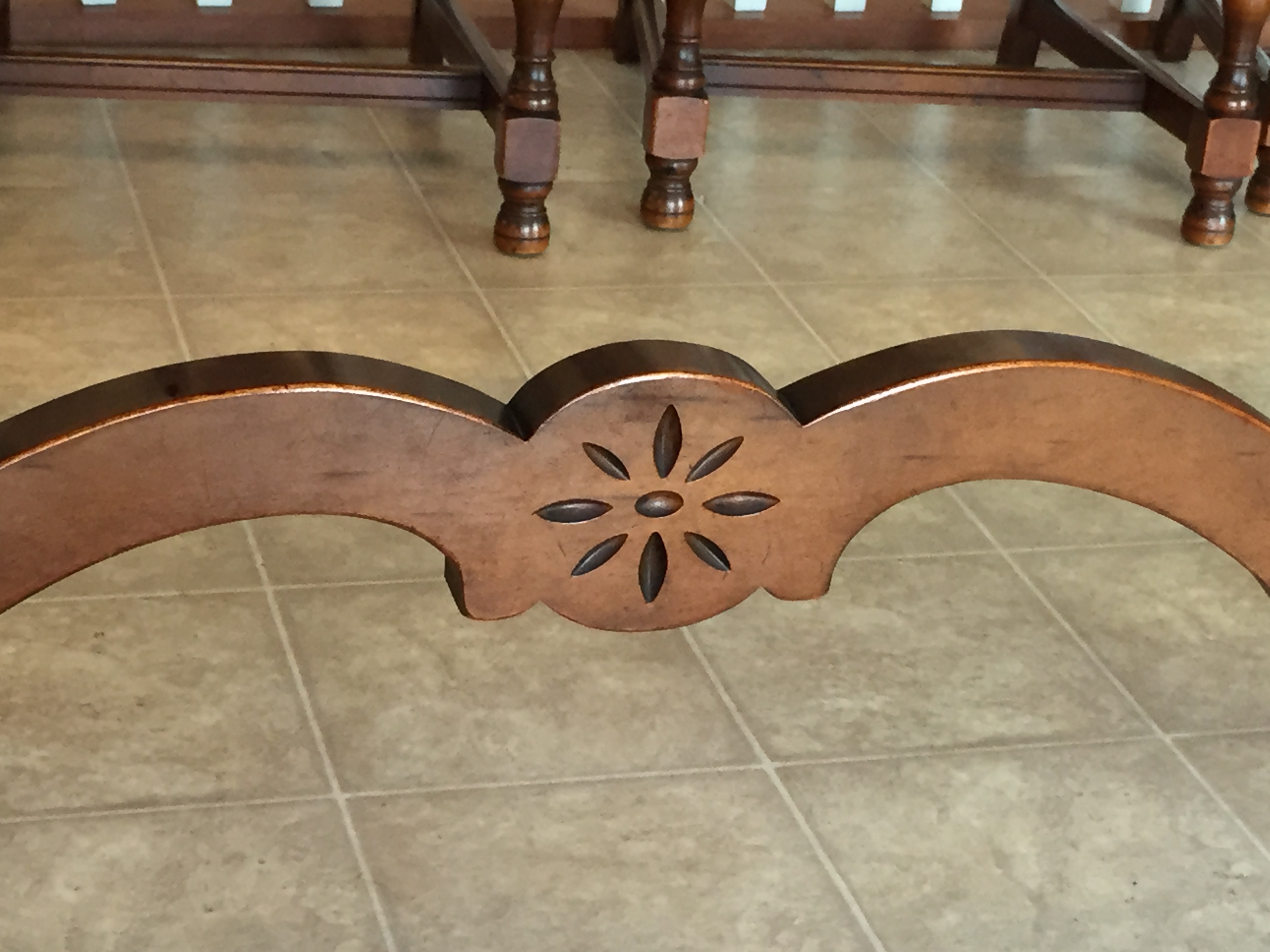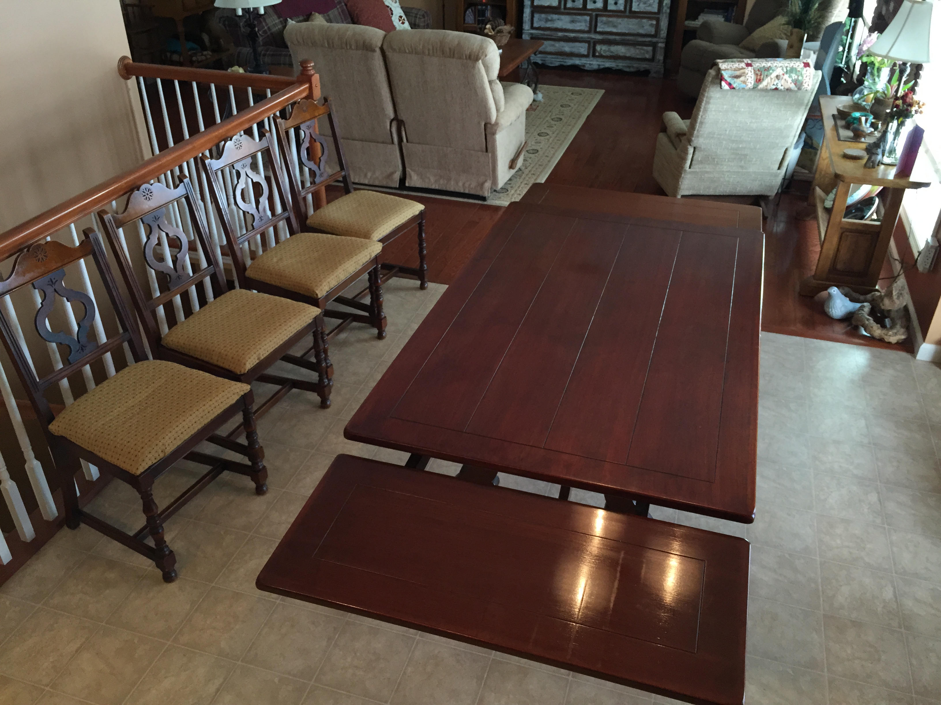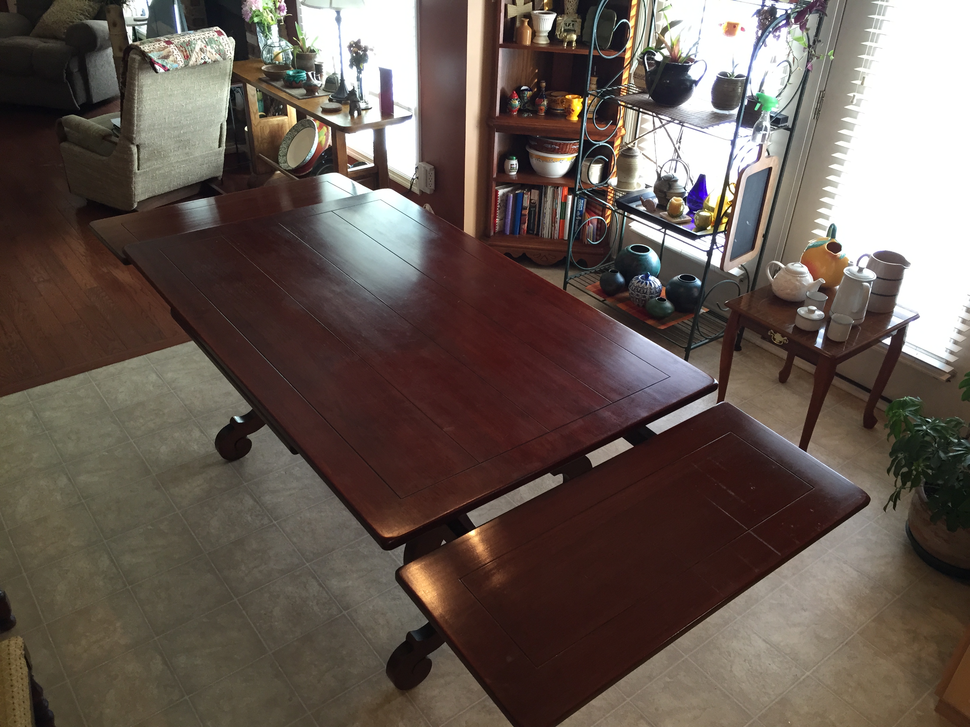 trestle/refectory/slide extension table which extends from both ends (16’ pieces that slide out from either end, drop and then slide/lock into place). Without extensions, the table measures 62” long (5 feet) and with the extensions it is 94” long (nearly 8 feet!). There are natural age imperfections and one of the feet was repaired before we owned it. The table does not have a marker but does have written numbers on the underside. Table and chairs are sequential with numbering: see pics