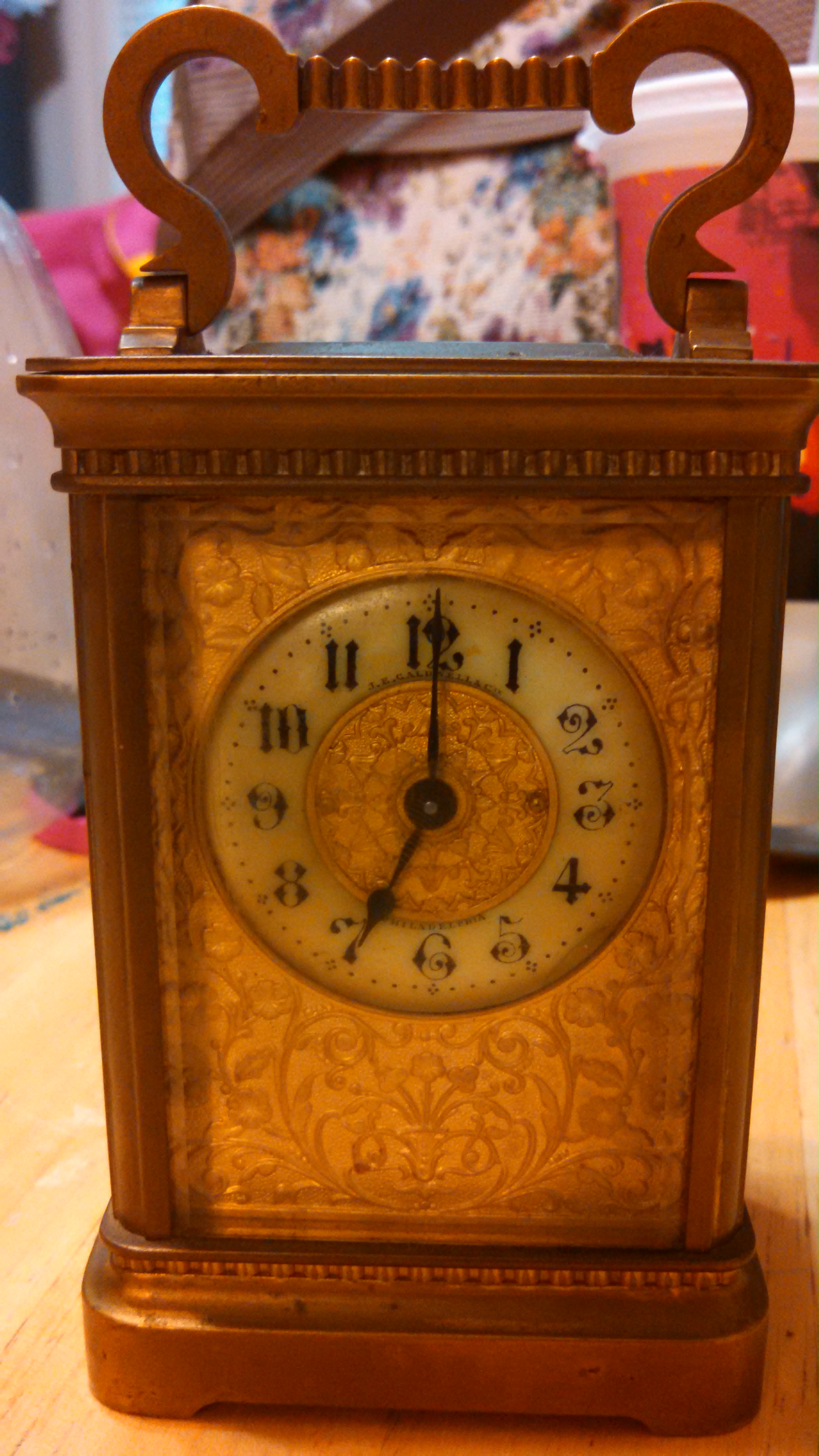 all brass JE Caldwell philadephia carriage clock . made in Switzerland with initals CHS GORGE SA inside. cannot find a clock that matches this one to its exact detail.
