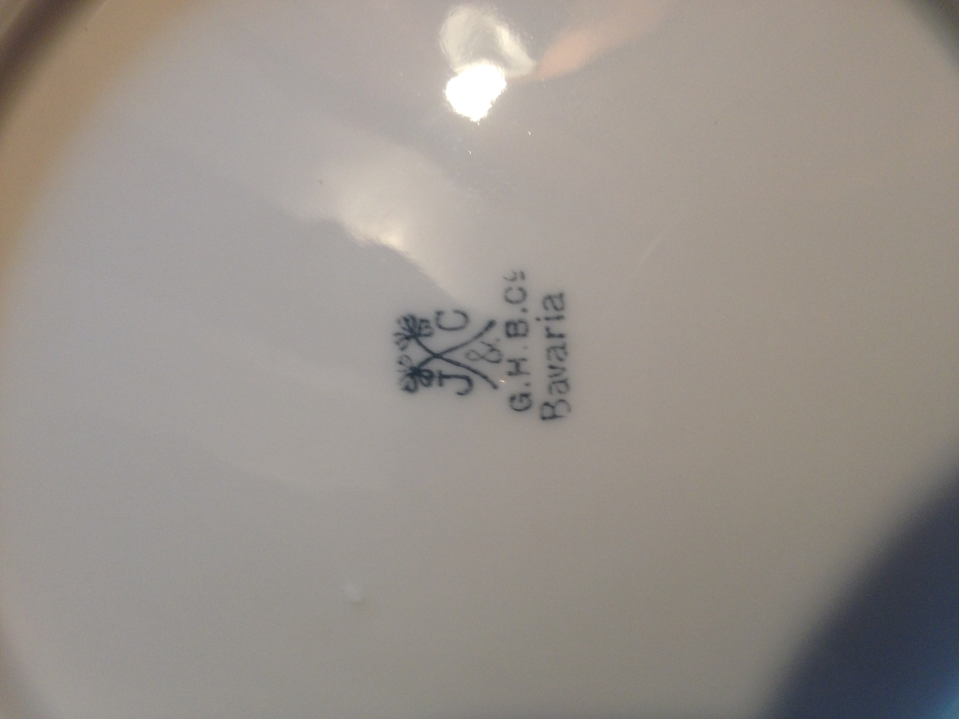 I have a complete set of plates, bowl, serving plates and cups, saucers, tea pot and more. All are Jeagar pink flowers, little roses with green leaves, with gold trim.