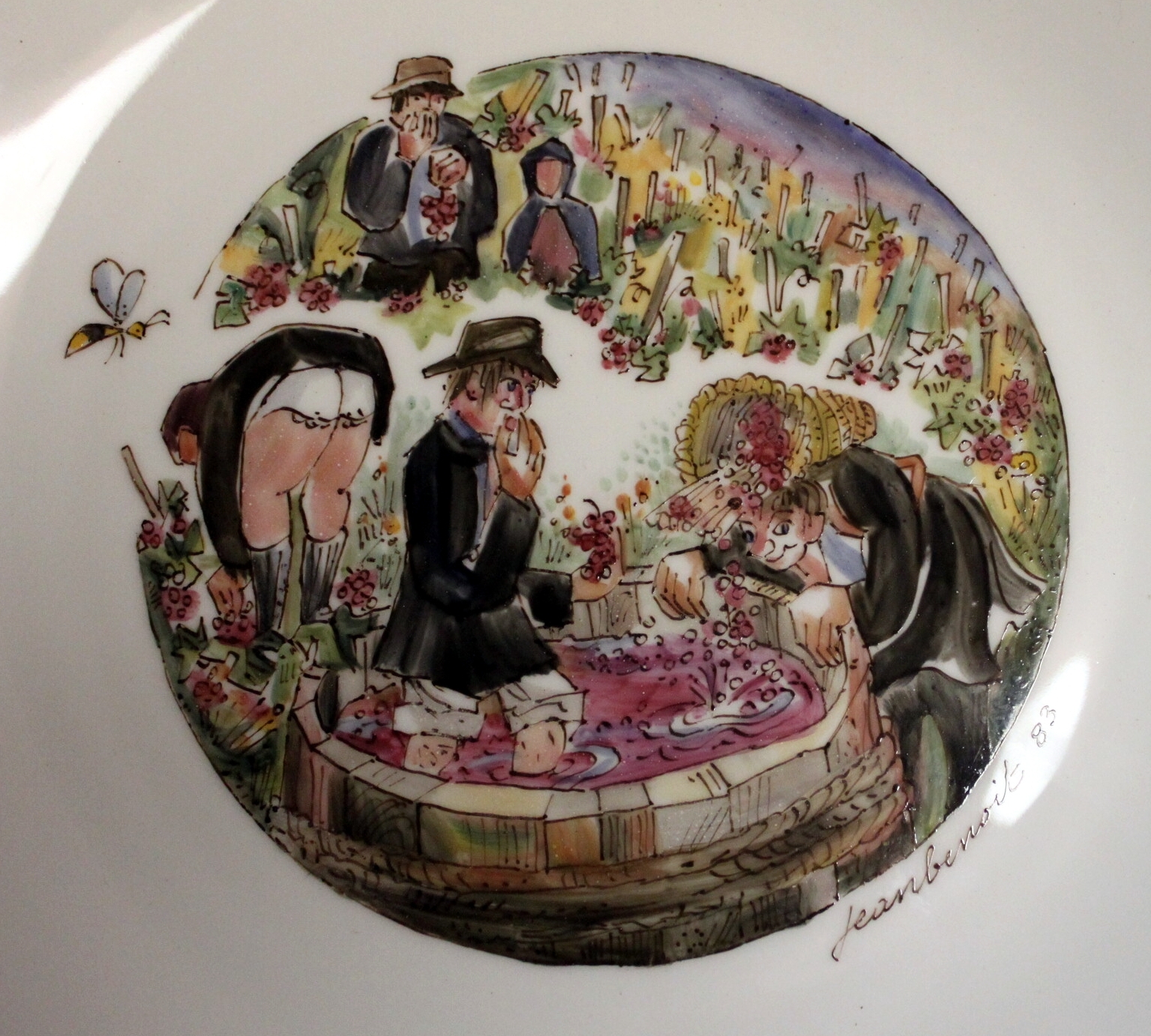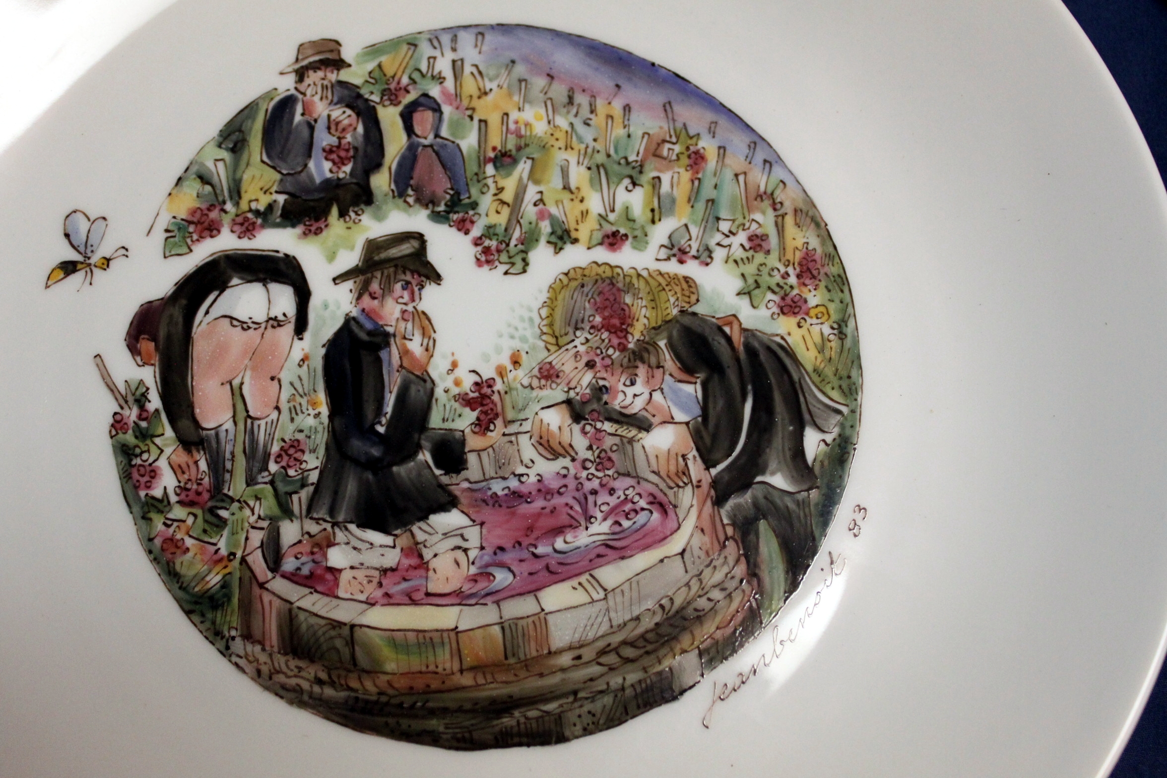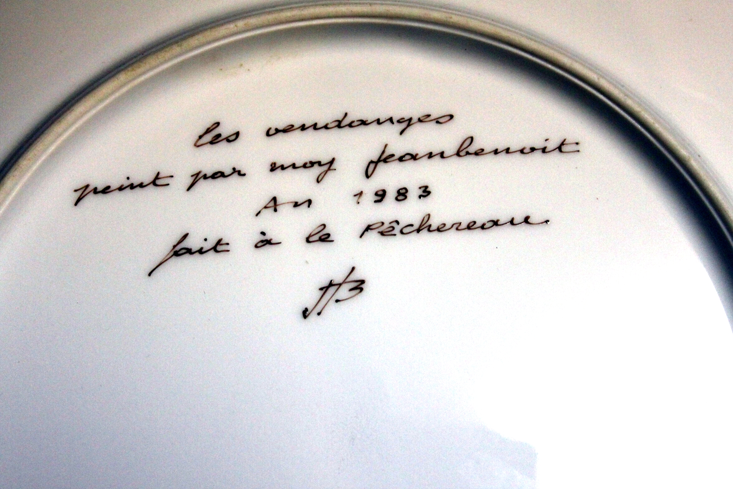 This appears to be an original Jean Benoit acrylic on porcelain from possibly May 1983. I believe the title is "The Harvest" It is inscribed on the back with inscription in French. This is my best representation of the inscription; "Les vendanges veint var may Jean benoit an 1983 fait a le pechereau JB"