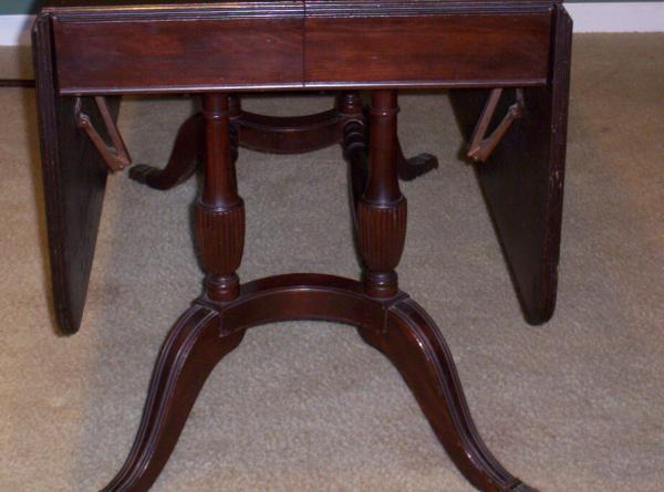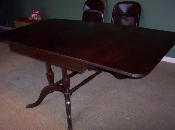 This table needs refinishing but the inside gear mechanism works perfectly. I have a pull that releases the table to enable it to be pulled apart to get to the inner leaf. It has metal claw feet. I'm not interested in selling, but curious in the value of the table.