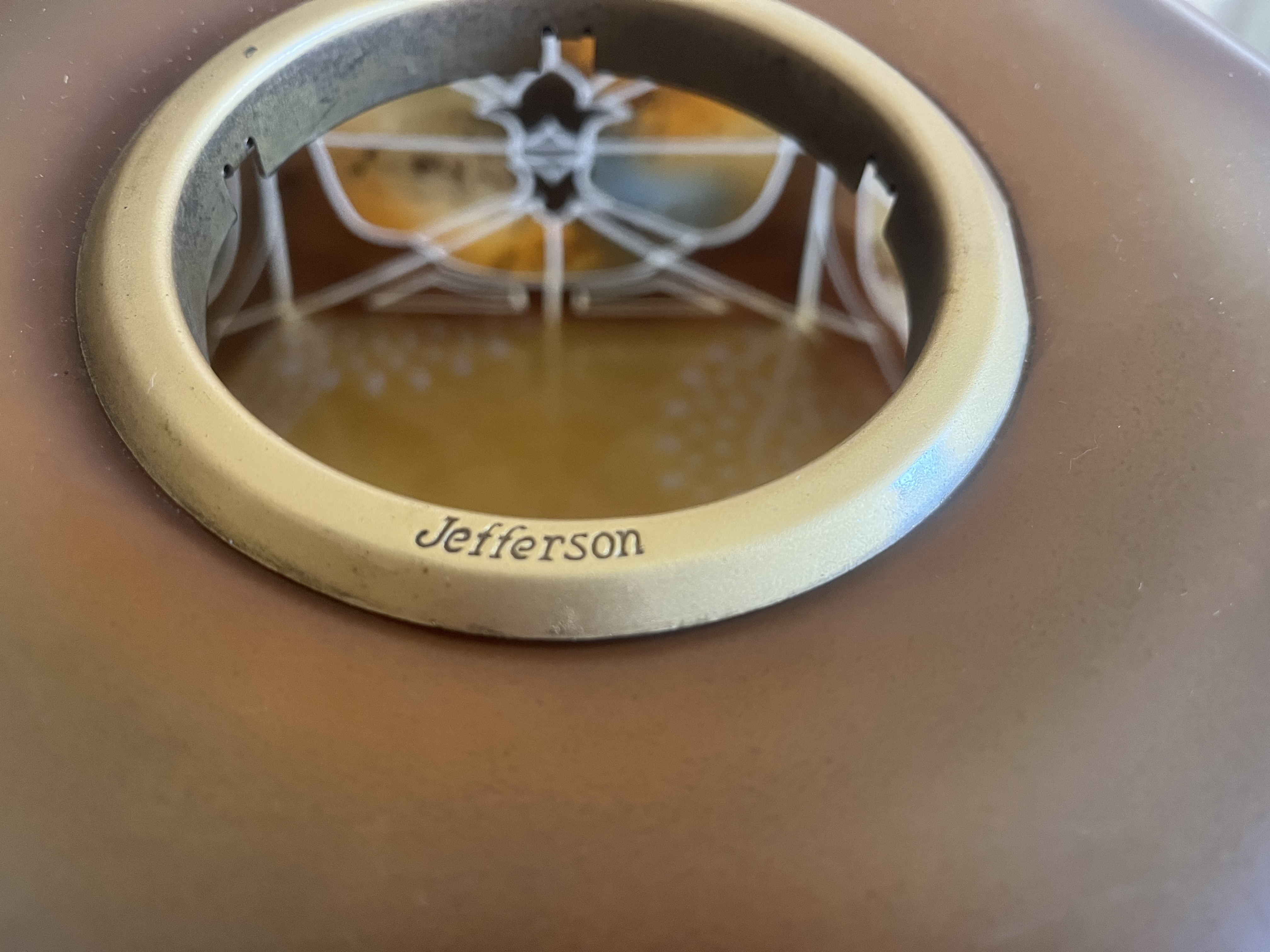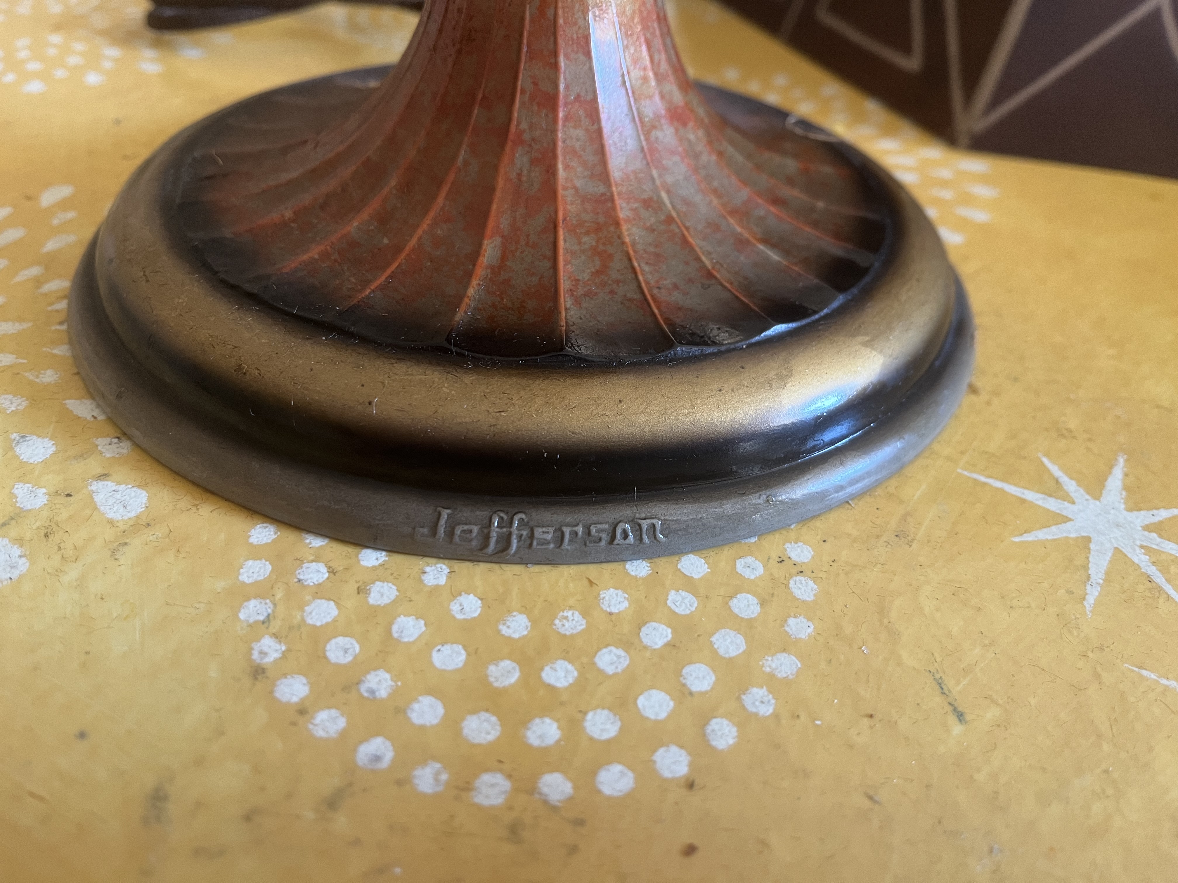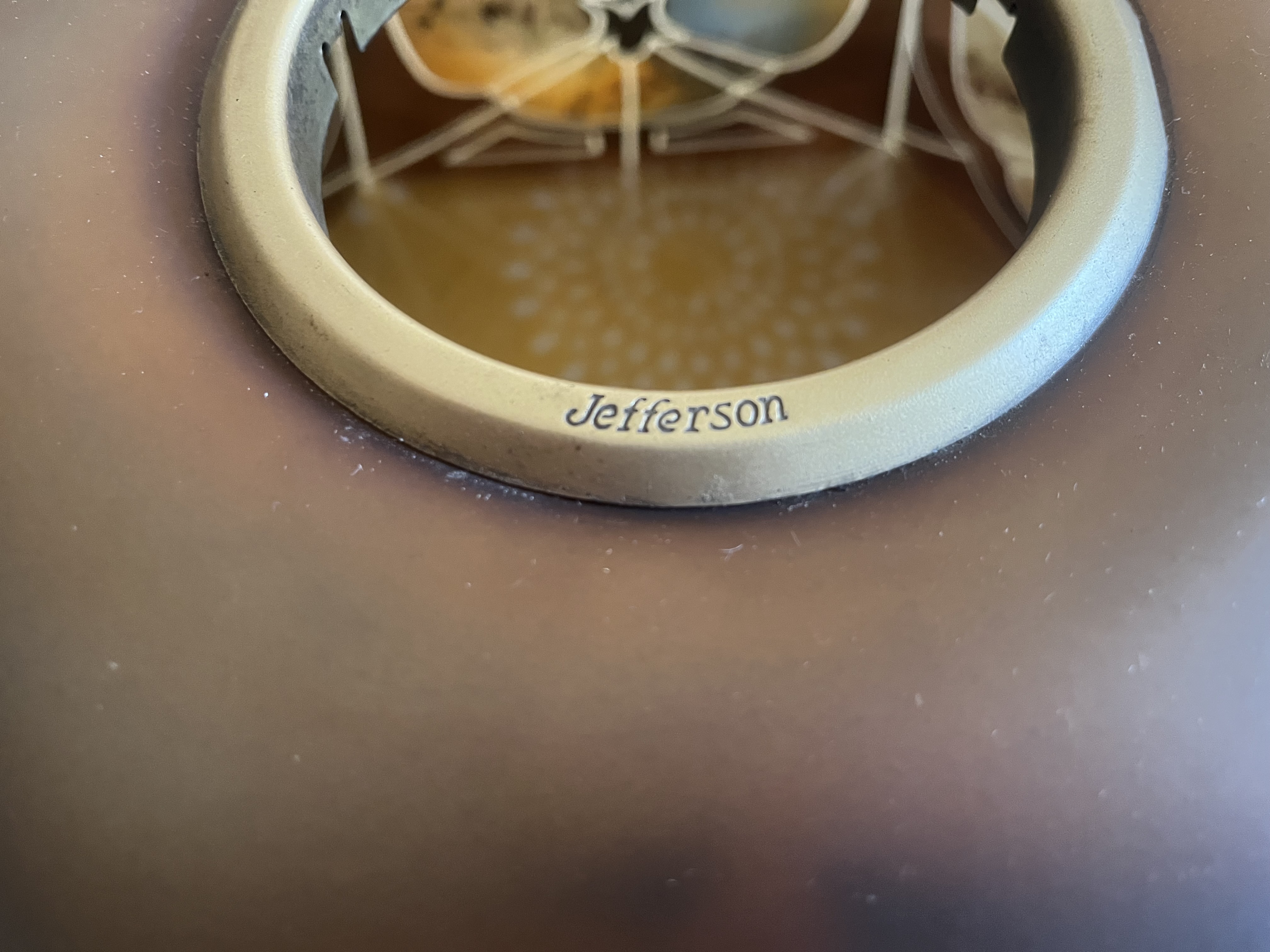 Historical Context: The Jefferson Lamp Company was known for producing high-quality lighting fixtures in the early to mid-20th century, often characterized by intricate designs and craftsmanship. The period of production for this lamp likely falls within the 1920s to 1940s, aligning with the Art Deco movement which emphasized geometric shapes and bold colors.