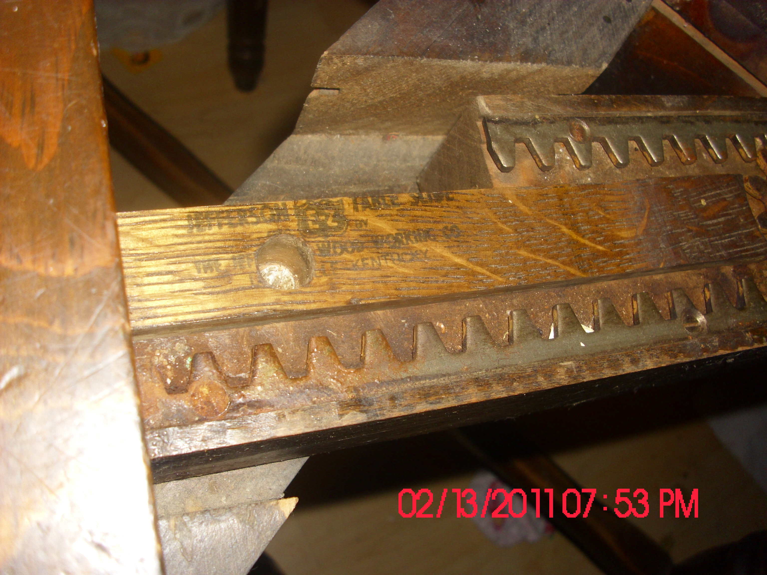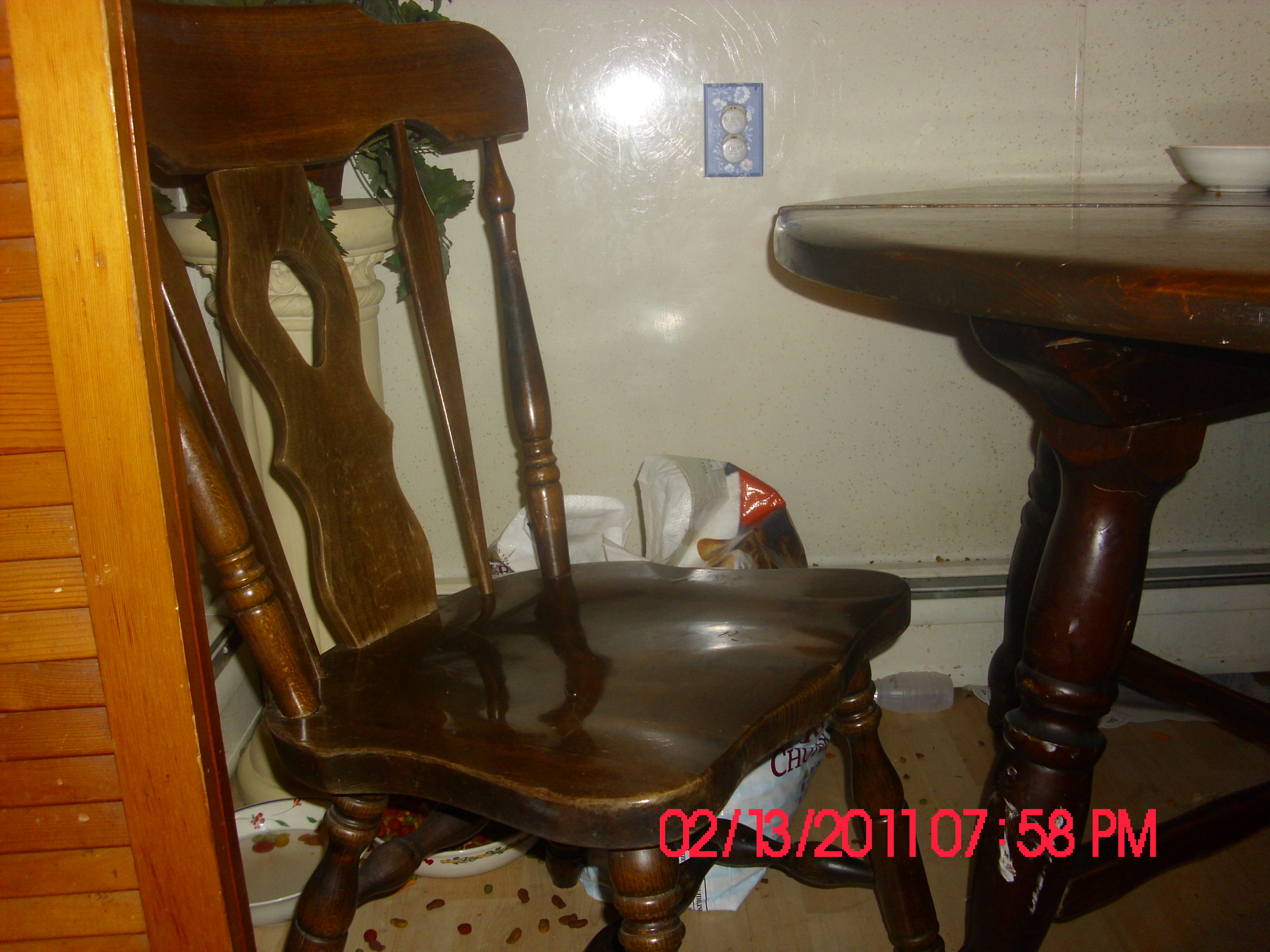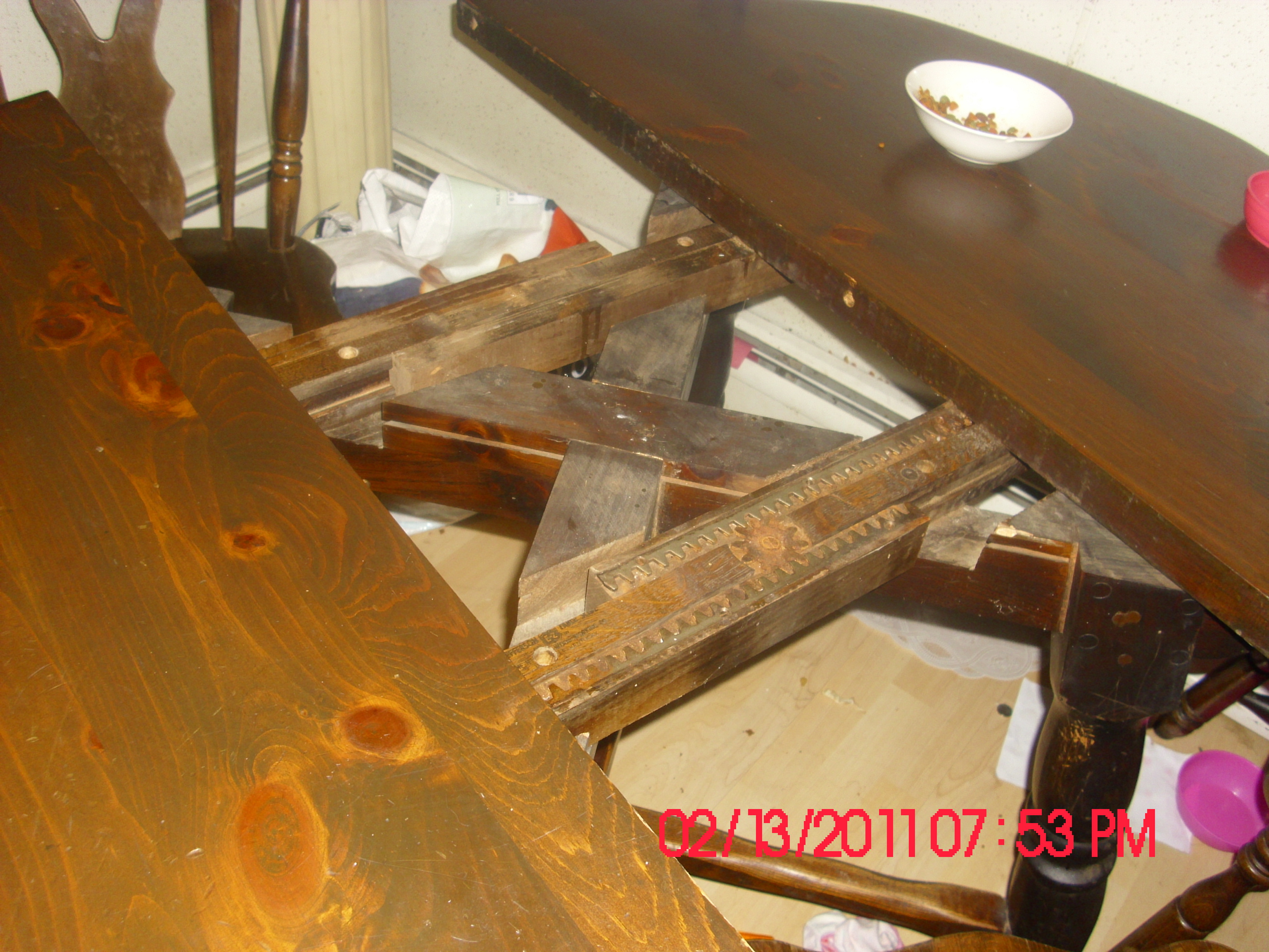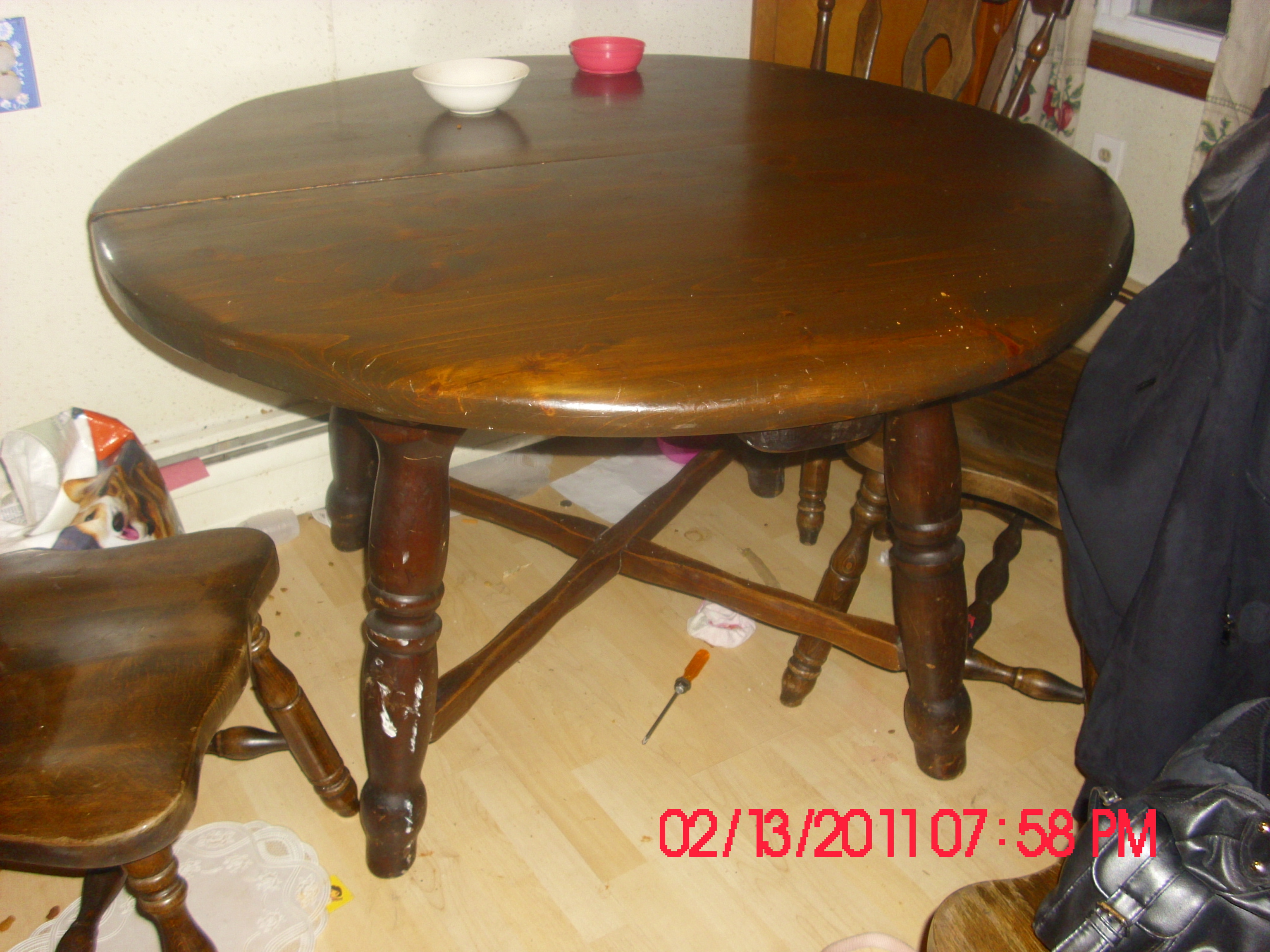 Heavy table with dark wood, two 1 foot by 4 foot drop ins.  When opened up you can see jefferson label for the slide, also can read the name? FROSTY written twice on table as you can see in the picture.  Everything is extremely sturdy.  There is a lot of small dents on the table top, probably from usage over the years. Chairs are marked on the bottom with a SK logo #3802 from fton, NJ?.  (Im quessing that is Afton, NJ)