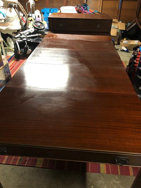 This cabinet is 20" deep and 40" tall in a closed position. When the four leaves are in place the table measures 86" long and 37" tall. The top of the cabinet needs some work, but the leaves are in great condition.