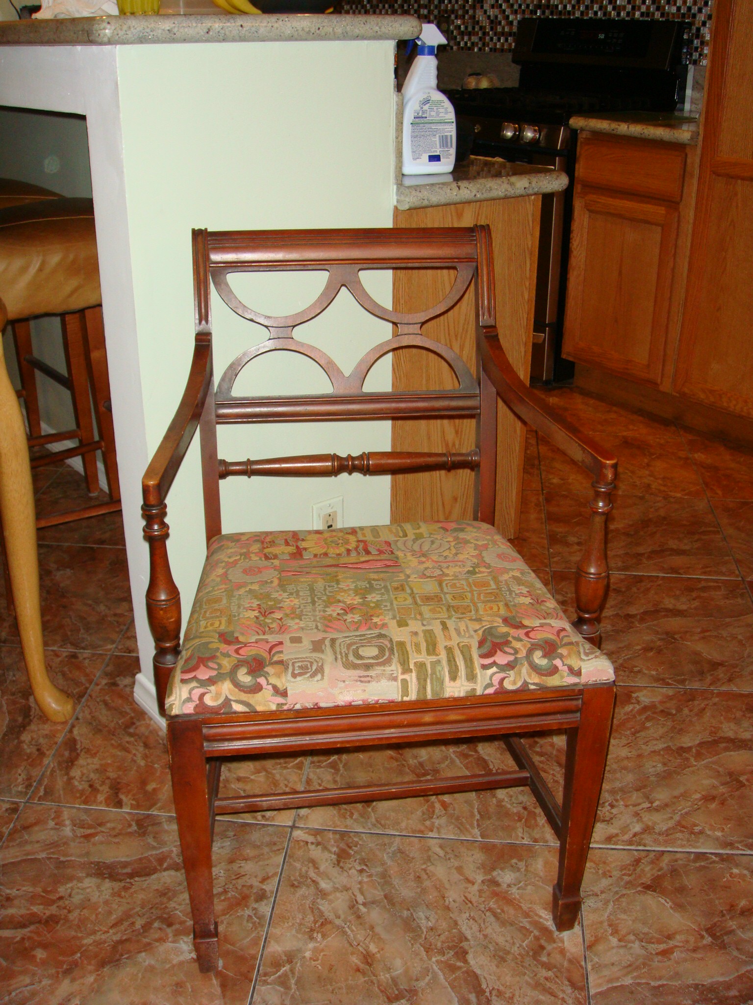 Darker cherry color wood with 2, 3 leg pedestal supports. Slide open for leaf. 5 chairs and 1 arm chair.