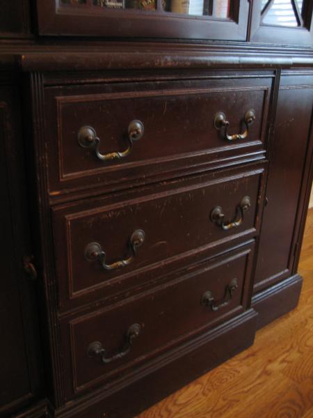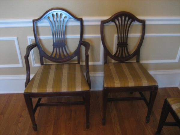 The table has five "double" legs (a pair at each corner and center beneath (10 total). Corners are rounded. Table is 5' without leaf, 6' with leaf. Underneath you pull a metal rod which unlatches the locking mechanism and then the table will slide open to add leaf. The Hutch is same wood and finish. It has glass cabinets on top (the center cabinet opens) and solid wood cabinets and drawers on bottom. The 6 chairs have feet that match table and carved out backs. I have 5 regular chairs and 1 captains chair. The buffet (no picture because it is at my other house) has 3 center drawers and a cabinet on each side with hardware same as hutch. Condition is quite scratched up but construction is solid. I think the set would clean up beautifully. I am just afraid to mess with it because I know nothng about refinishing. I don't know where to go and I wouldn't want someone who does not know what they are doing to ruin its value in any way. Would love suggestions from the experts on this site. Thank you very much for taking a look.