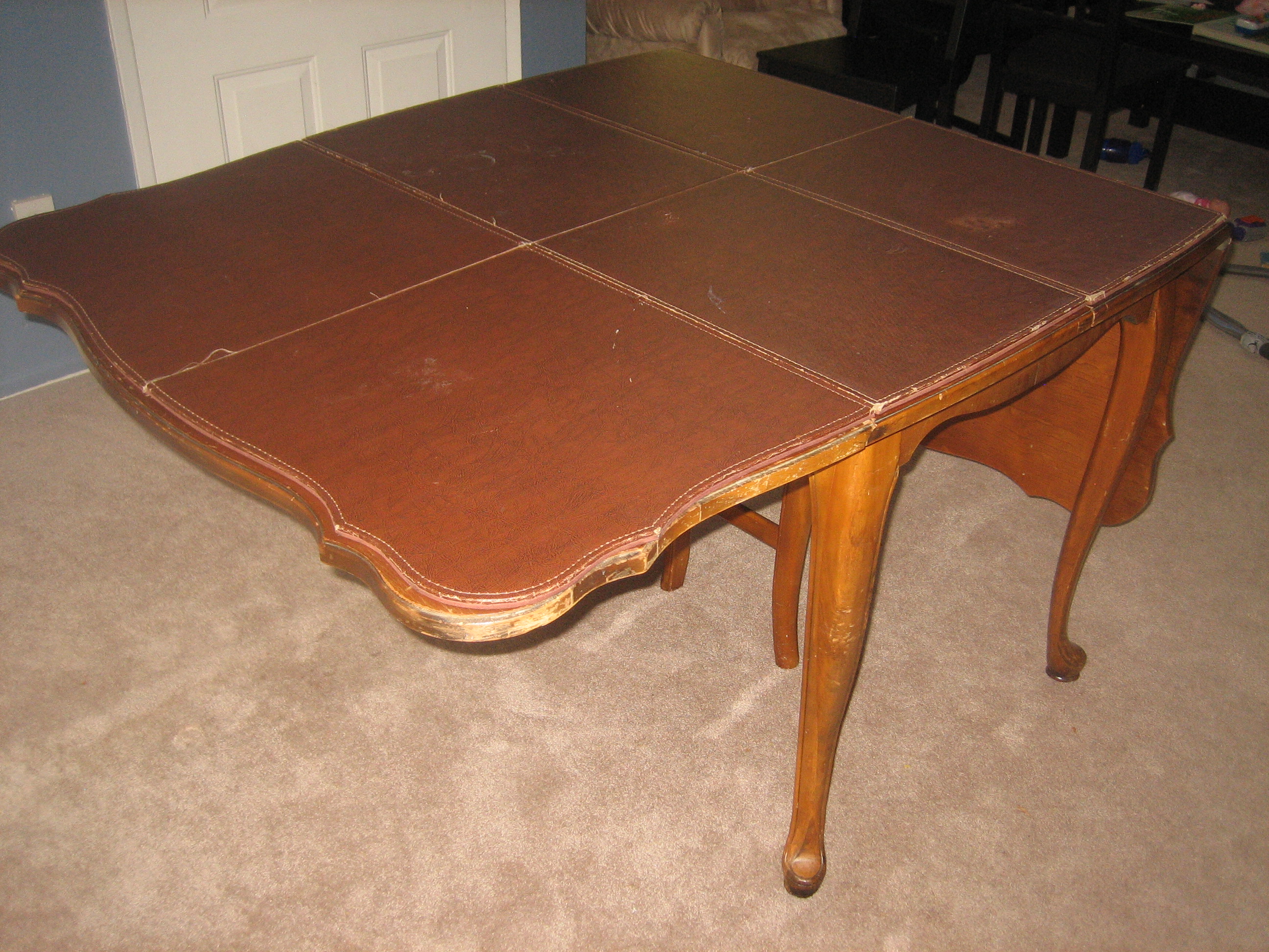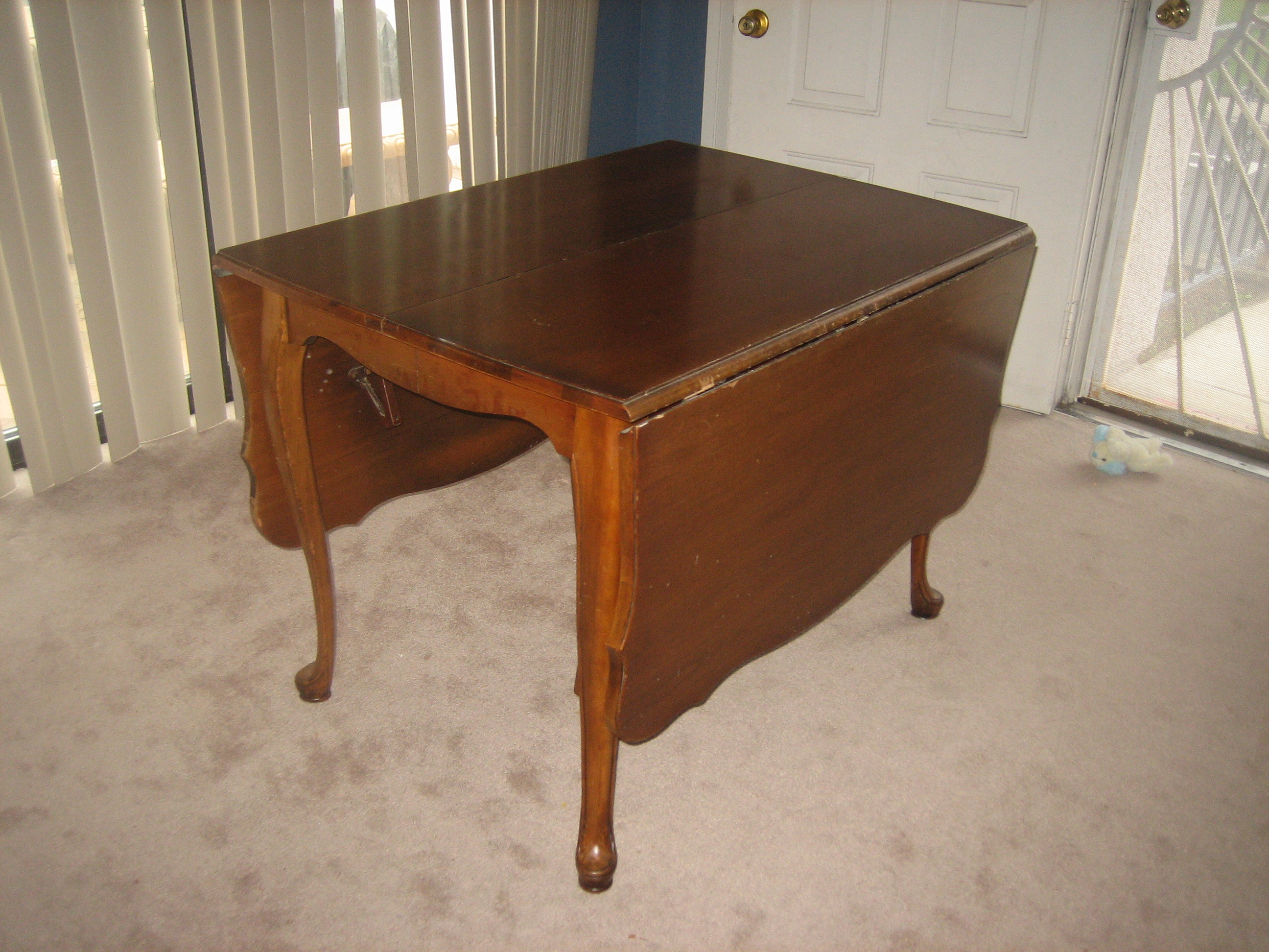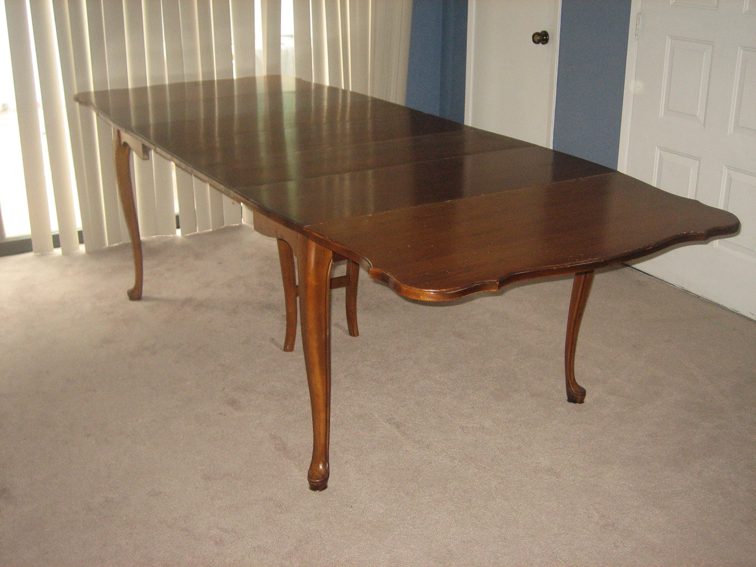 We have this table from the Jefferson Wood Working Co. that we'd like to sell but we don't know how much to sell it for. It can seat anywhere from 2 to 12 people. It has the two sides that can adjust up or down and 3 inserts to extend the table. The legs were recently repaired for any cracks, however the wood definitely has blemishes and should be refurnished at some point.