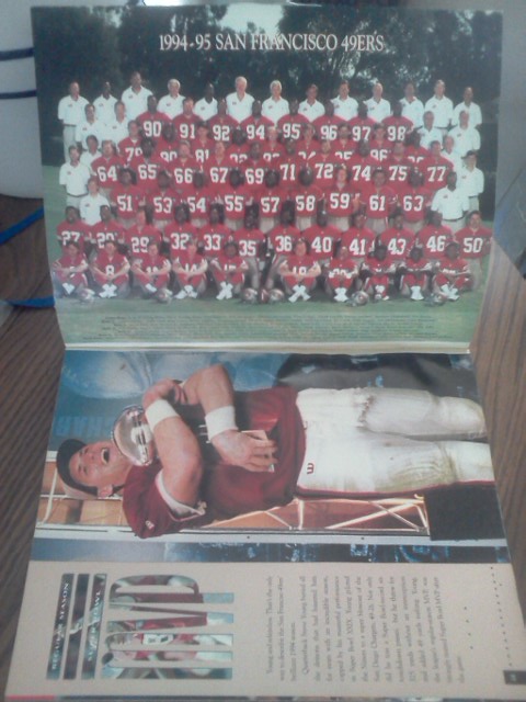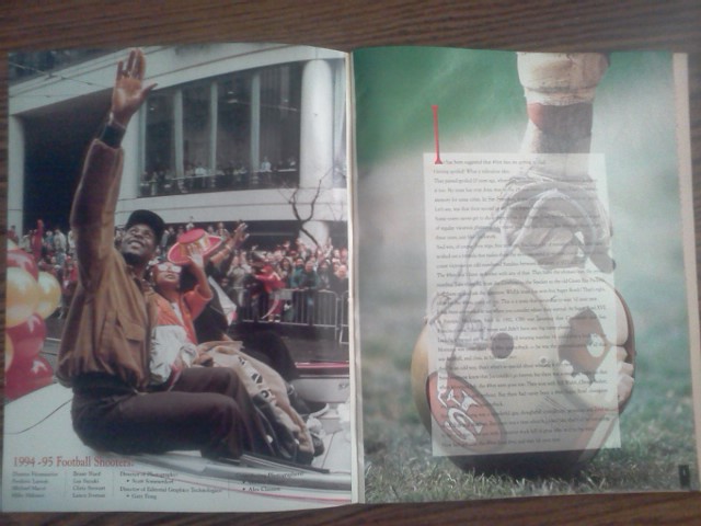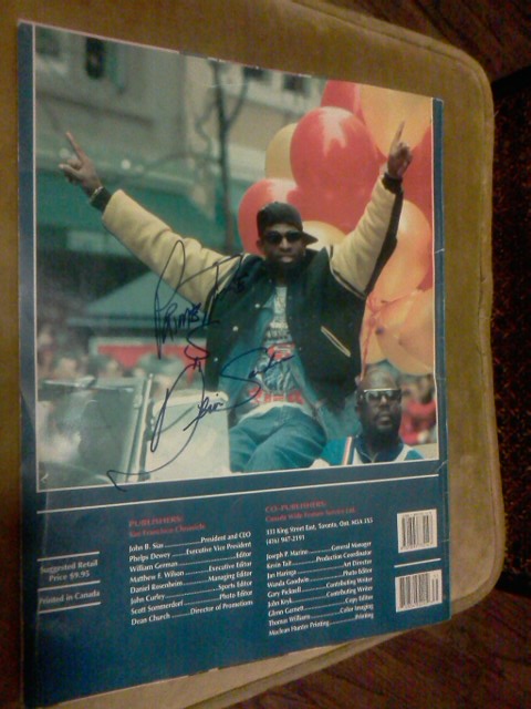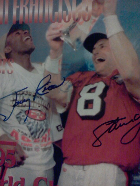 A TRIBUTE FROM SAN FRANCISCO CHRONICLE "1995 WORLD CHAMPIONS" BY C.W. NEVIUS THIS IS A 64 PAGE FULLY ILLUSTRATED MAGAZINE ABOUT THE SAN FRANCISCO 49ERS 1994 SEASON . JERRY RICE & STEVE YOUNG ON FRONT COVER / DEON SANDERS ON BACK PAGE . THIS MAGAZINE IS AUTOGRAPHED BY THE 3 HALL OF FAMERS WITH BLUE MARKER PEN .