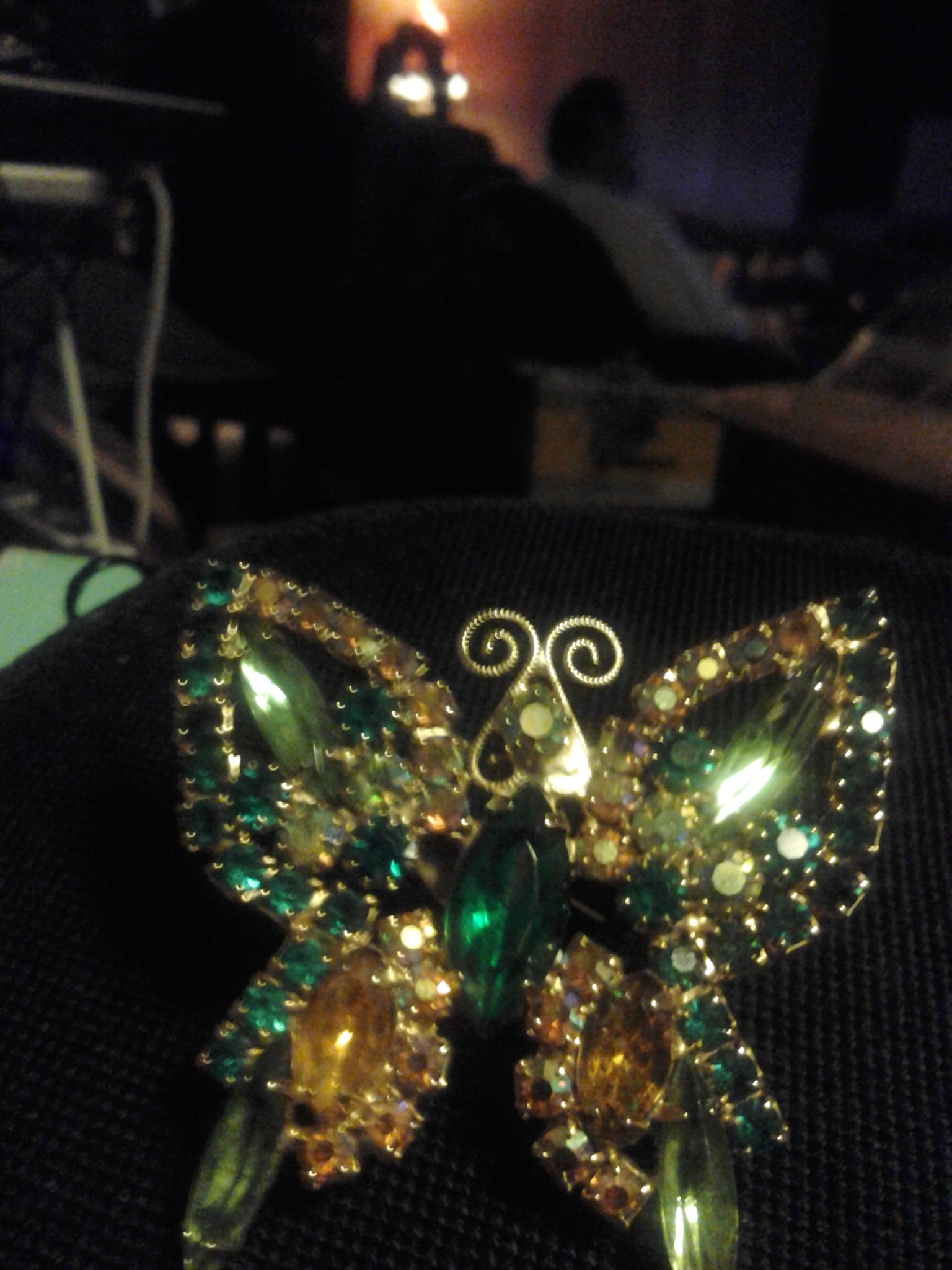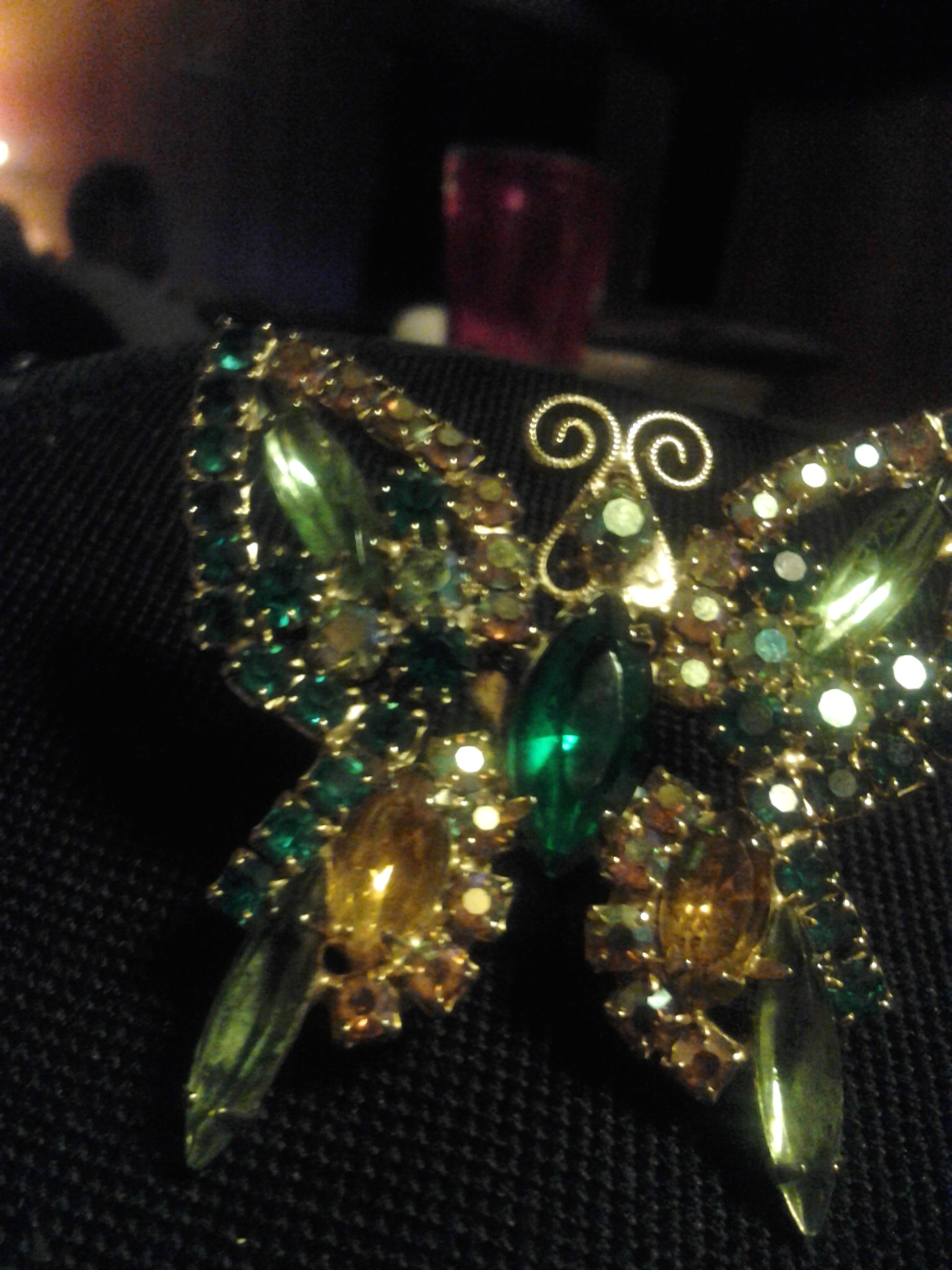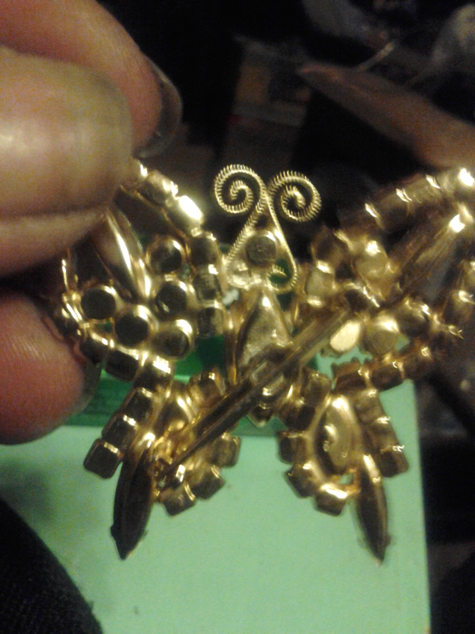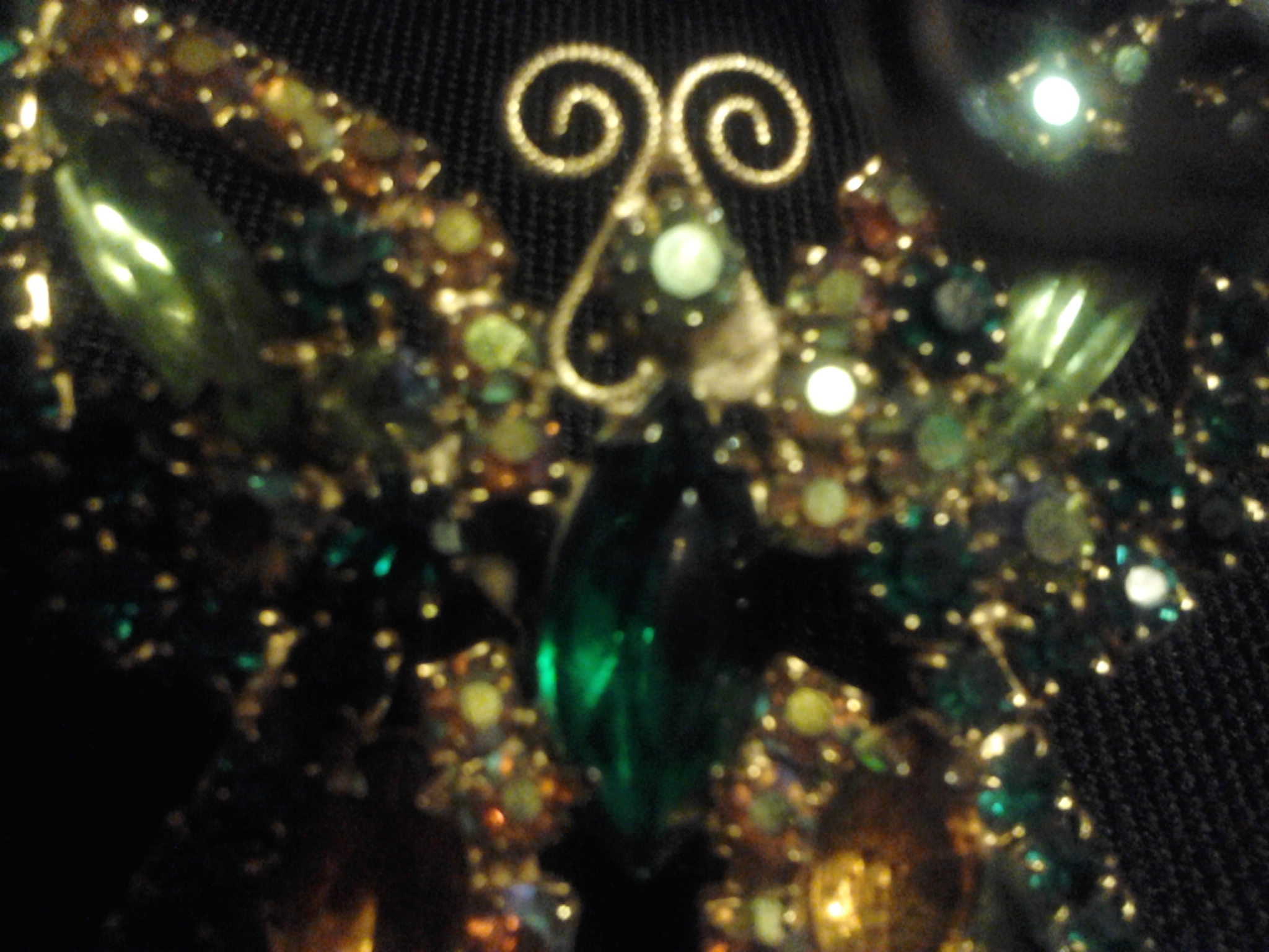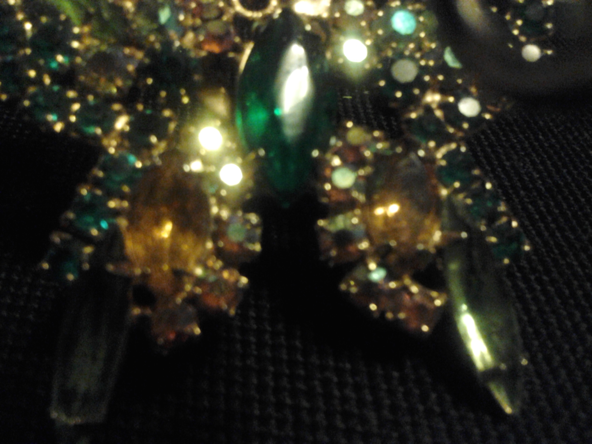 This beautiful broach is done in shades of green & amber. There are no gemstones missing or loose. The pin & lock are intact and fully functionable. The stones are clear & brilliant. The setting are not like those of inexpensive costume jewelery & most stones are held inplace by 6 prong heads. The photos do not do it justice.