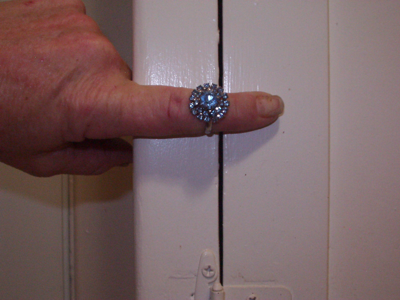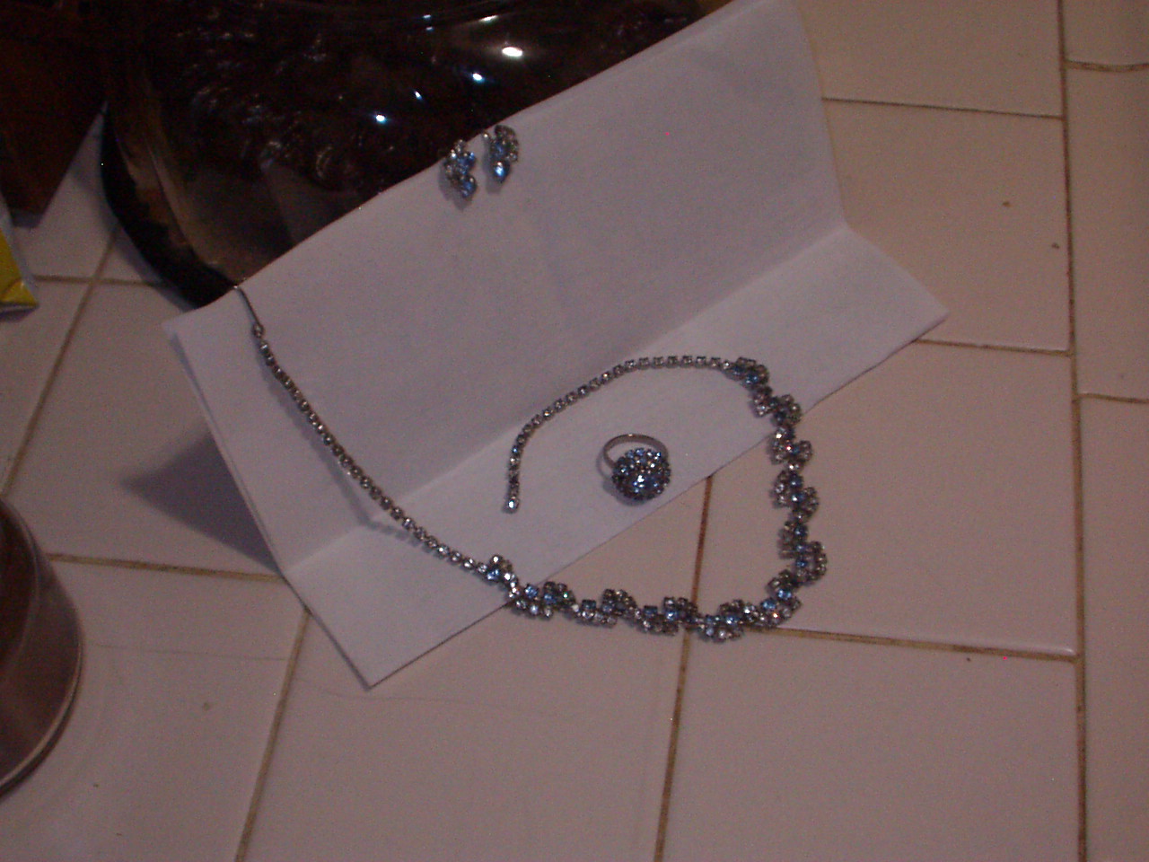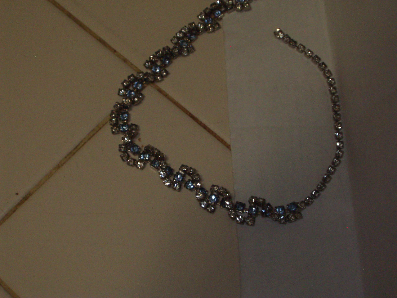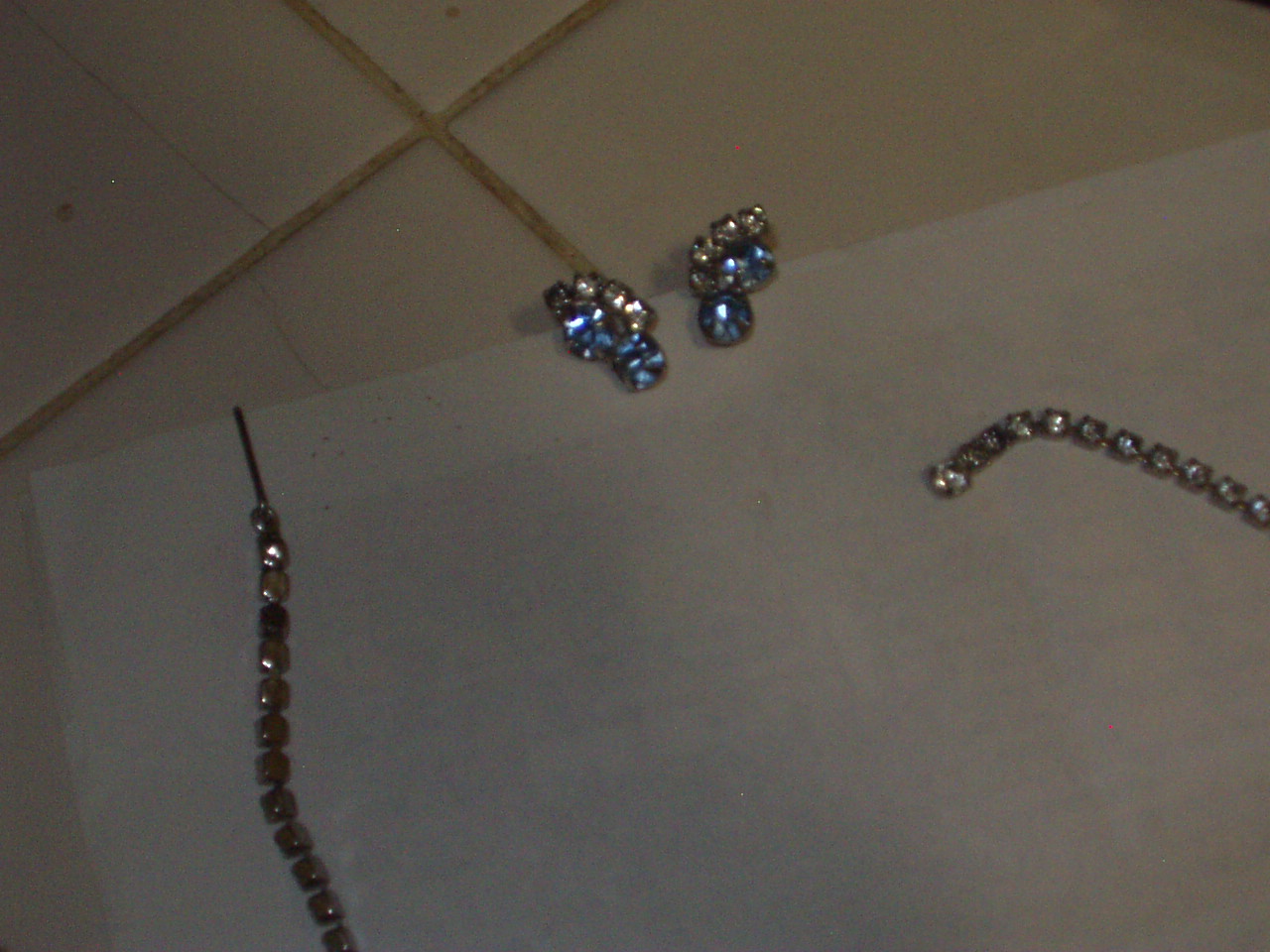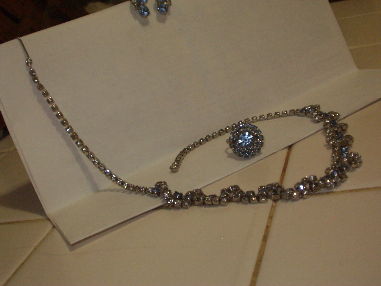 unknown. Recieved from grandmother when she passed away. Beautiful. Approx length is for fit of choker necklase. Design is entirely made from clear & light blue stones - clear stones run together like a diamond tennis bracelet is, then light blue stones are between another string of clear stones running in a S pattern over that. Very hard to describe. Includes necklace/choker, adjustable ring, and screw on type earrings. No markings at all. Possible Sarah Coventry (?) as she also had other pieces by them.
