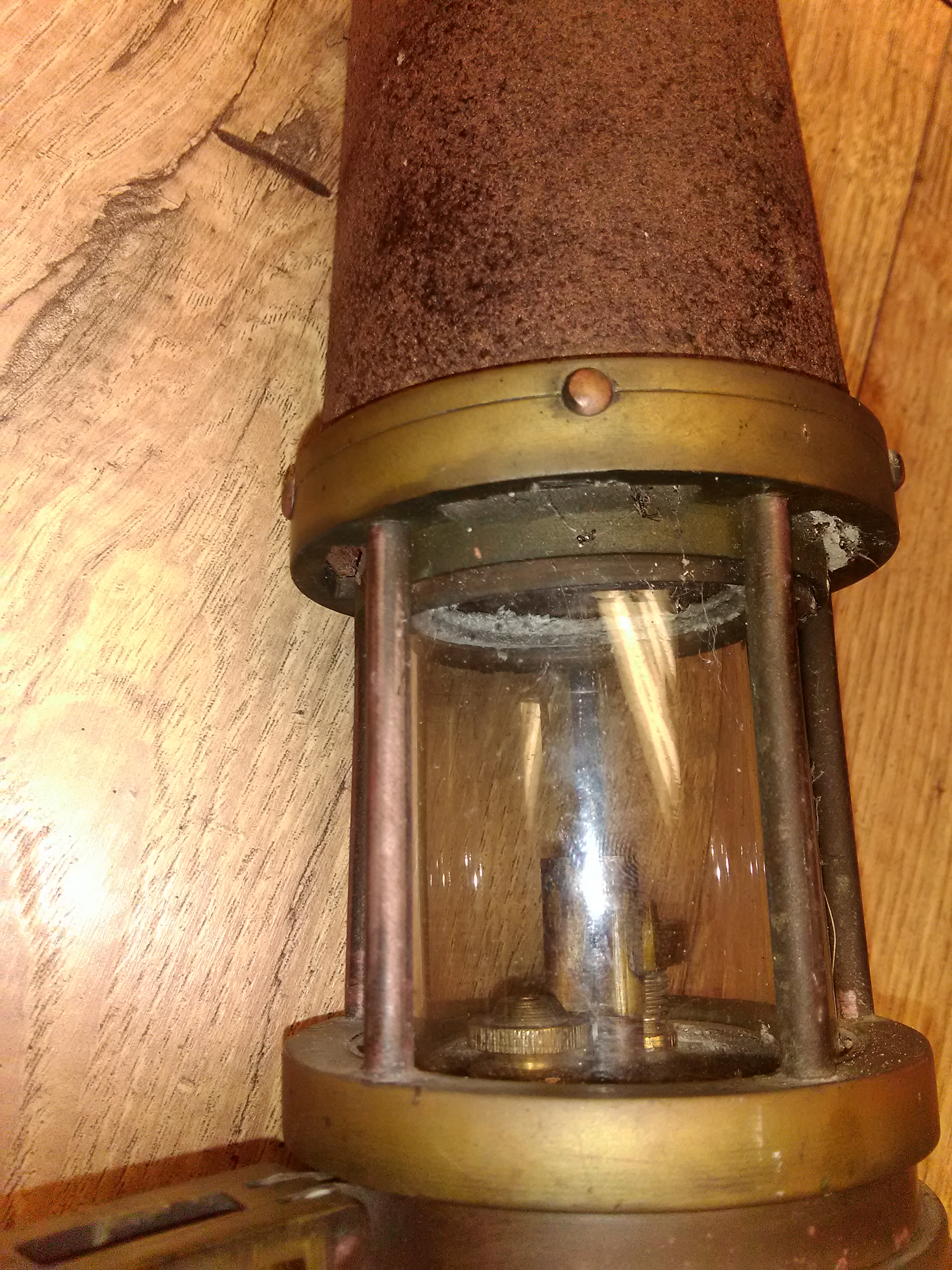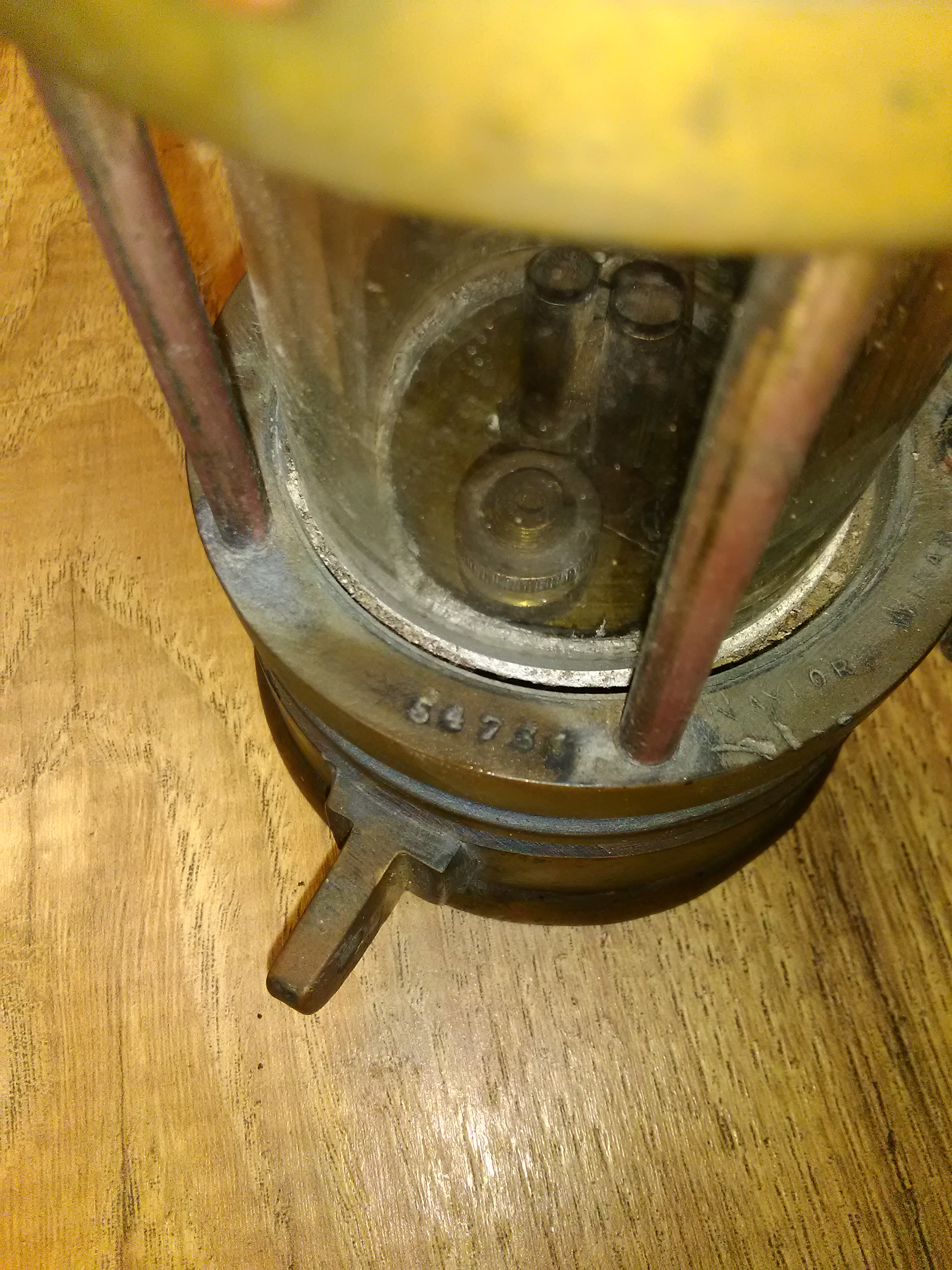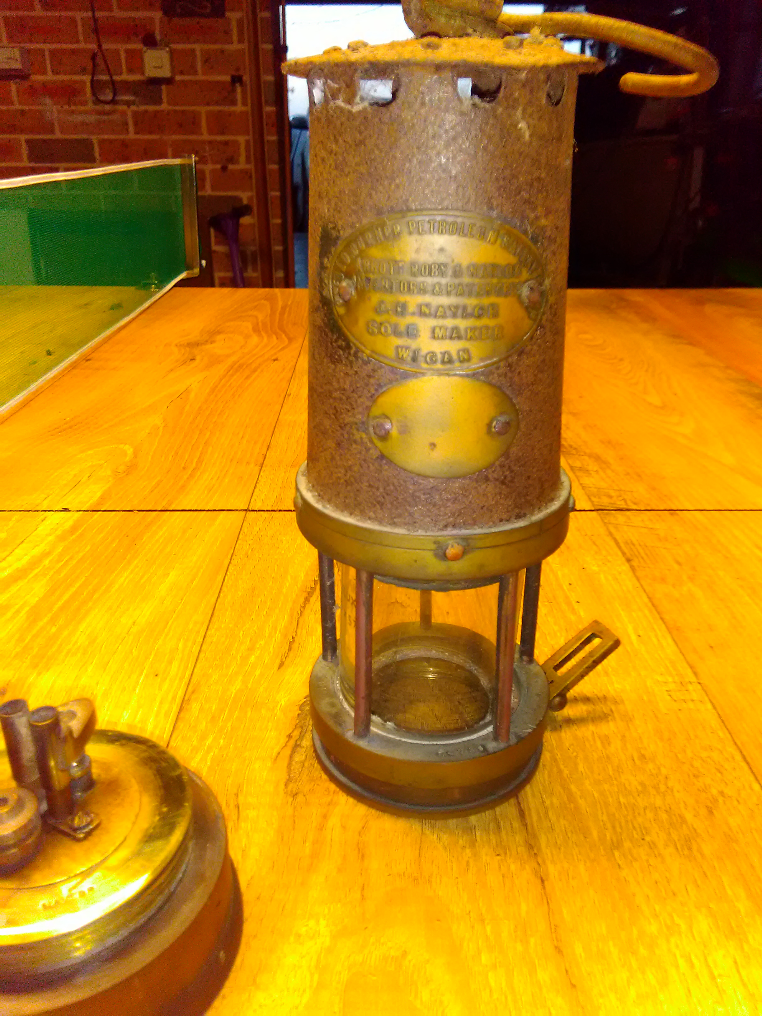 Large brass plate on front reads Abbott Roby & Naylor inventors and patentees. J.H. Naylor sole maker. Bifold Burner Petroleum Safety Lamp.