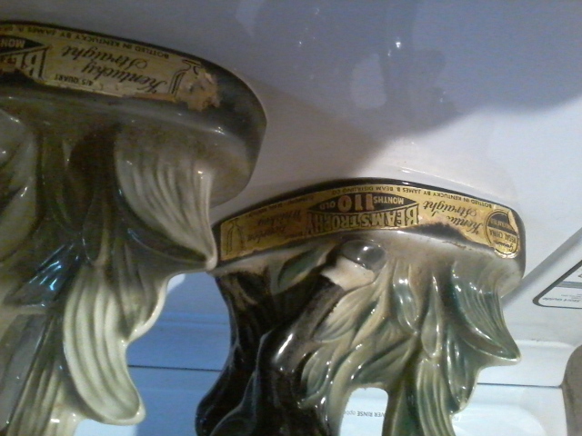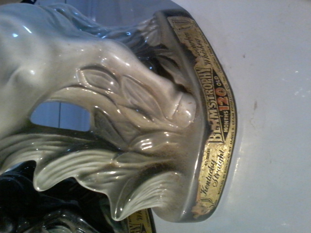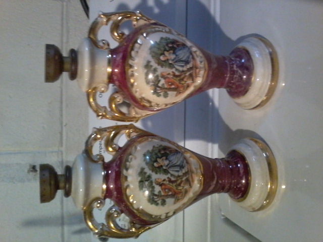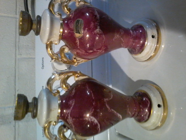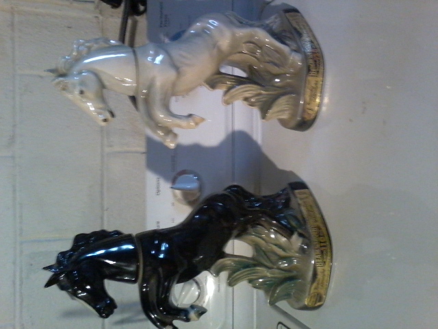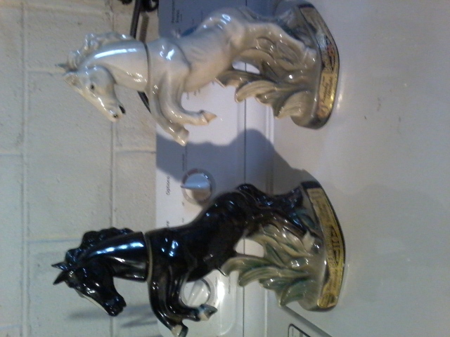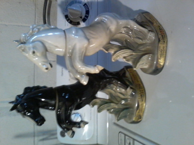 Your lamps dates from the 1940's, my Mother had one given to her as a wedding present (new) in 1948. They were made in several sizes, no huge value though, they were a mass produced item. We'd retail one in very good condition for less than $150.00. The horses are Jim Beam Decanters, most of these date from the 1970's through 1980's and now sell for under $35.00 in most cases.