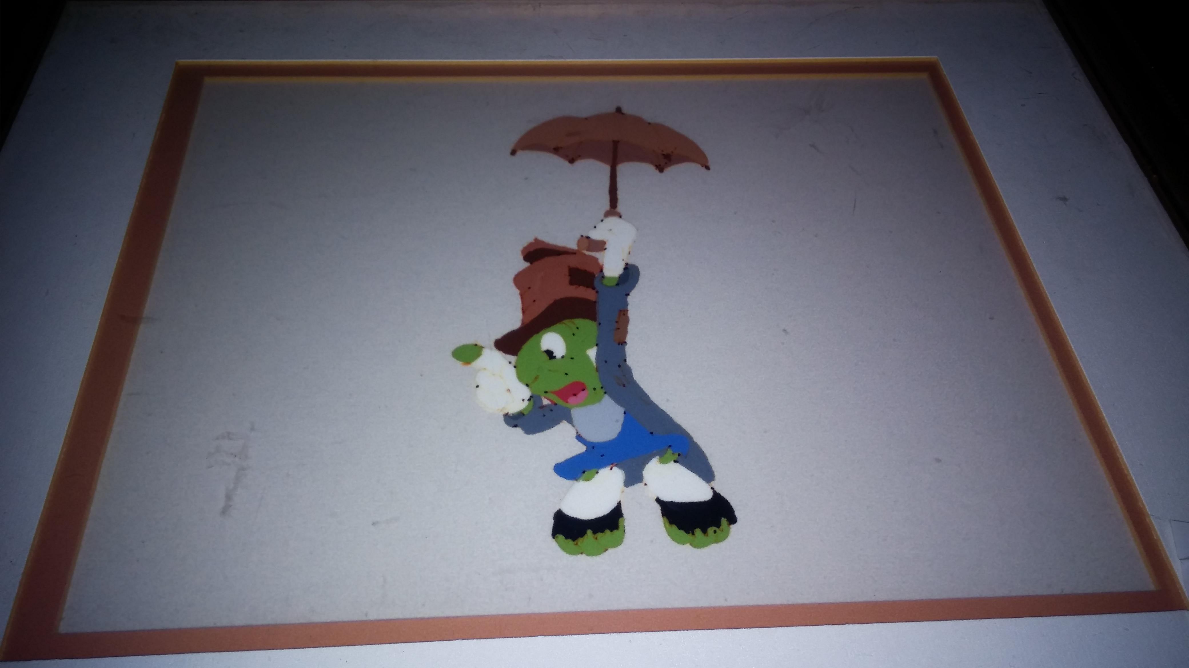 I have this framed Jiminy Cricket artpiece and wanted to know more about it if anyone knows anything about it. It appears to be painted on and I don't know but there are black dots on it for some reason, I am assuming for rough draft purposed or related.