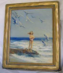 This is a painting depicting a child and a seascape by Joane Cromwell and appears to be oil on a canvas board and I have heard that paintings by this artist of this size of landscapes and seascapes can go up to 3000 dollars and it is signed by her in the original frame with a brief artist's biography in the back.