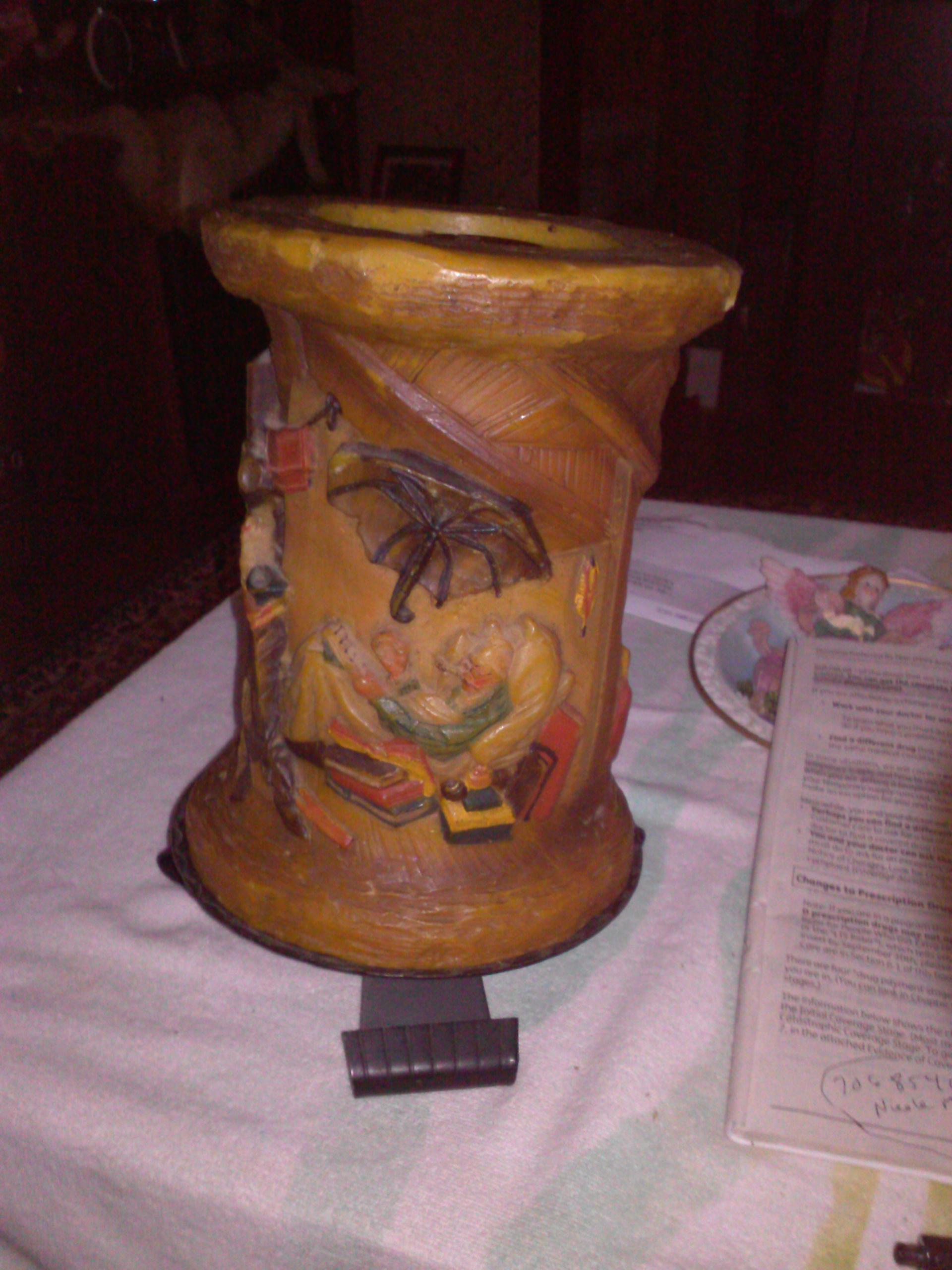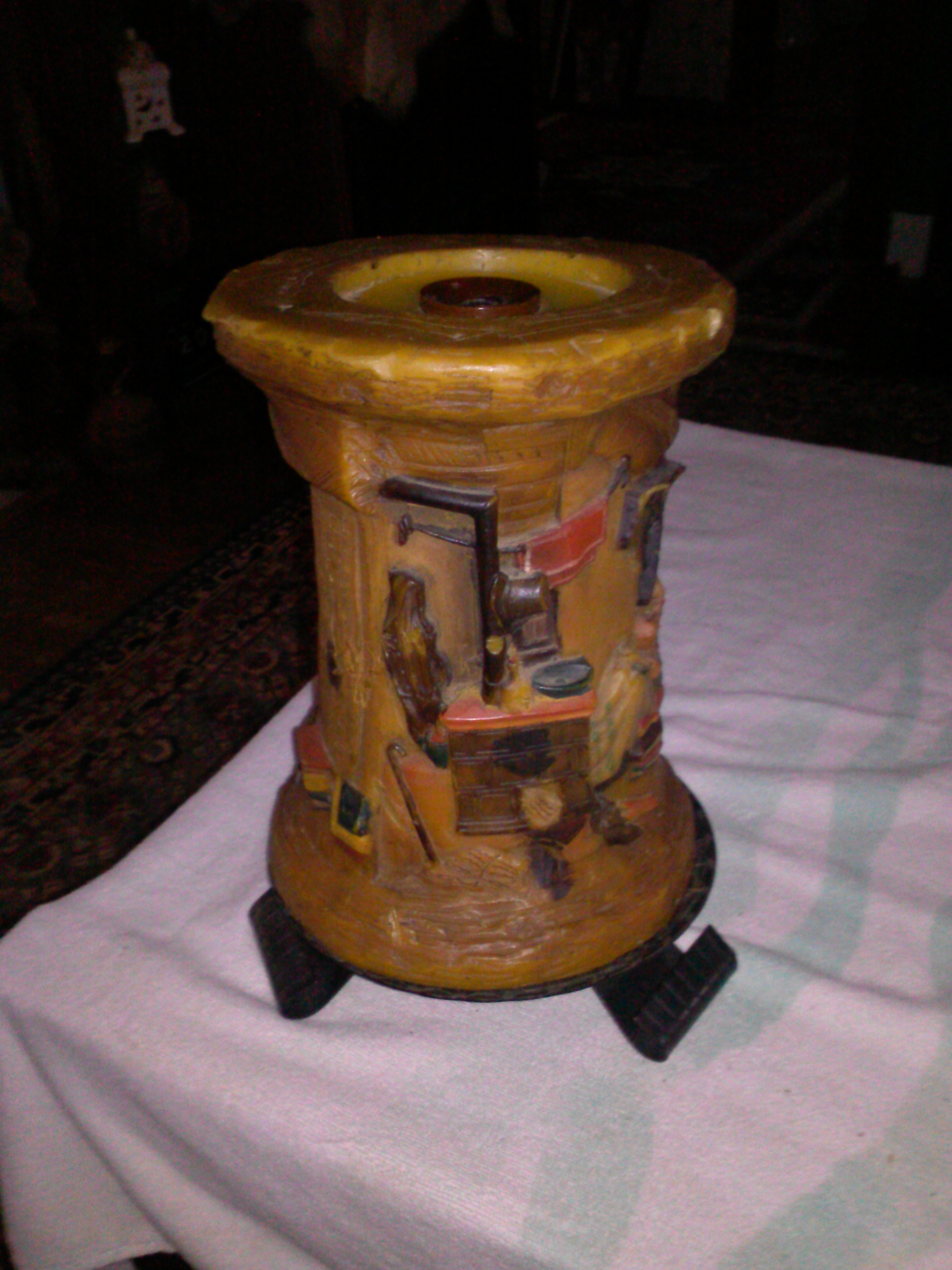 Johann Gunter handcarved candle. Old man relaxing in front of fire. Very minor damage to top. Has spring loaded insert and metal base. Candle is 8 3/4 from base to top. Not including wick top. Not sure of circumfrence.