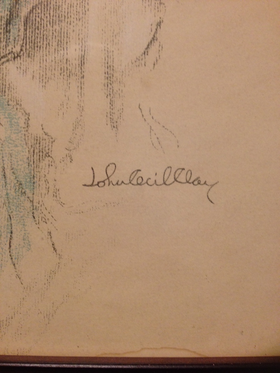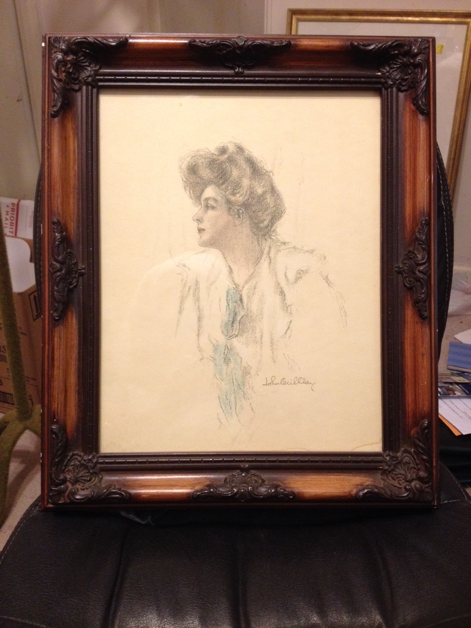 I really like this sketch, which looks to be done with pencil or charcoal.  I can't find this particular print online to determine a name or value.  Please advise.  Beautiful framing, good shape - looks like some water damage to bottom right corner.  Ornate and beautiful frame.