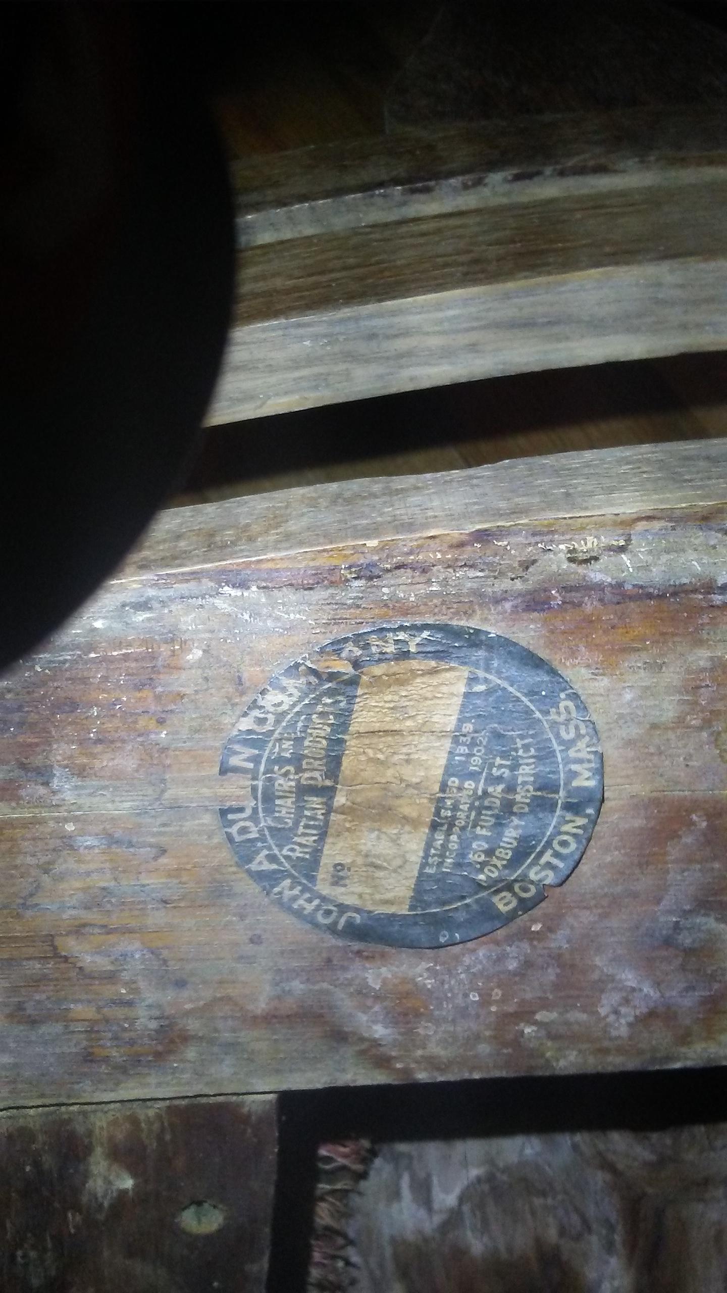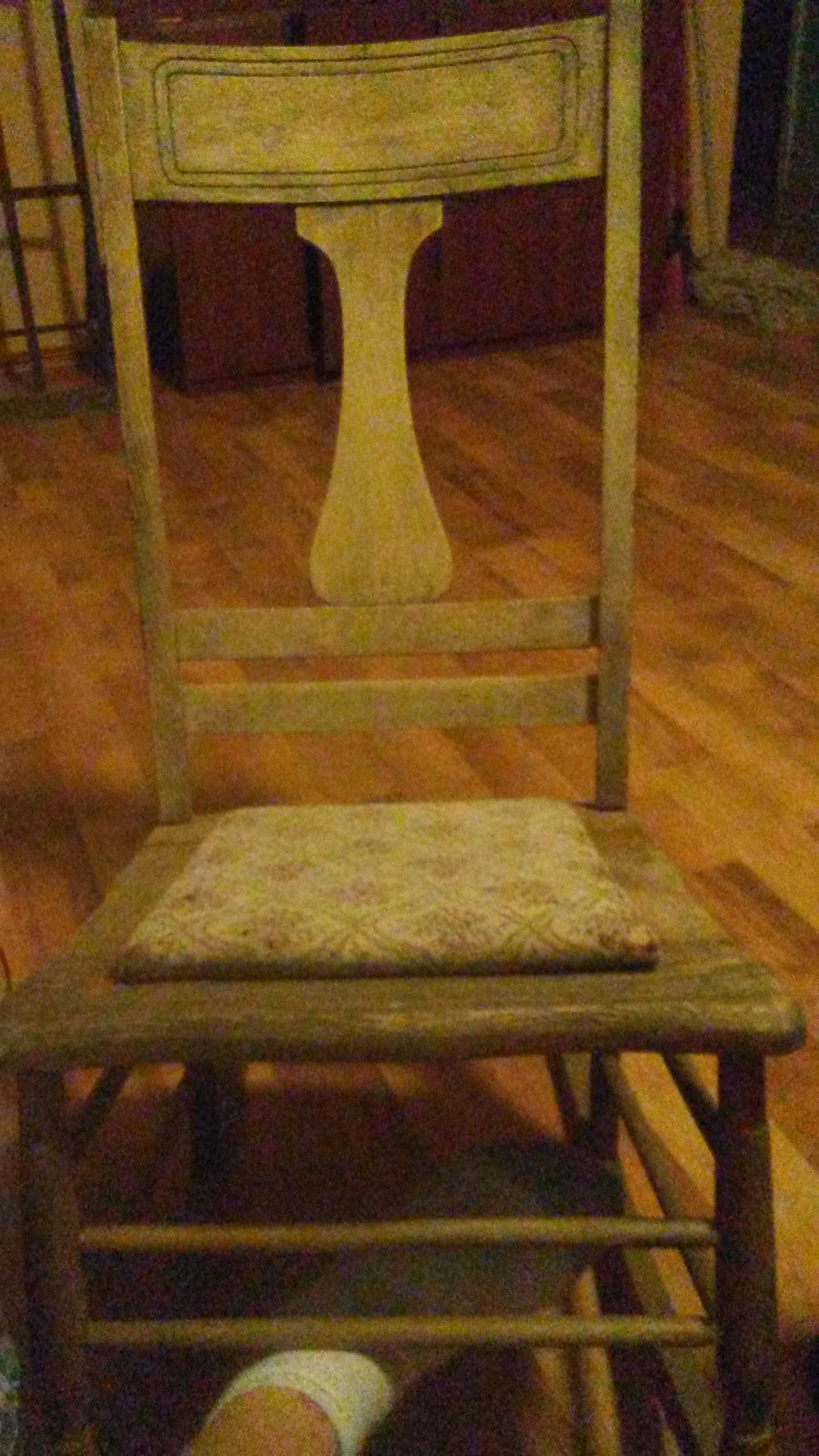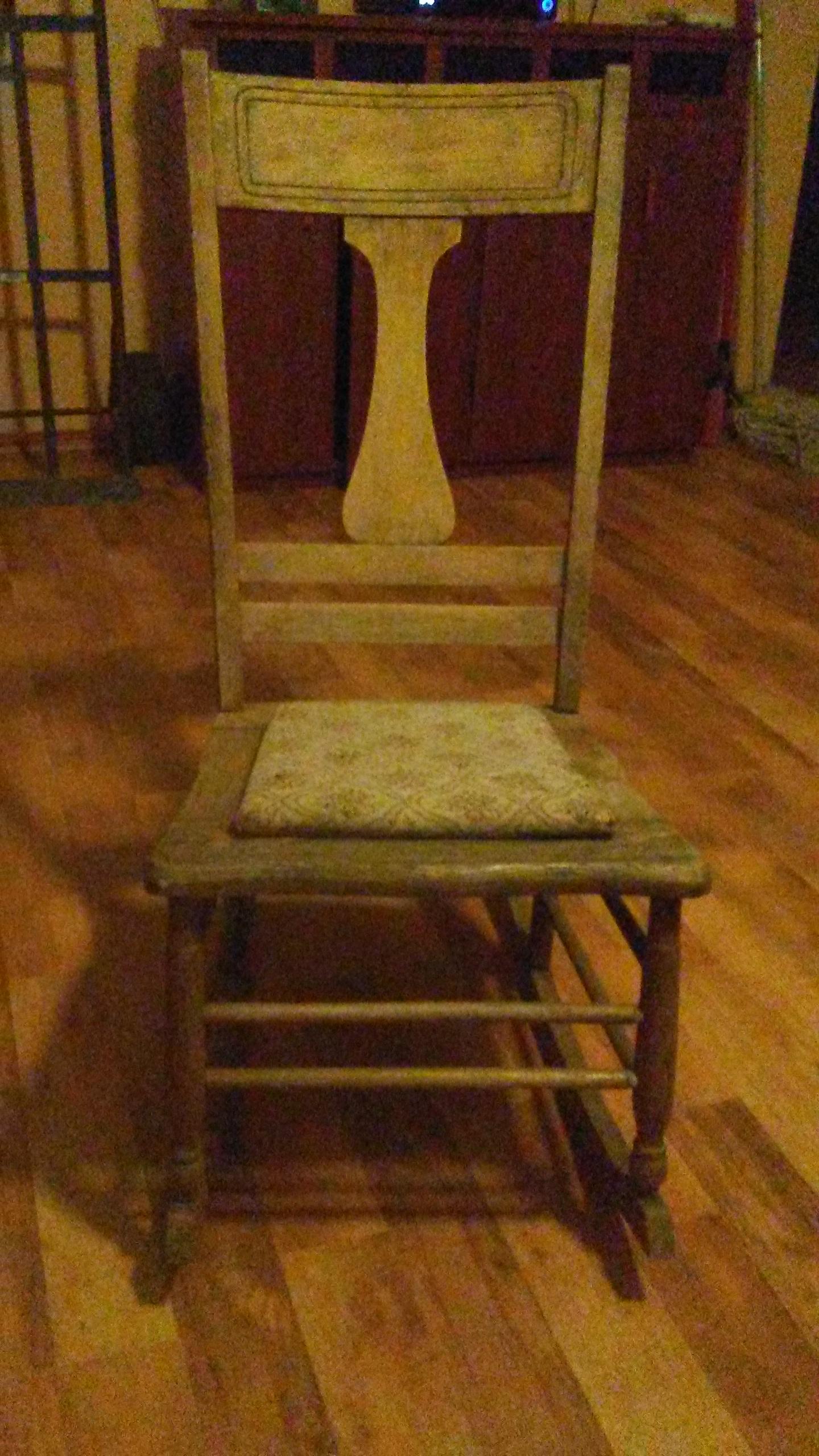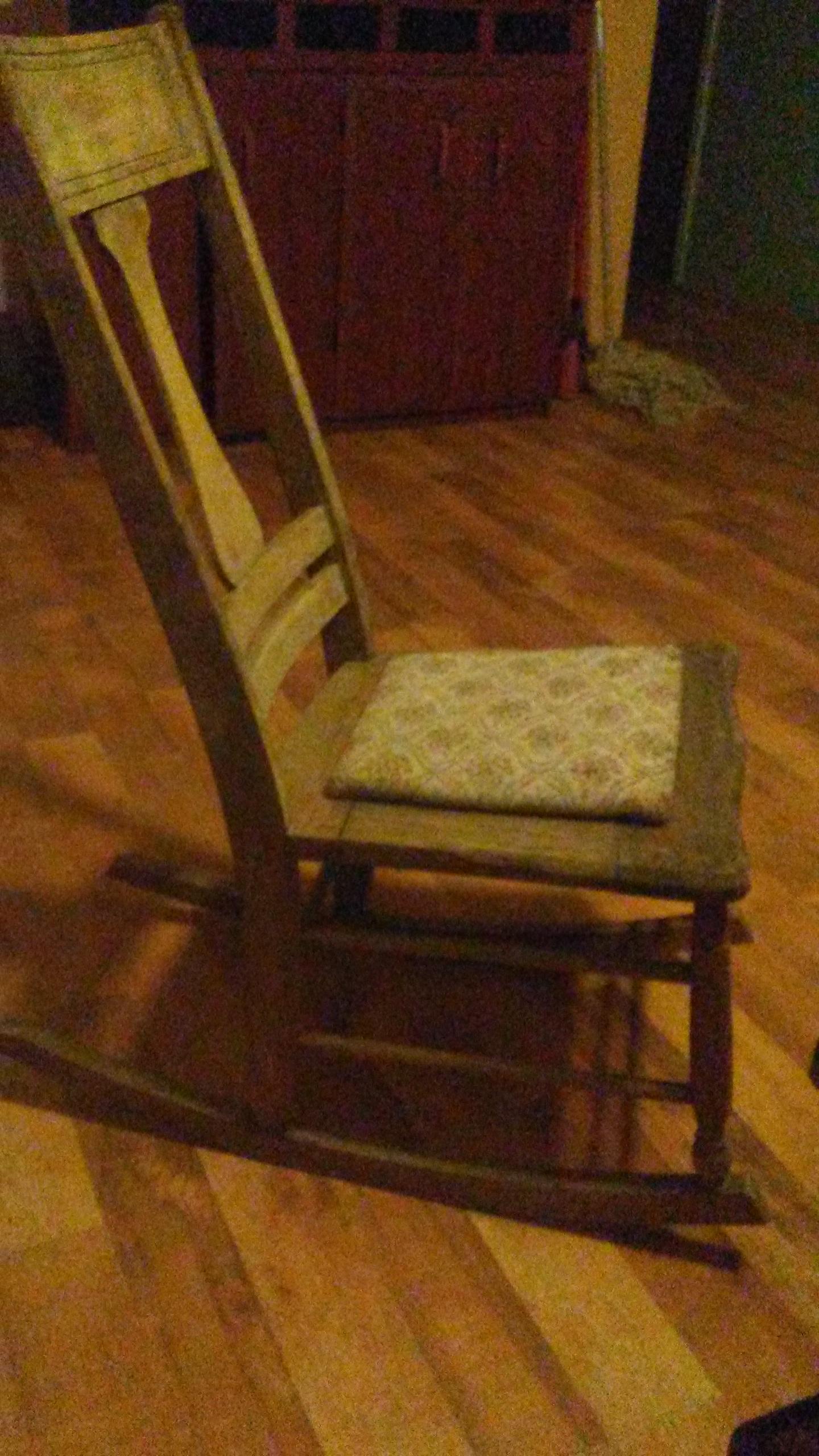 This is a small rocker with small fabric cushion seat.untouched. sticker on bottom has a number barely legible. ..i think. ..3214 or 8214