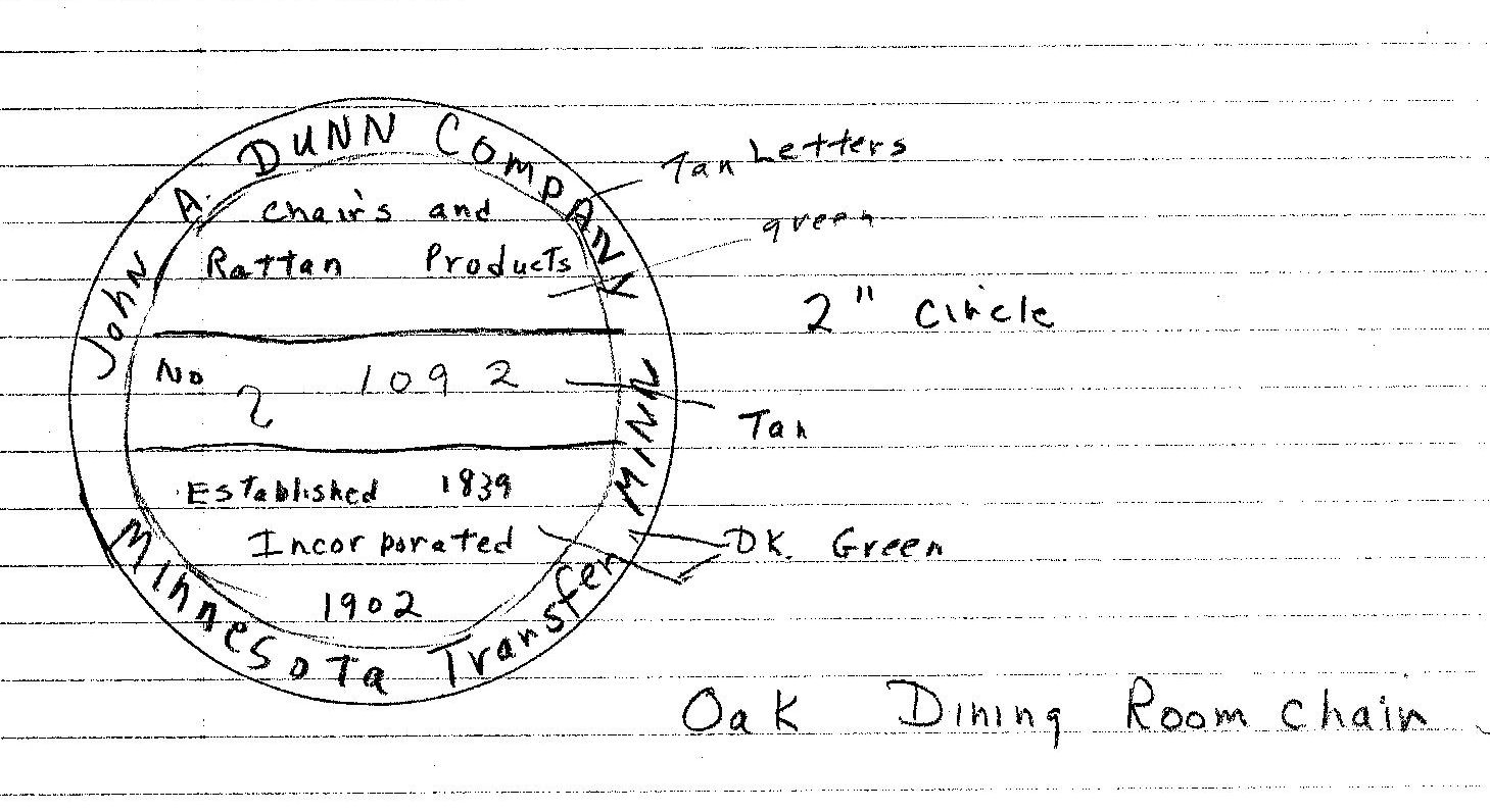 My sister-in-law has asked me to find out some history about this chair. I am attaching a photo of the chair and a photo of the sketch she made of the circle & words on the bottom of the chair. It is oak, standard dining room chair size, fairly heavy weight, and has the following information on the bottom: "John A. Dunn Co., Minnesota Transfer, Minnesota, Established 1839, Incorporated 1907, and No. ? 1092". The question mark refers to a mark like a backwards "S". Any information we can get will be greatly appreciated. Thanks.