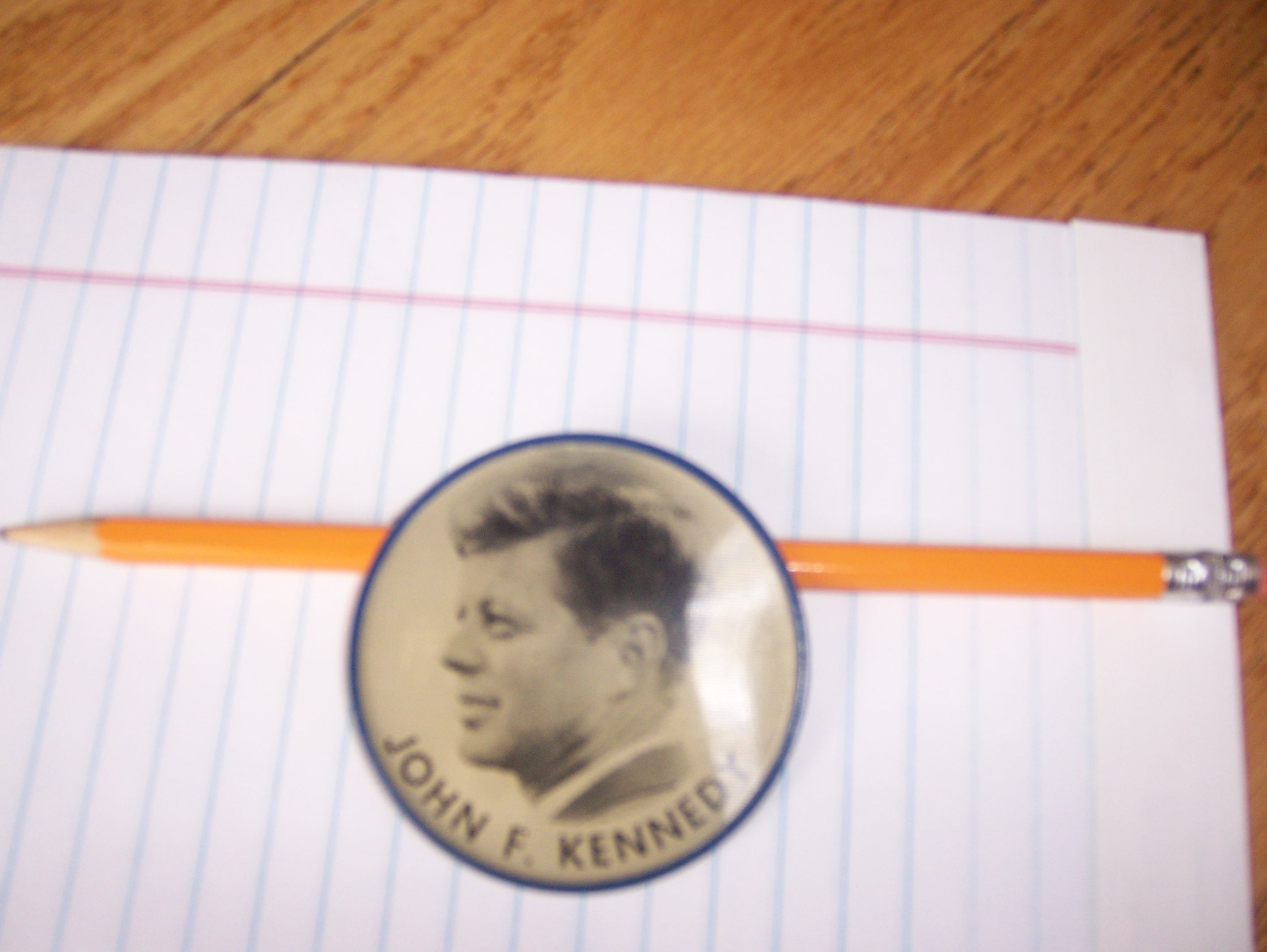 A polictical button for John F. Kennedy, when you move it one screen says "The Man for the 60"s" and the other screen has a picture of John F Kennedy with his name along the bottom. It has a blue back and the pin is intact. On the back top it says: Automatic Amusement Co., Sales Ref, 637 Liberty Ave, PGH.PA66-(rest of numbers unreadable). Under the pin it says, VARI-VUE by Pictorial Productions, INC, MT. Vernon, N.Y. USA, Pat No. 2,815,310