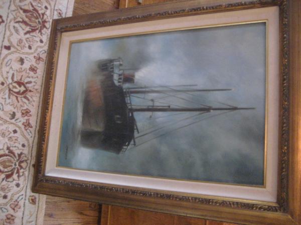 Original Oil Painting by Maritime artist John Kelly..On back of canvas frame, in pencil, says "Lumber ship off Redwood coast".