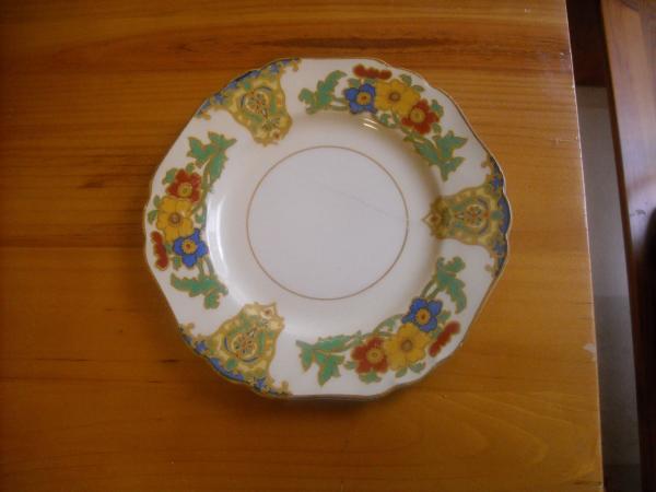 it has a gold trim with blue red and yellow flowers around the edges and on the back it has the crown symbol with ribbon and the name of the manufacture under it, it also has a letter A on the back as well
