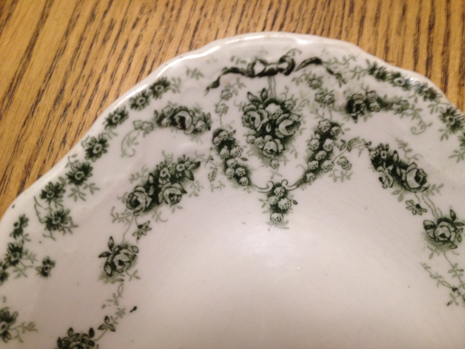 I recently discovered a small platter 8" by 6" in my basement which I have identified as John Maddock & Sons Ltd Royal Vitreous Empire. The pattern is a green rose garland & ribbon around the scalloped edges of the plate. I looked all over the internet and could not find a match but did find reference on Replacements.com however no photo to compare. The stamp dates the platter between 1896 and 1906. I would greatly appreciate any information available to share about the pattern and any thoughts on value.