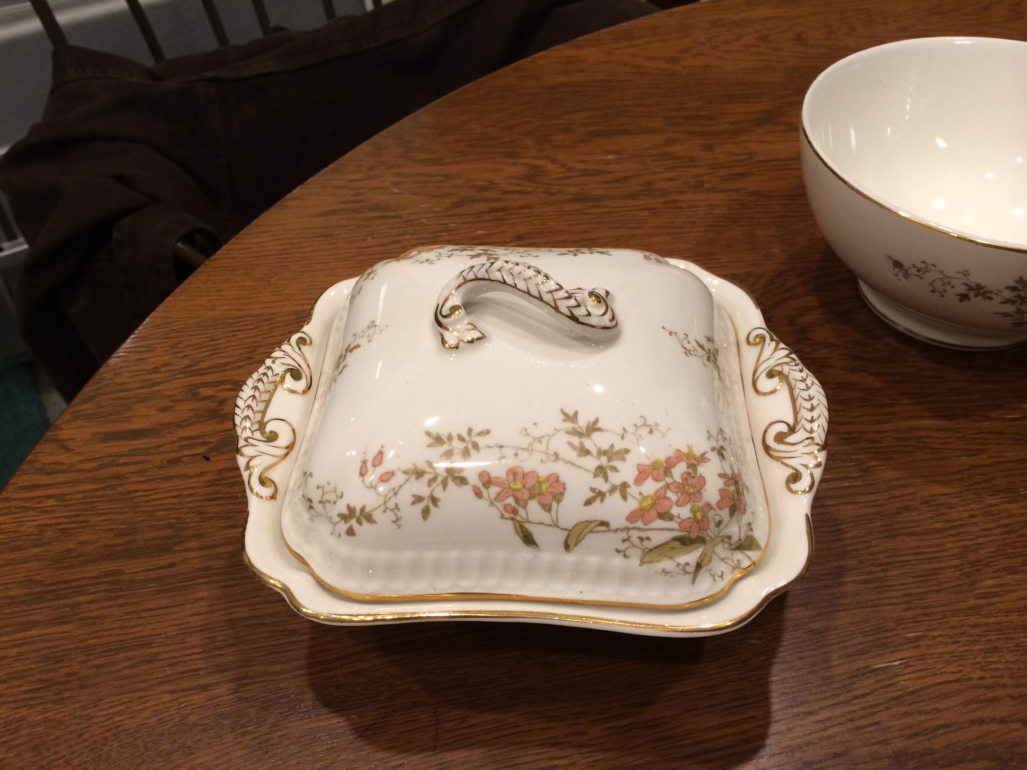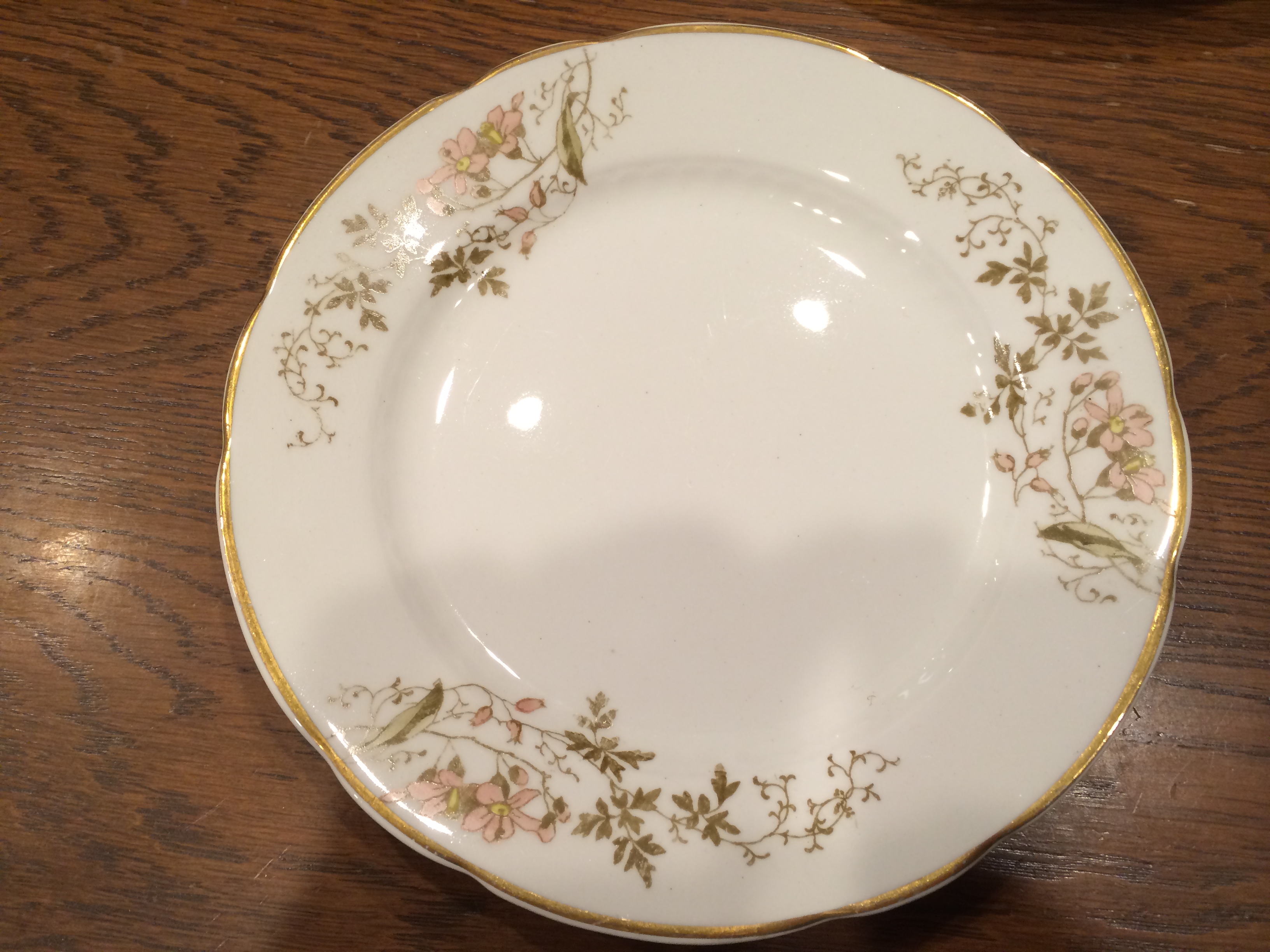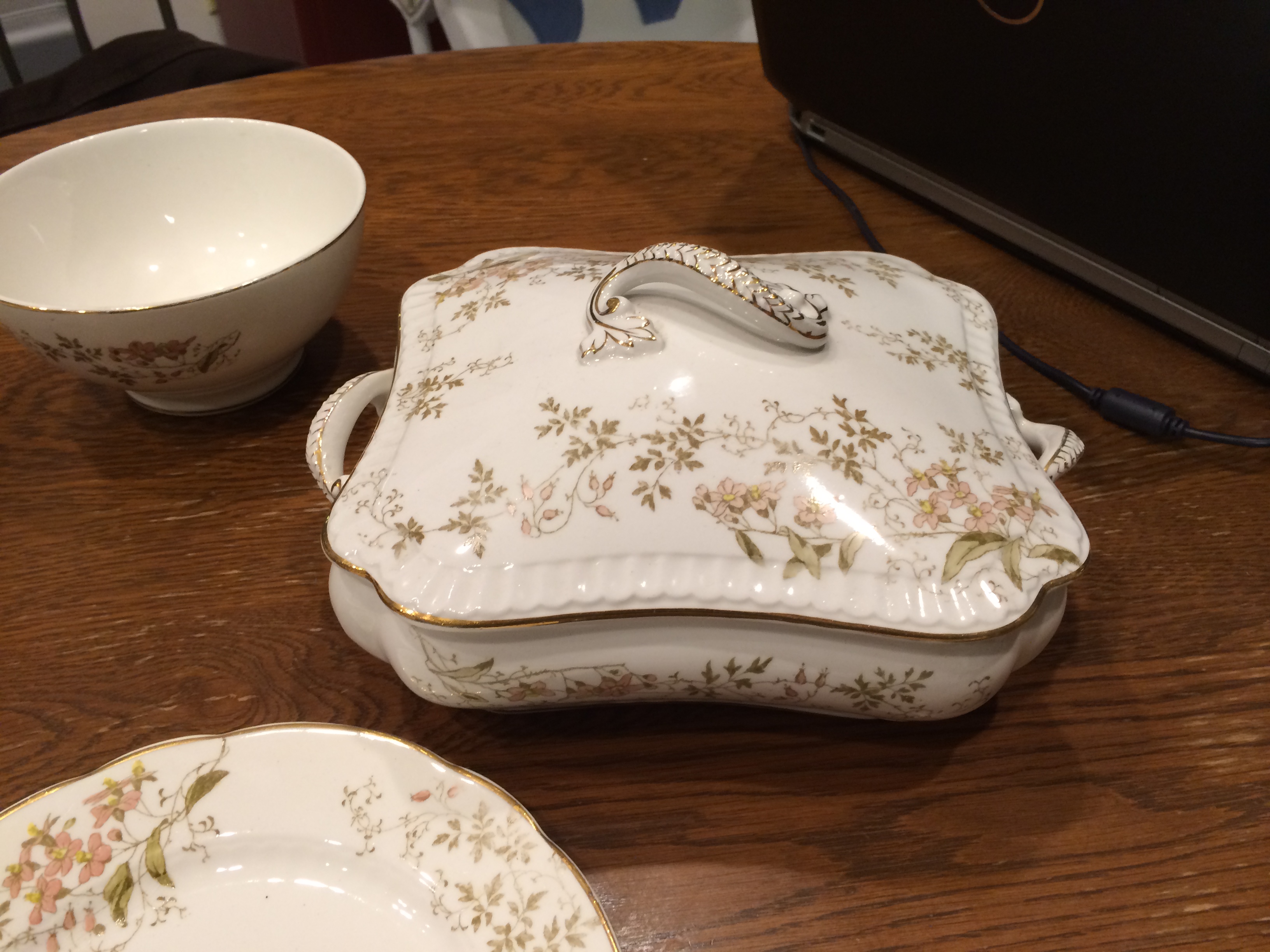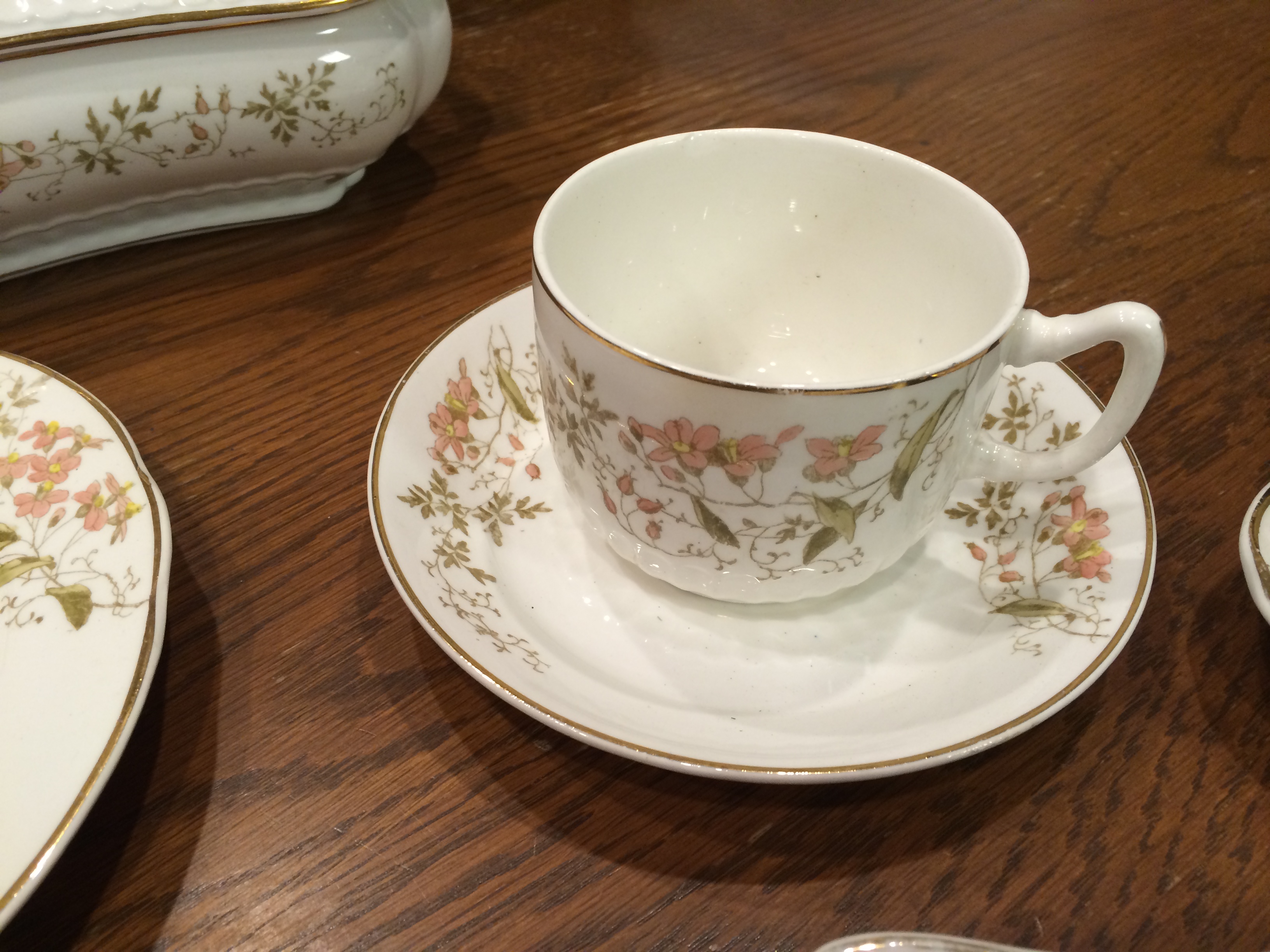 Set for six including 6 dinner plates, 6 desert/salad plates, 6 small plates, 6 cup and saucers, 6 square small plates, 6 "mini" square plates, 1 serving bowl, 2 covered serving dishes, one platter, one rectangular serving dish