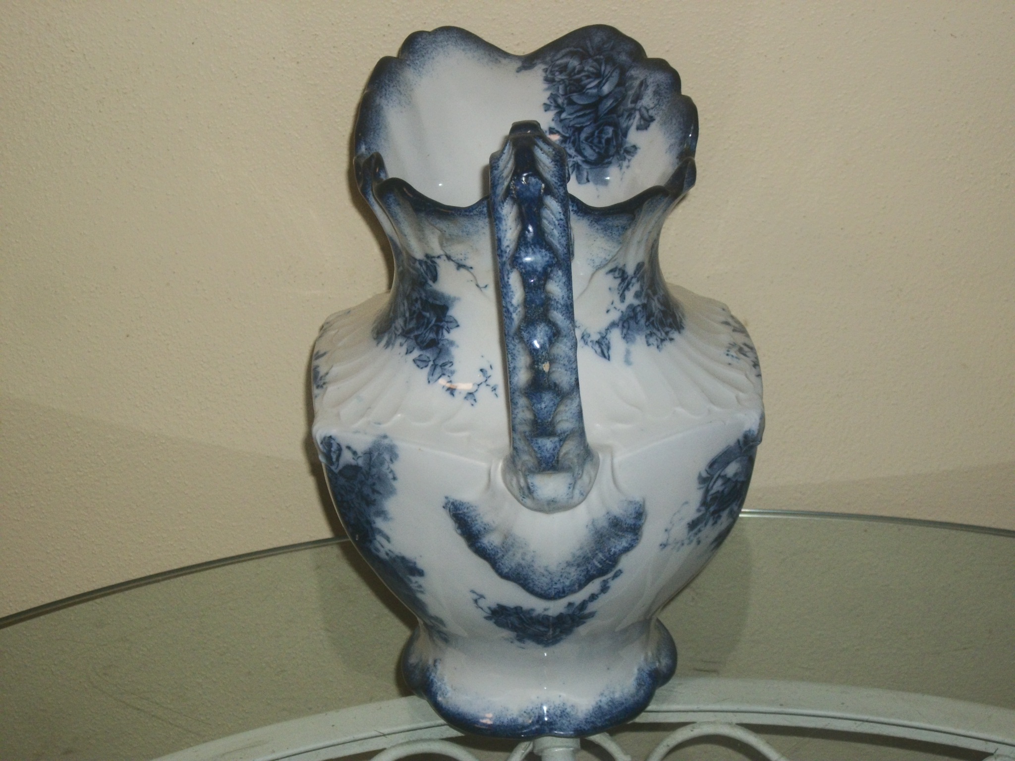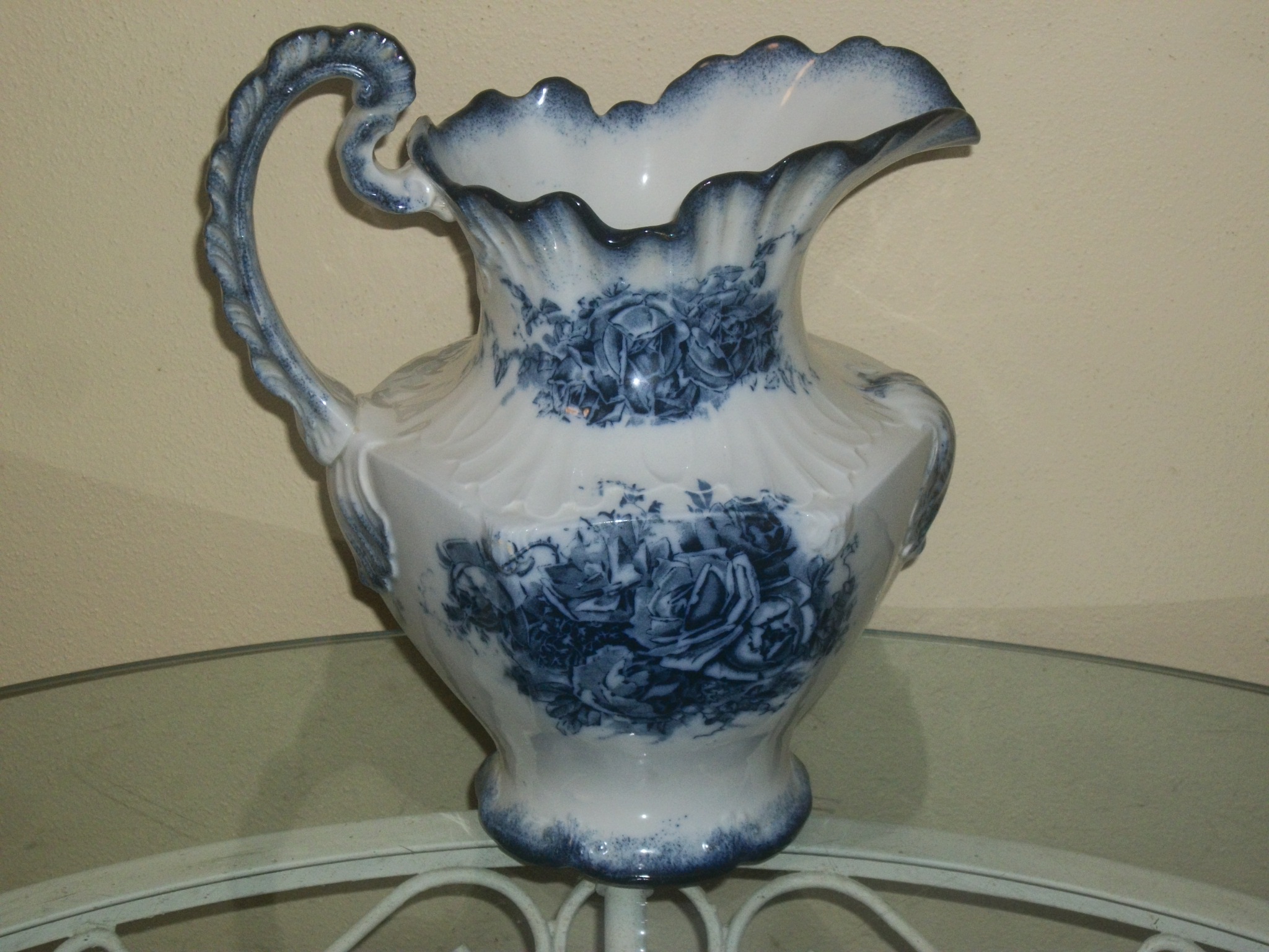 This a water pitcher with a blue rose pattern. The John Maddock & Sons ltd. trade mark dates the pitcher between1896 and 1906. I cannot find any information other than the trade mark date. Under the trade mark is the word ROSES which I believe is the pattern name. Any help on this would be appreciated.