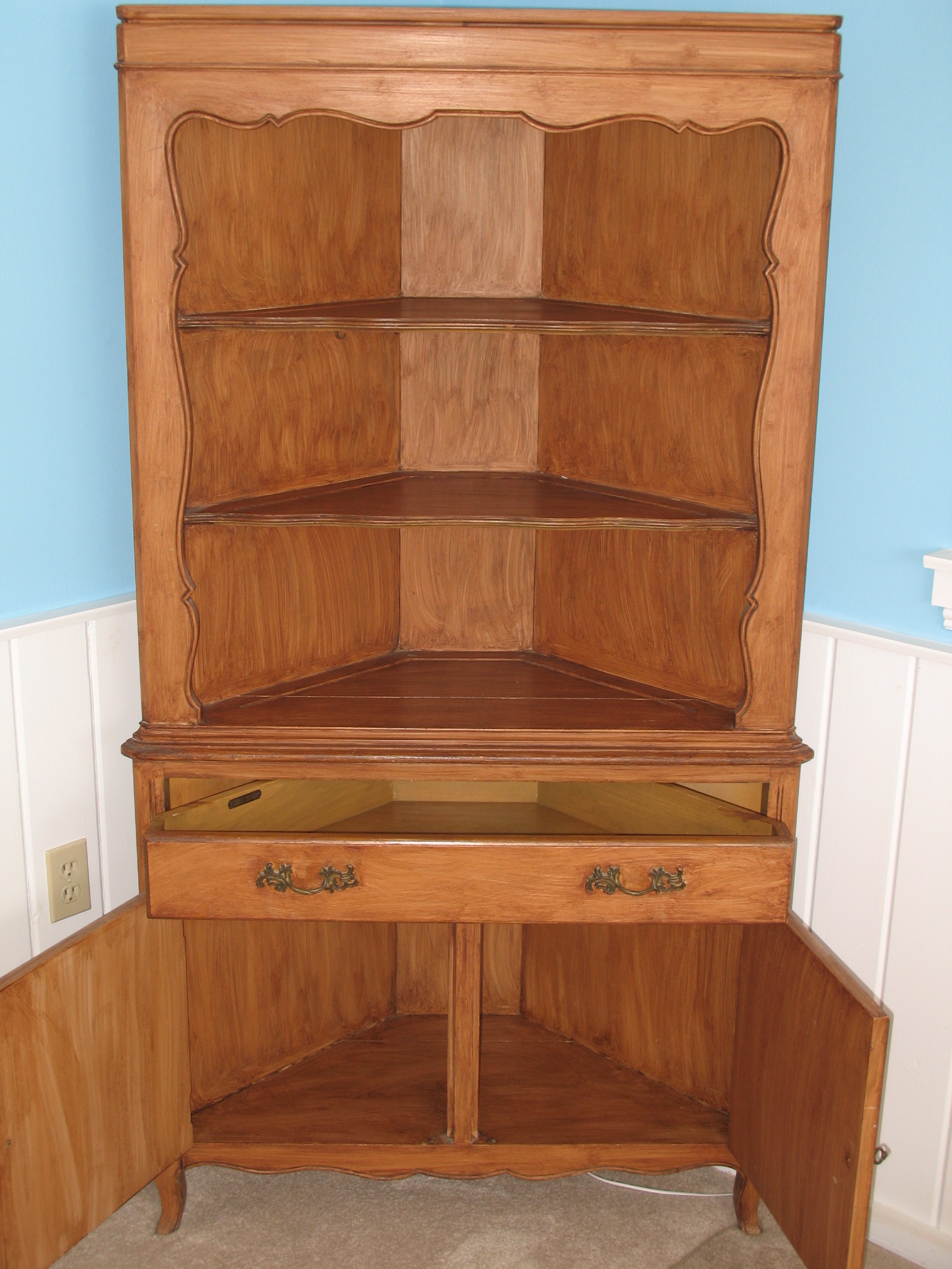 History This corner hutch was given to me by a friend 20 years ago. It was originally natural pine color and refinished with a walnut stain.